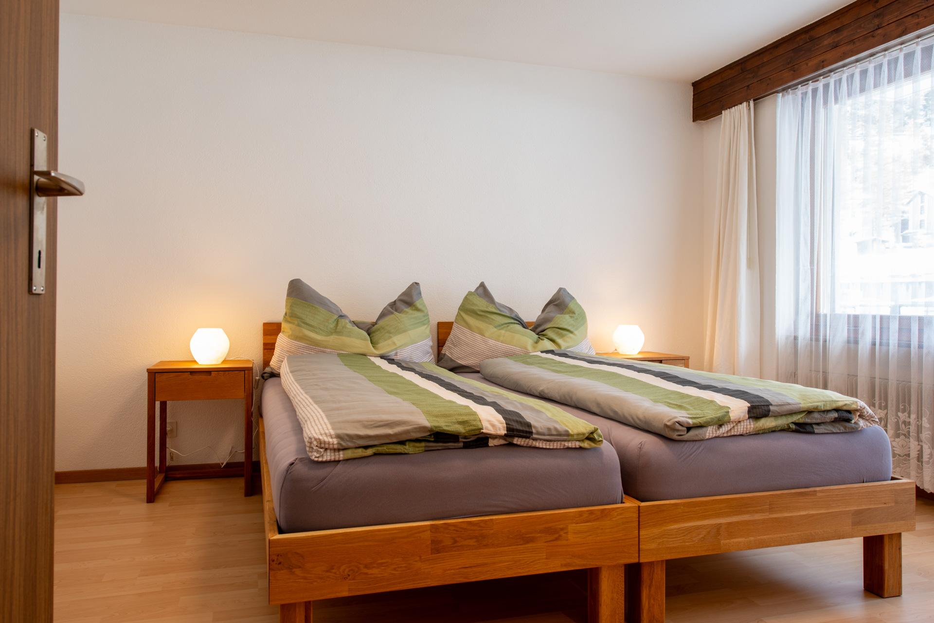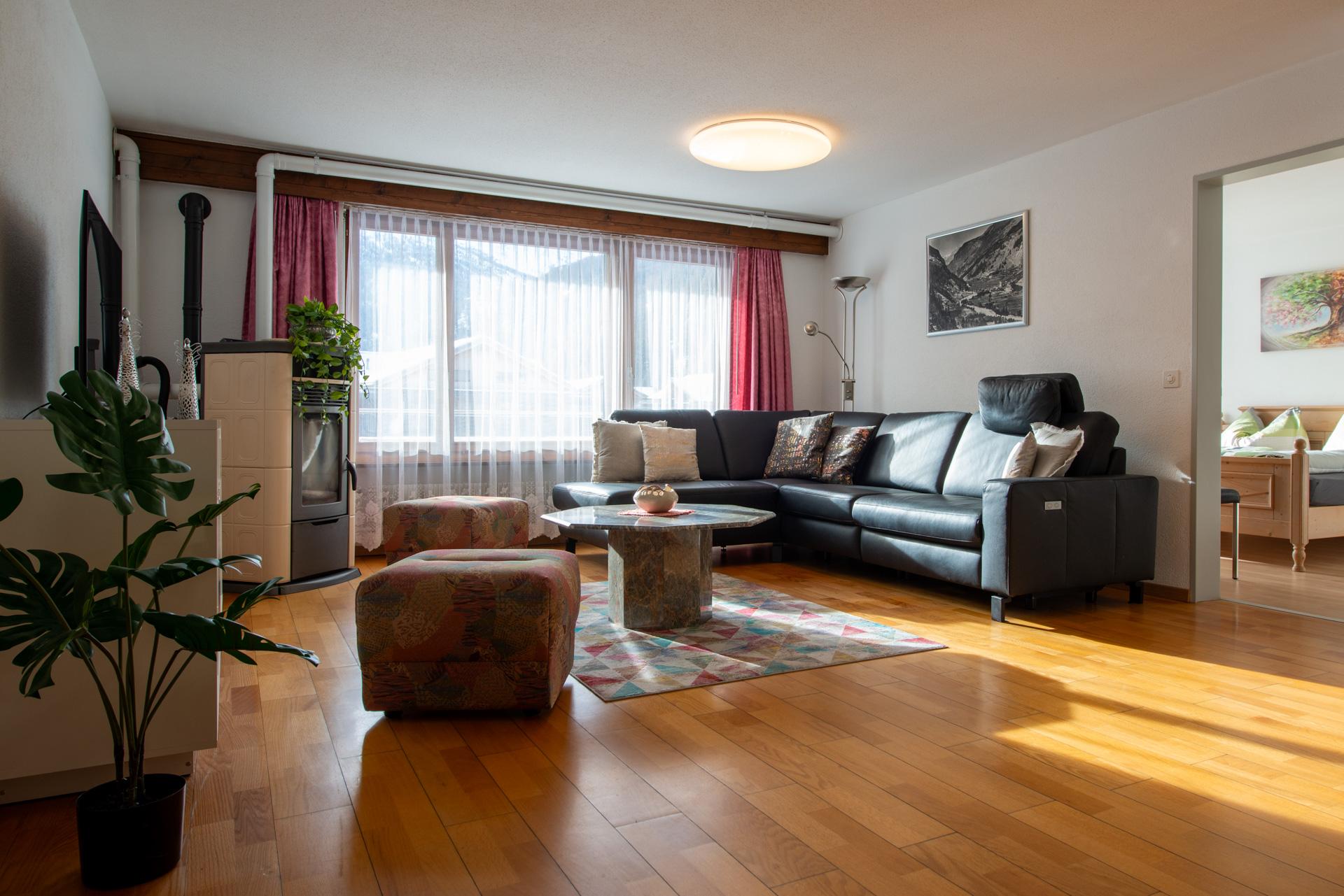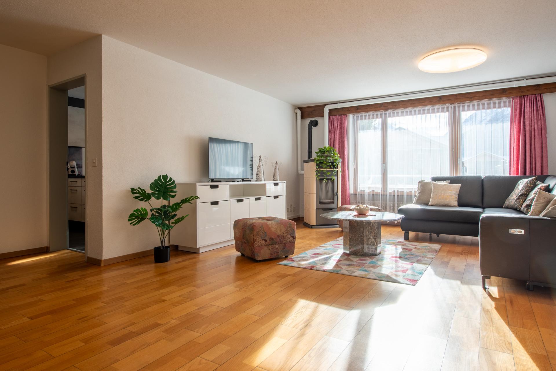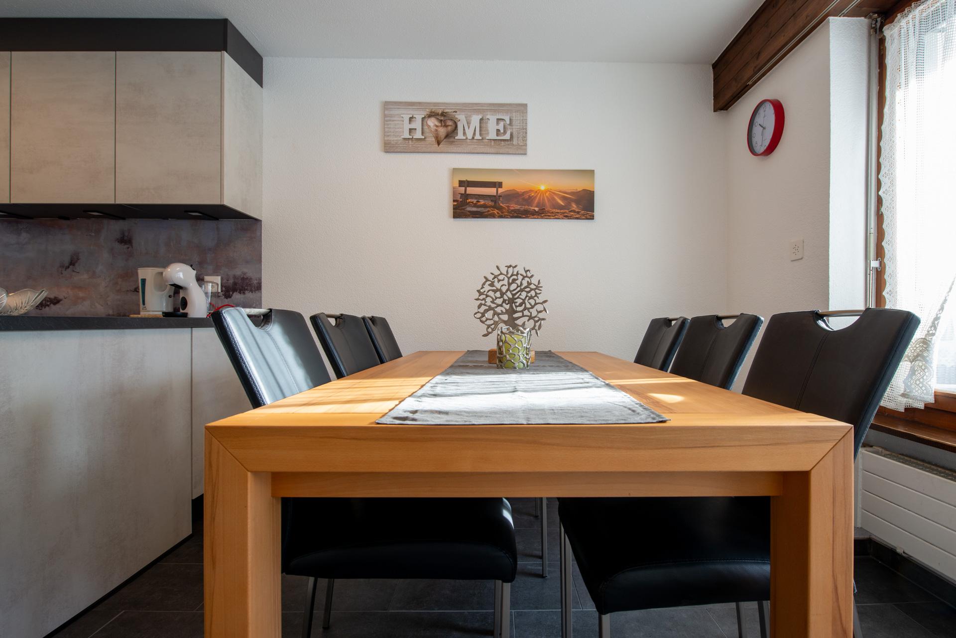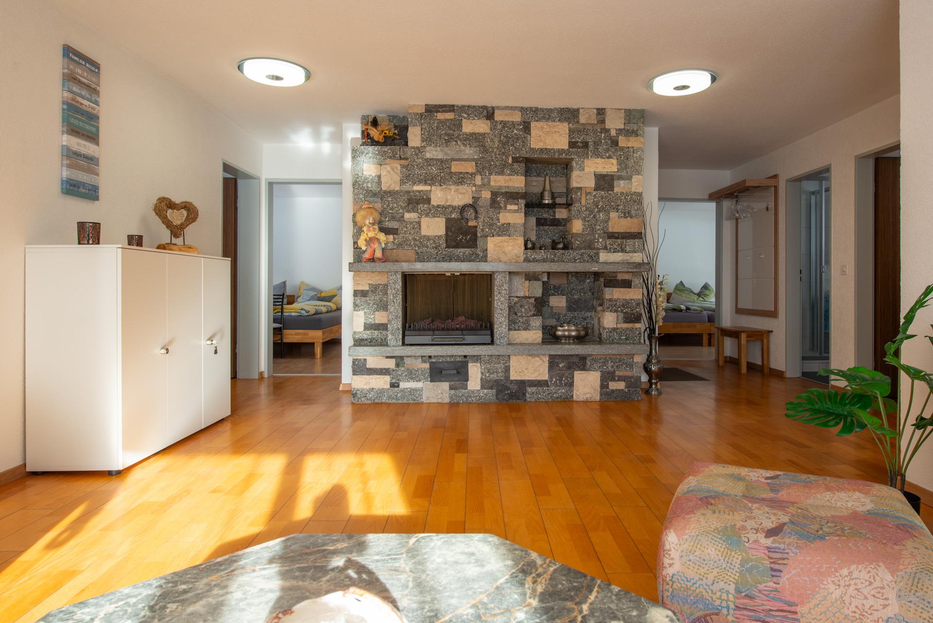 5 1/2 Zimmerwohnung für 1 bis 8 Personen an ruhiger Lage mit Parkplatz, grossem Rasenplatz und 3-seitigem Balkon mit Gartenmöbeln. Die Wohnung liegt im Dachgeschoss und verfügt über eine voll ausgestattete Küche mit Backofen, Herd, Mikrowelle, Geschirrwaschmaschine, Kühlschrank mit Gefrierfach, Filter-Kaffeemaschine und Kaffeemaschine Dolce Gusto, Raclette-Ofen und Fondue-Set.  Sehr grosses Wohnzimmer mit Satelliten-TV. 4 seperate Doppelschlafzimmer: 1 separates Schlafzimmer mit französischem Doppelbett (140x200cm), 2 separate Schlafzimmer mit je einem Doppelbett (200x200cm) und Lavabo, 1 separates Schlafzimmer mit einem Doppelbett (200x200cm). Badezimmer mit Dusche/WC sowie separates WC mit Lavabo.