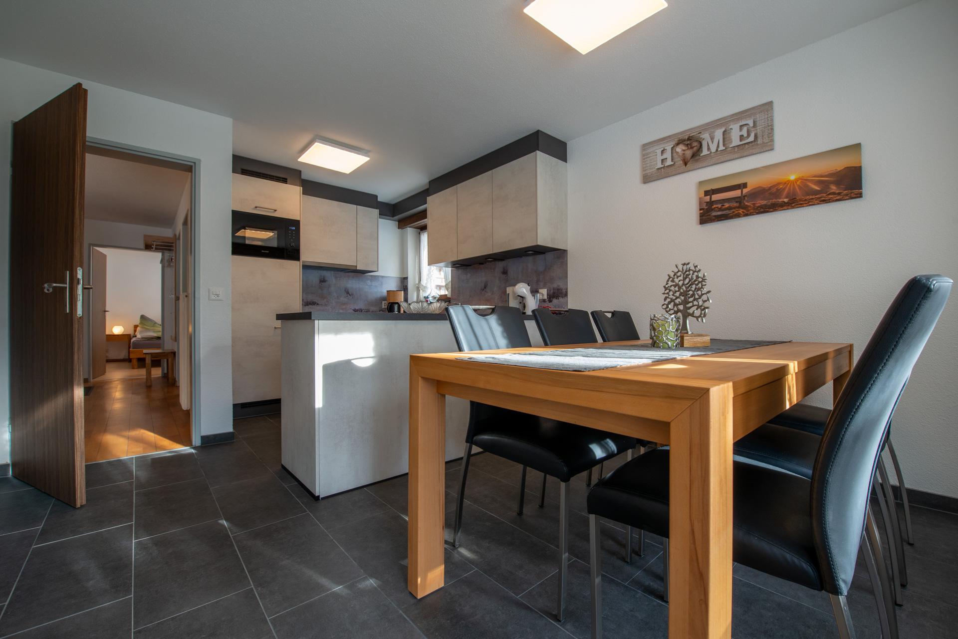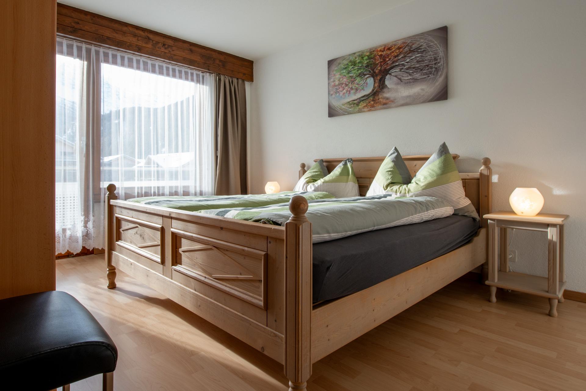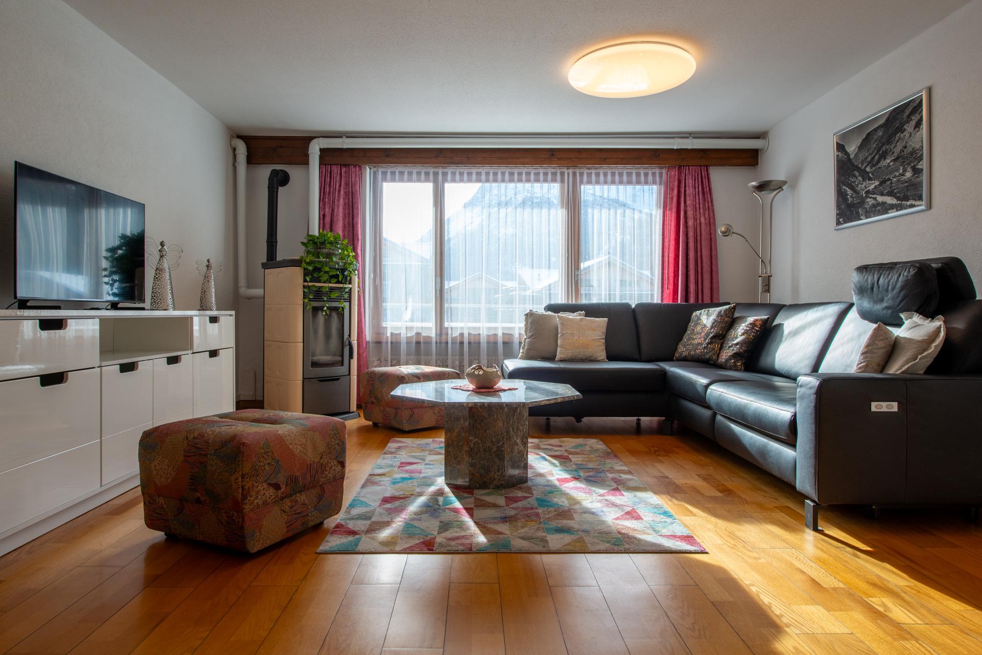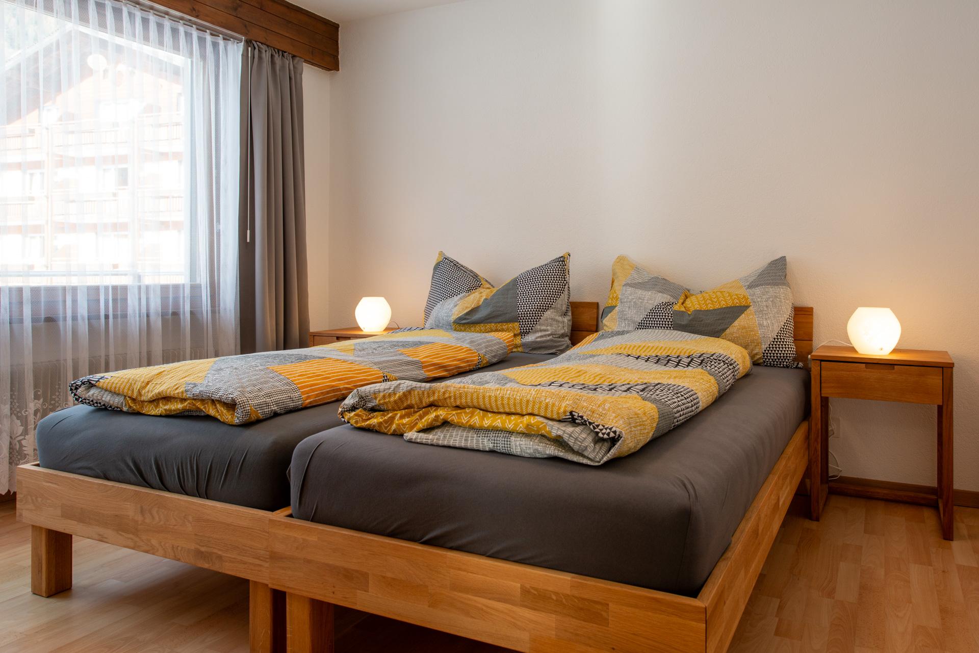 5 1/2 Zimmerwohnung für 1 bis 8 Personen an ruhiger Lage mit Parkplatz, grossem Rasenplatz und 3-seitigem Balkon mit Gartenmöbeln. Die Wohnung liegt im Dachgeschoss und verfügt über eine voll ausgestattete Küche mit Backofen, Herd, Mikrowelle, Geschirrwaschmaschine, Kühlschrank mit Gefrierfach, Filter-Kaffeemaschine und Kaffeemaschine Dolce Gusto, Raclette-Ofen und Fondue-Set.  Sehr grosses Wohnzimmer mit Satelliten-TV. 4 seperate Doppelschlafzimmer: 1 separates Schlafzimmer mit französischem Doppelbett (140x200cm), 2 separate Schlafzimmer mit je einem Doppelbett (200x200cm) und Lavabo, 1 separates Schlafzimmer mit einem Doppelbett (200x200cm). Badezimmer mit Dusche/WC sowie separates WC mit Lavabo.