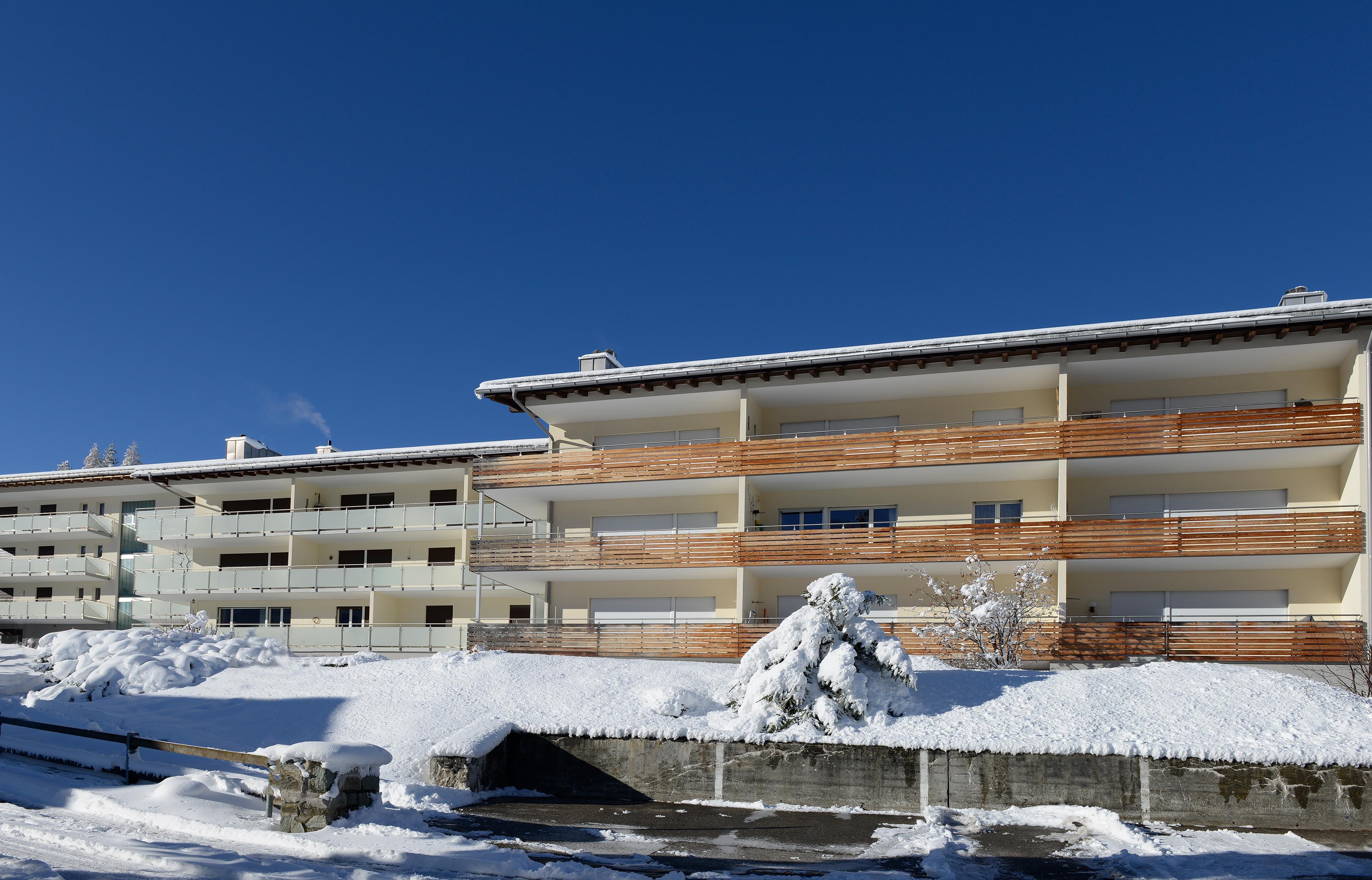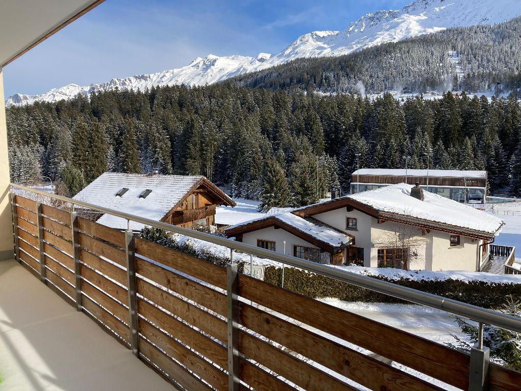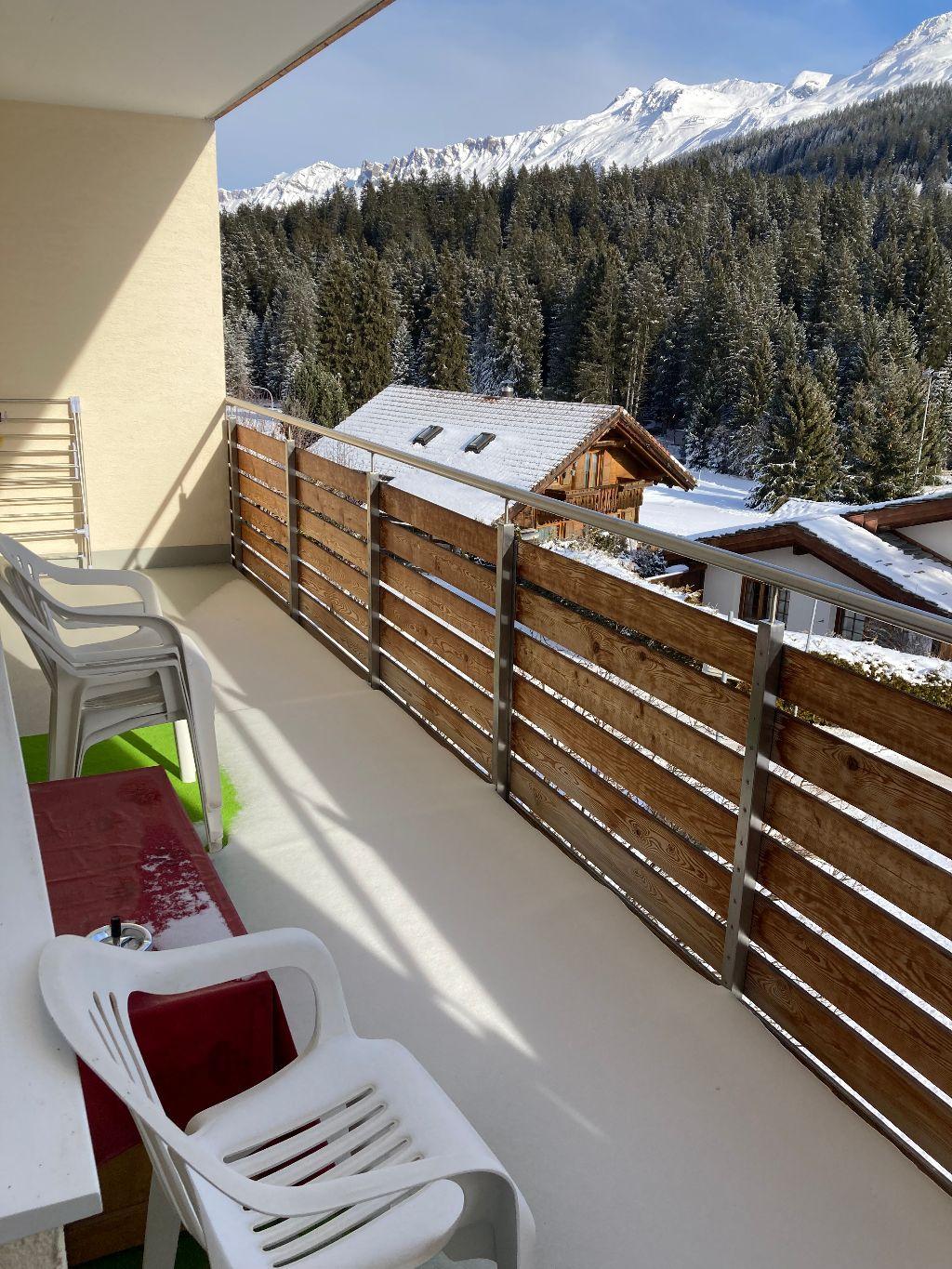 Balkon mit Aussicht Richtung Osten. Volles Bergpanorama auf der Ostseite Richtung Rothorn bis Parpan.