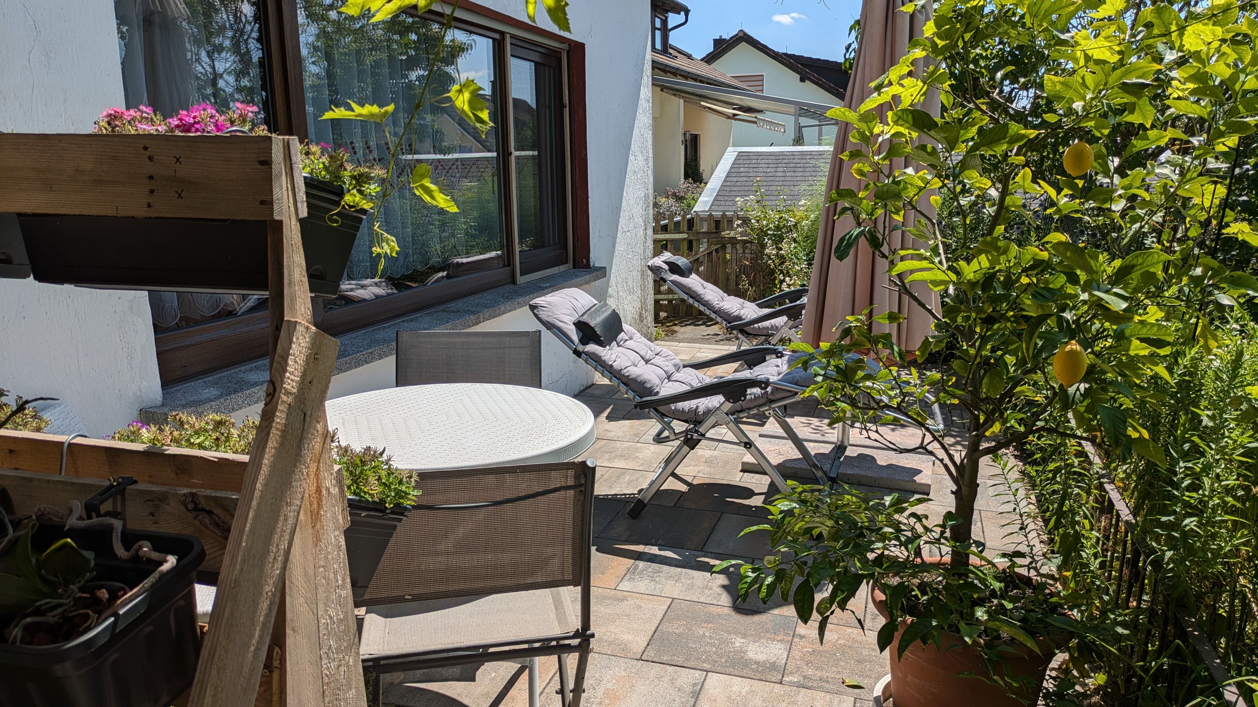 Rechts neben dem Eingangsportal befindet sich die 12 qm große Terrasse mit großem Sonnenschirm und Relax- Liegen. Tisch und Stühle laden zum Frühstücken im Freien ein.