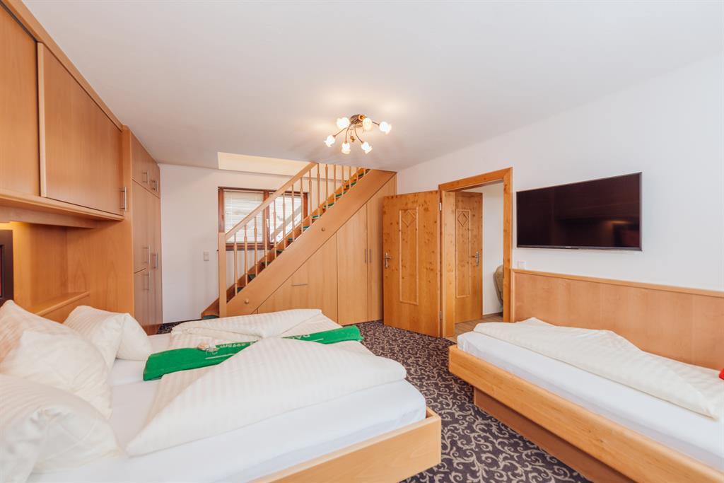 Eine Treppe zur 2. Etage geht seitlich durch das erste Schlafzimmer.