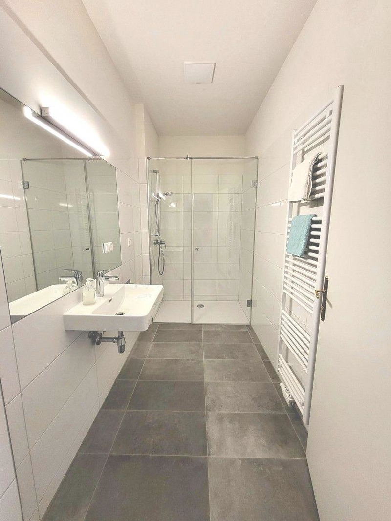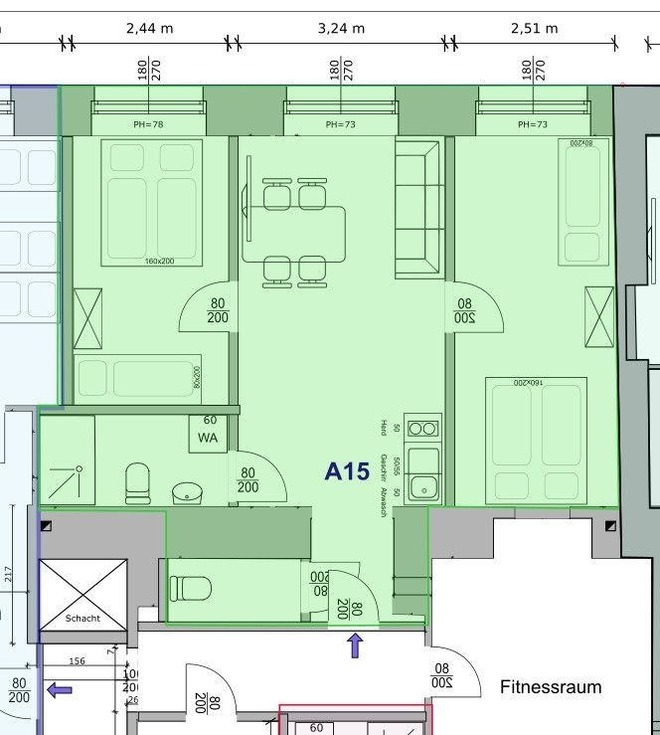 Über das zentrale Wohnzimmer können Sie die beiden Schlafzimmer bequem getrennt und unabhängig begehen. Darüber hinaus bietet das Apartment ein Baezimmer sowie ein separates WC.