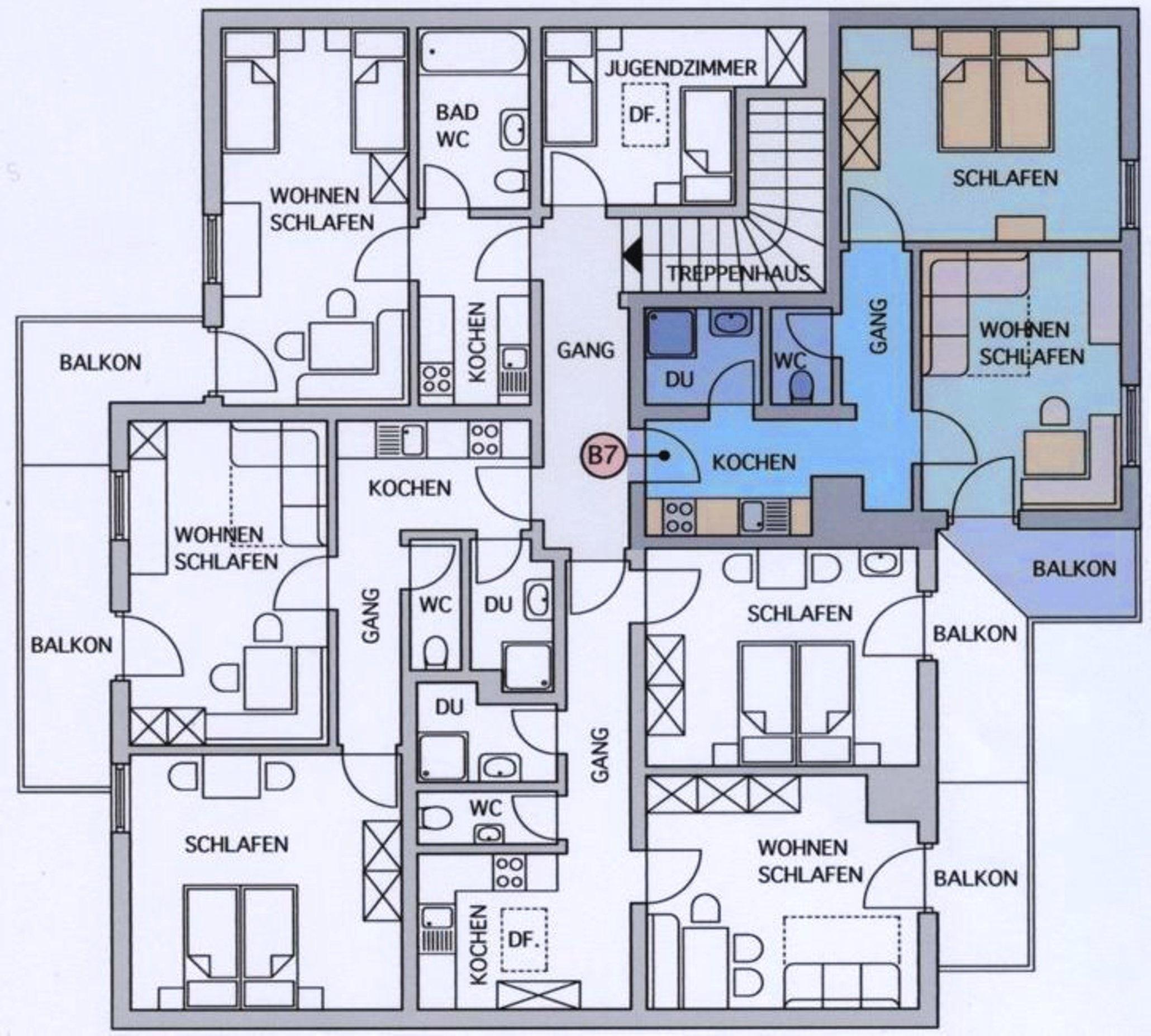Die Grundgröße des Appartements beträgt 50m² plus Jugenzimmer 10m² plus je weiteres Schlafzimmer 16m² und kann von bis zu 9 Personen gebucht werden.