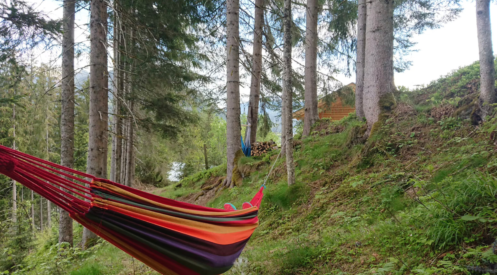 Hängematte und Hängesessel im Wald hinter der Hütte