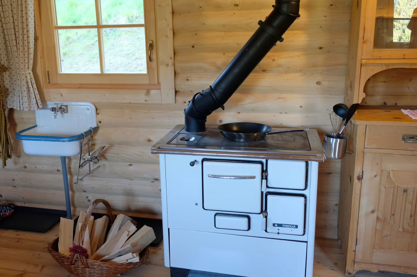 Küche: Holzofen mit Wasserschiff und Gaskühlschrank