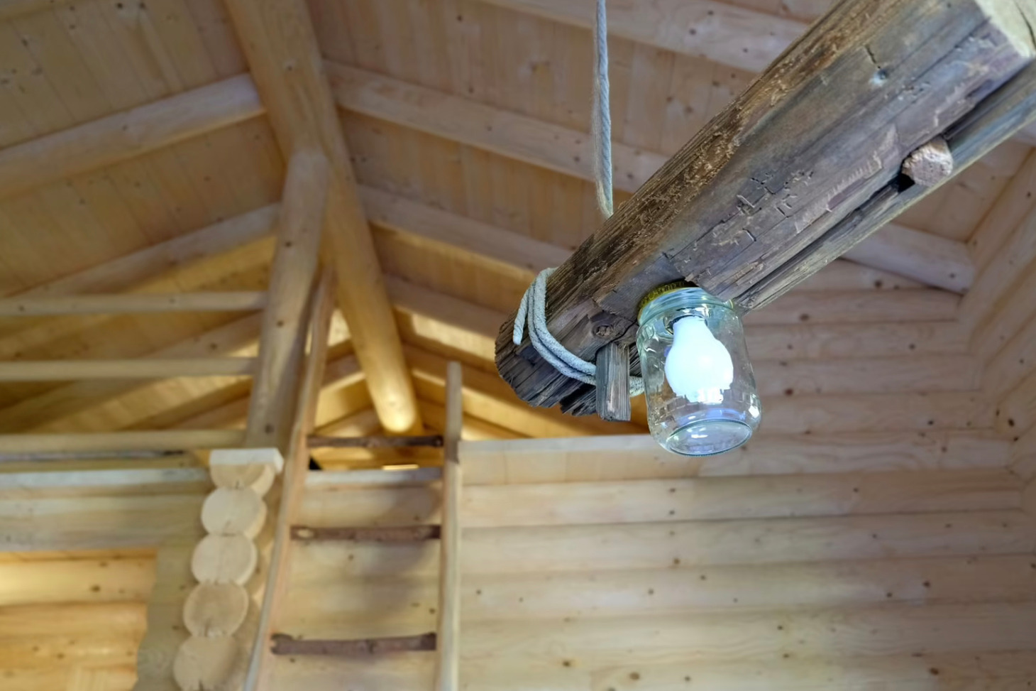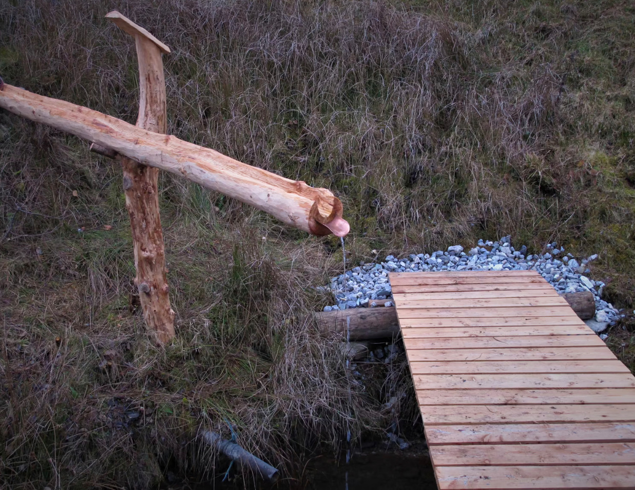 eine Trinkwasserleitung befindet sich hinter der Hütte, auch zum Befüllen der Wasserbehälter in der Wohnstube (30 Liter) und im Badezimmer (25 Liter)