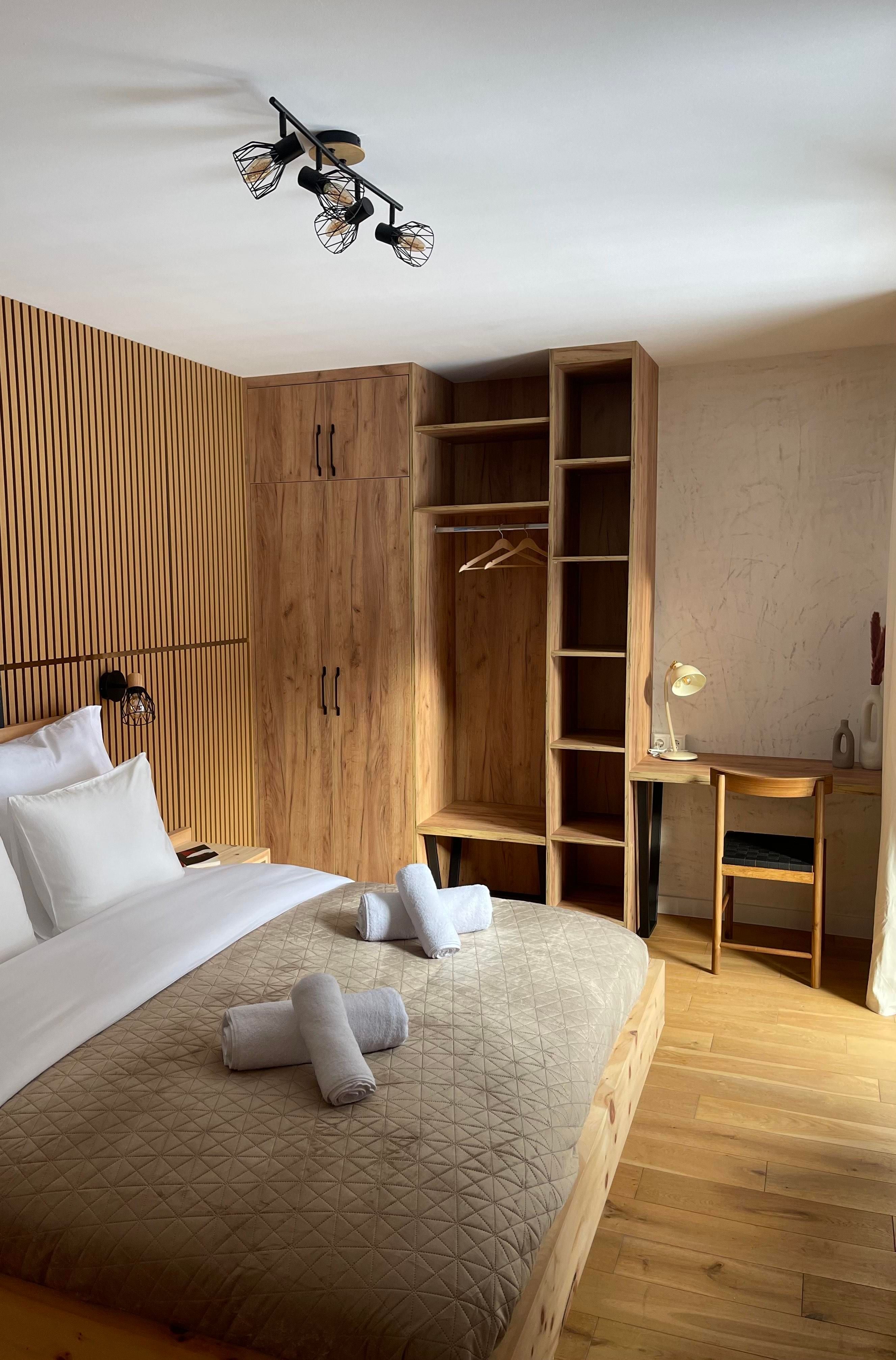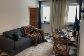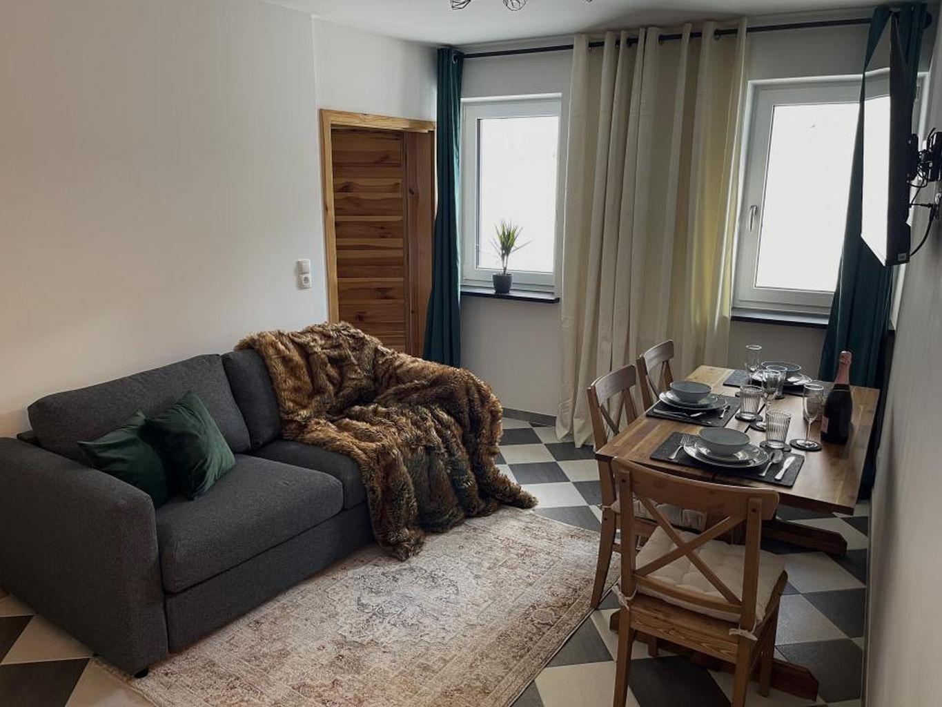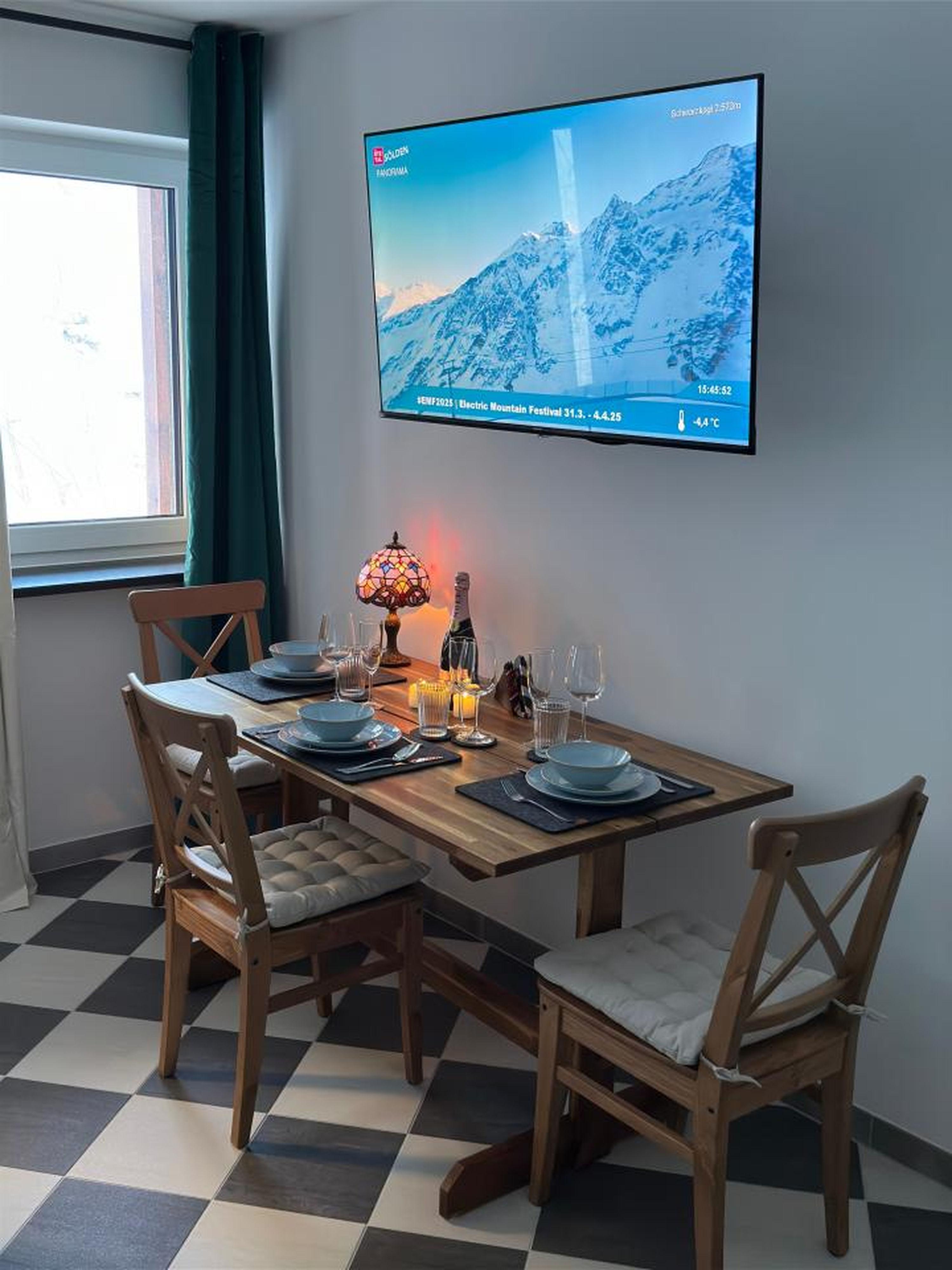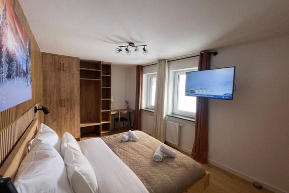 Apartment 2 mit ca. 40 m², eleganten Parkettböden, Balkon, 1 Doppelzimmer mit Zirbenbett das mit seinem natürlichen Holzduft für eine entspannte Atmosphäre sorgt, vollausgestattete Wohnküche mit Smart-TV, Schlafsofa für eine weitere Person und Essbereich, Badezimmer mit Regendusche/WC.