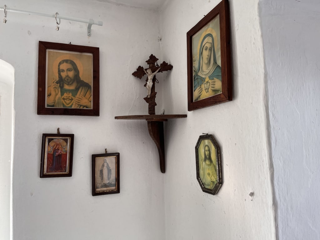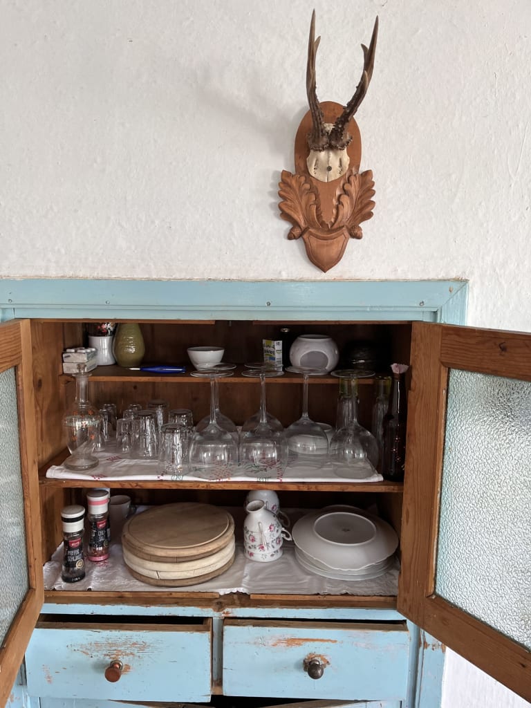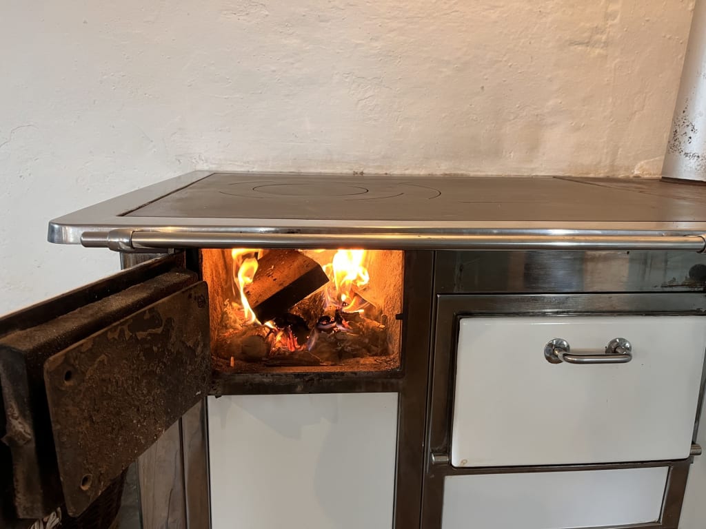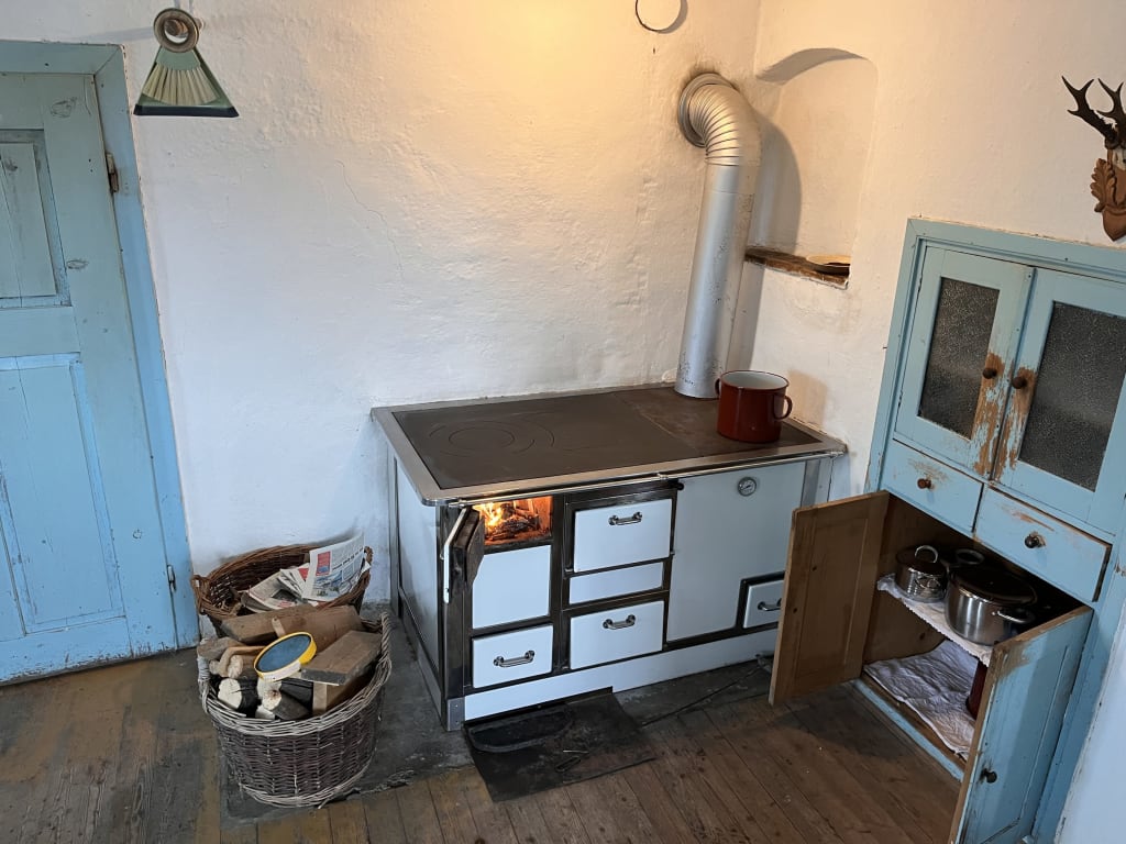• Küche: Holzofen (einzige Heizgelegenheit im Haus), kleine Kochgelegenheit mit 2 Elektrokochplatten, Kaffeemaschine und Wasserkocher, Geschirr und Kochtöpfe vorhanden