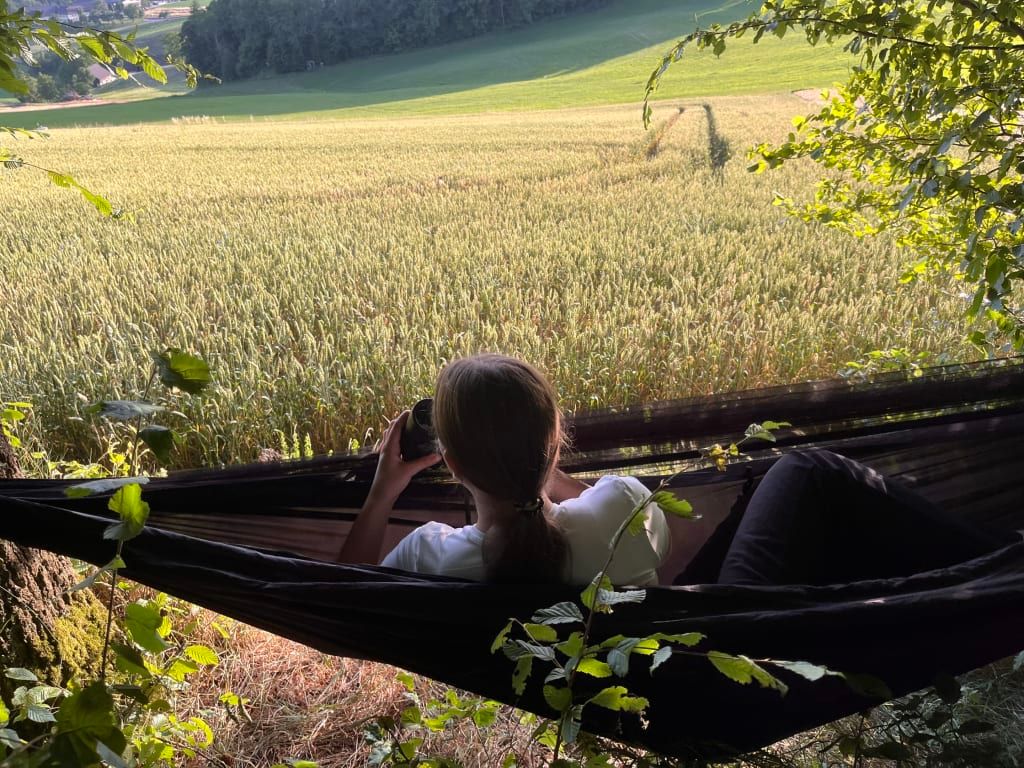 Im Lärchenwäldchen (10 Min. Gehzeit) gibt es zwei Hängematten mit Moskitonetz für eine Übernachtung im Wald.