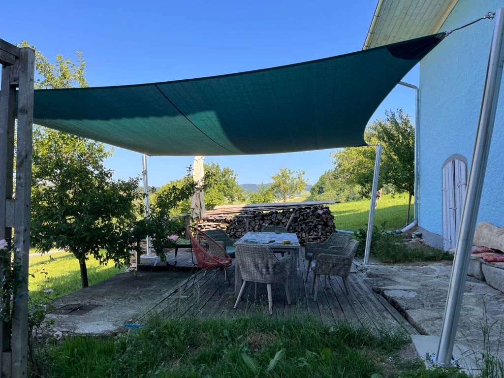 • Terrasse: Holztisch mit sechs Sesseln, große Feuerschale (Kochbuch für Feuerküche vorhanden), Feldbetten (tagsüber als Liegestuhl, nachts Freiluftbett)