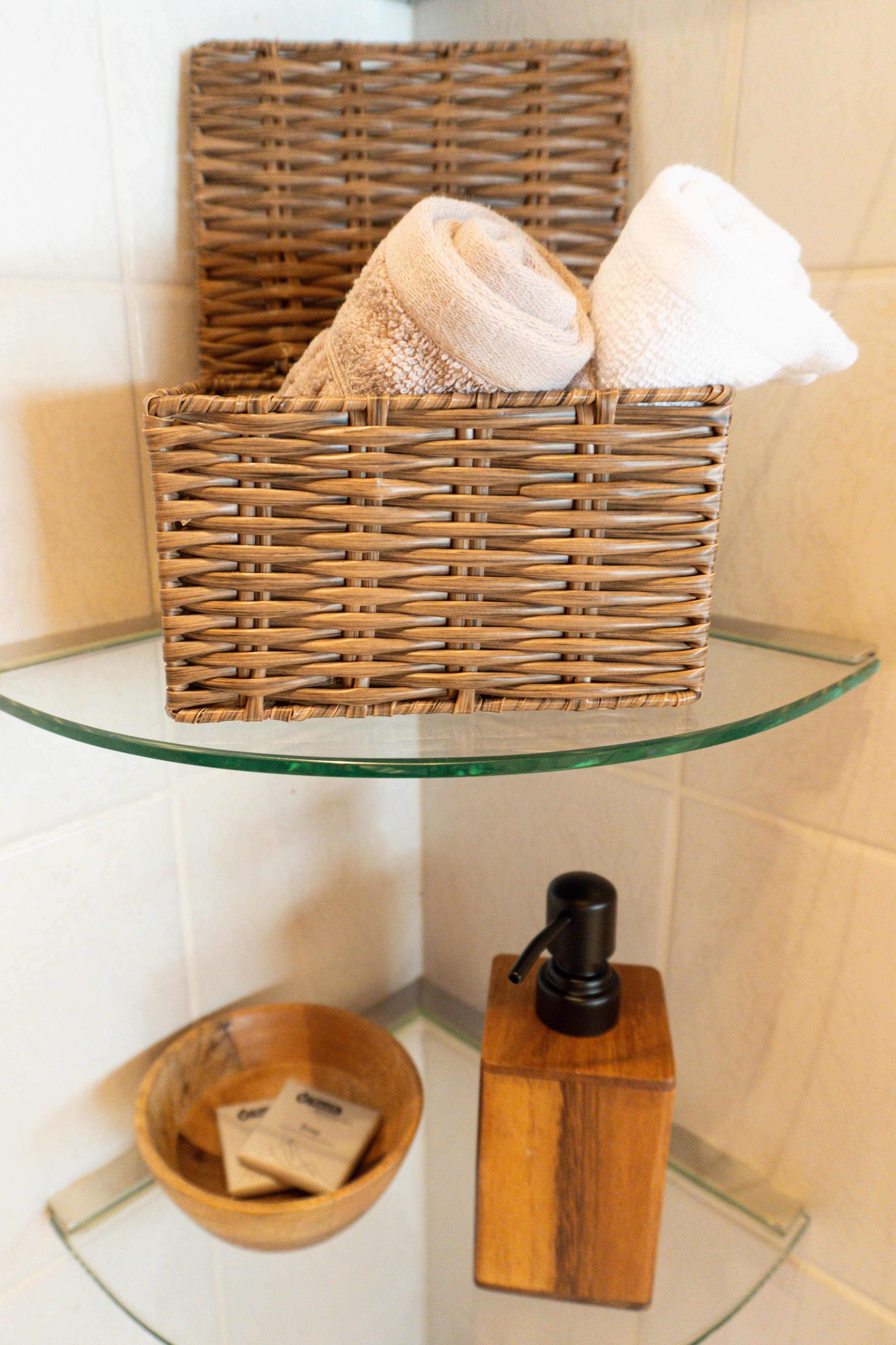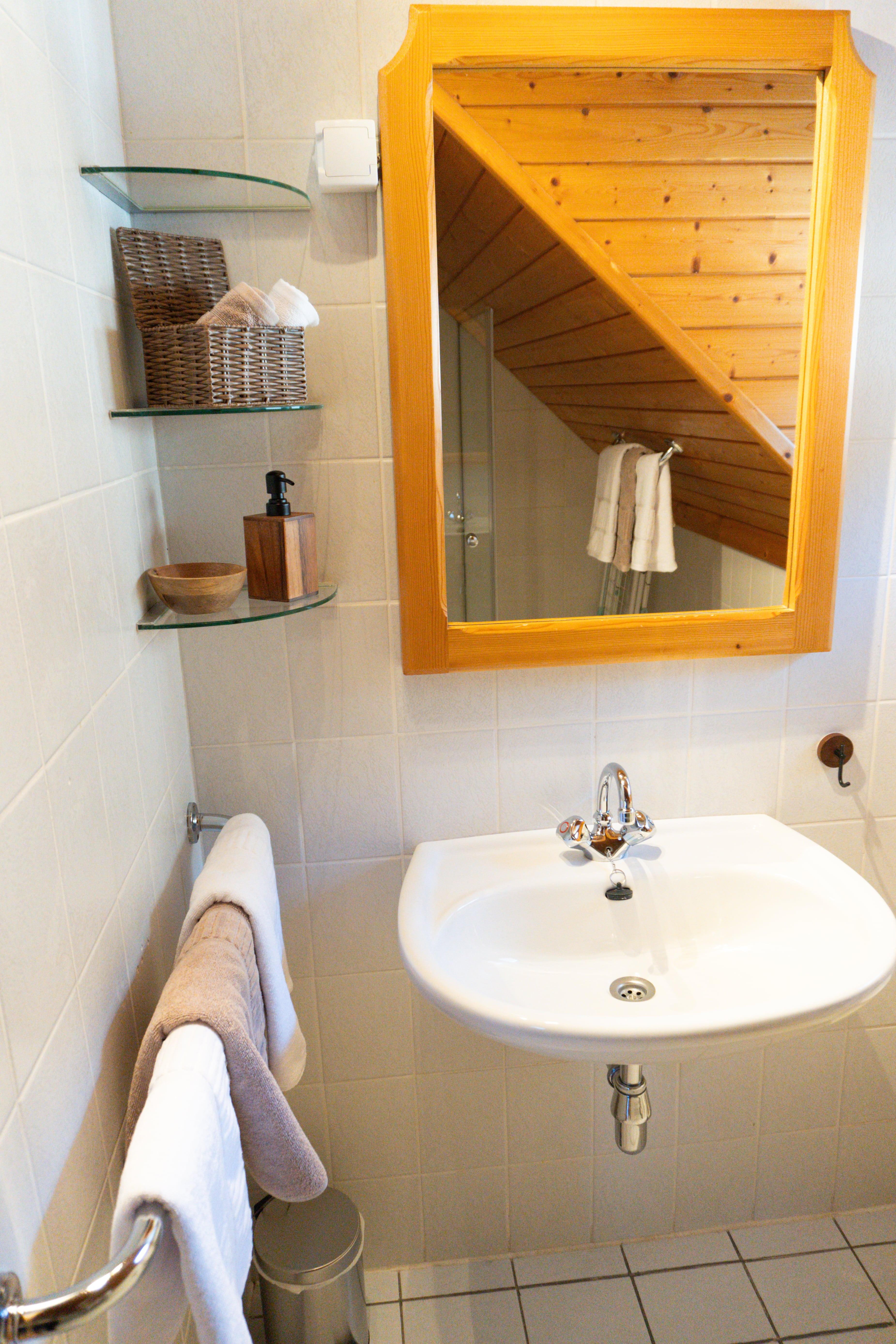 • Badezimmer: Modern und praktisch eingerichtet mit einer Dusche, weichen Bio-Frottierwaren, hochwertiger Mountain Spa-Seife und einem Wäscheständer für Funktionswäsche.