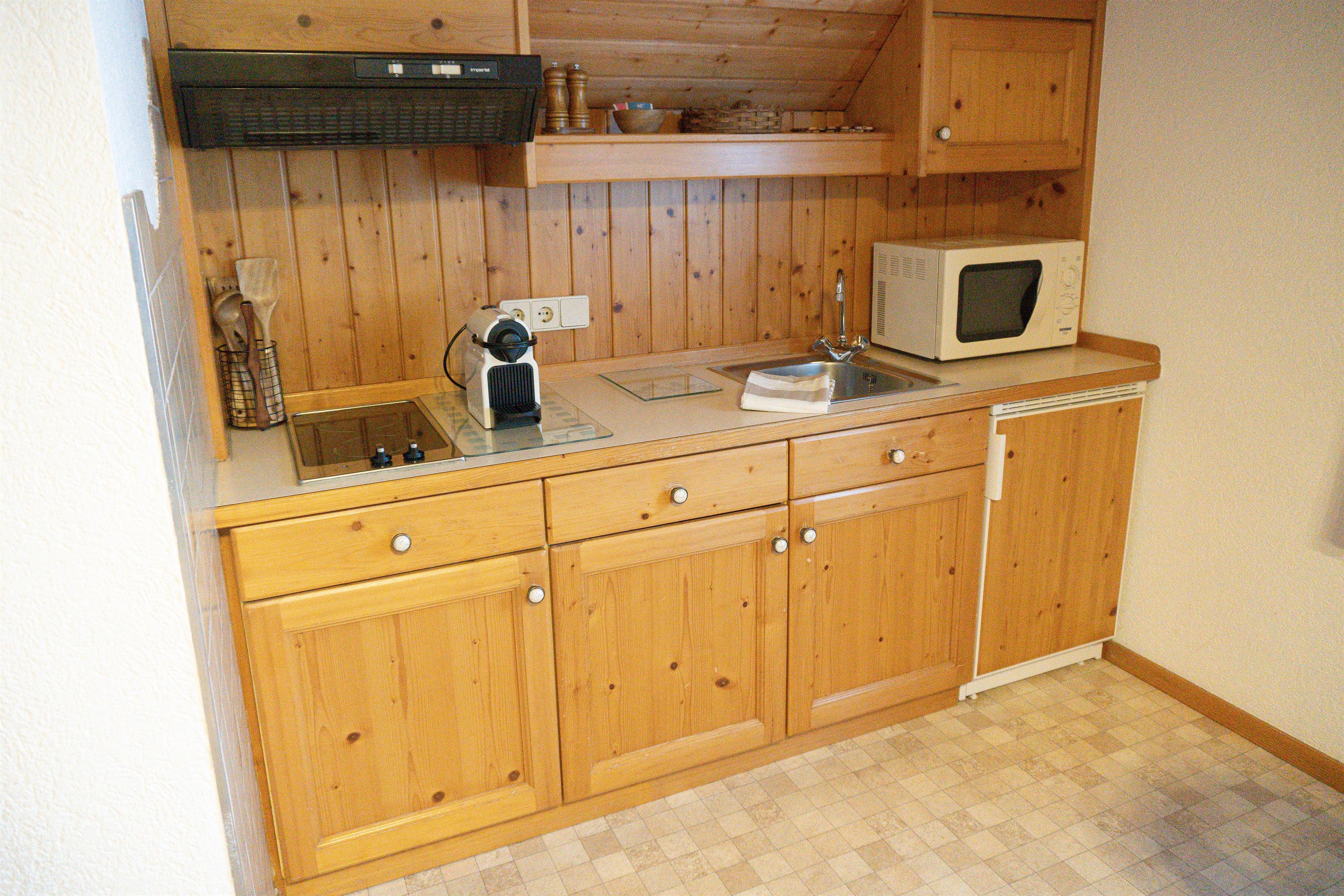 Küche: Vollständig ausgestattet mit Kaffeemaschine, Wasserkocher, Mikrowellengrill und allen notwendigen Küchenutensilien – ideal, um sich nach einem aktiven Tag kulinarisch zu verwöhnen.