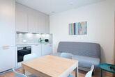 Die offene Küche ist mit den neuesten Geräten und stilvollen Oberflächen ausgestattet, was die Zubereitung von Mahlzeiten zu einem Vergnügen macht. Das Badezimmer bietet eine moderne Dusche und schicke Armaturen für ein frisches, zeitgemäßes Ambiente. Genießen Sie die Außenluft auf dem privaten Balkon, perfekt für den Morgenkaffee oder den Feierabend.