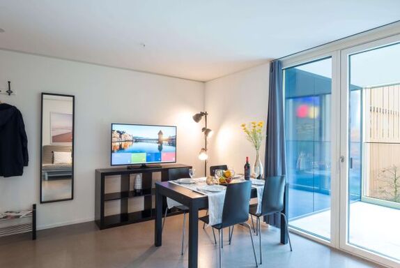 Dieses Business Apartment ist die perfekte Lösung für alle Geschäftsreisenden, die in Luzern eine temporäre Bleibe suchen. Das Business Apartment bietet auf 43m2 den höchsten Wohnkomfort an. In einem geräumigen Schlafzimmer finden Sie ein Einzelbett und ein Doppelbett vor. Zudem steht im Wohnzimmer ein Schlafsofa für zwei Personen zur Verfügung. In der eigenen Küchenecke, welche alle notwendigen Küchenutensilien bietet, können Sie abends selbst kochen. Das Badezimmer ist ausgestattet mit einer Dusche, Badetüchern, Haartrockner sowie Hygieneartikeln. Auf der apartmenteigenen Terrasse können Sie am Abend entspannen und den Tag gemütlich ausklingen lassen.