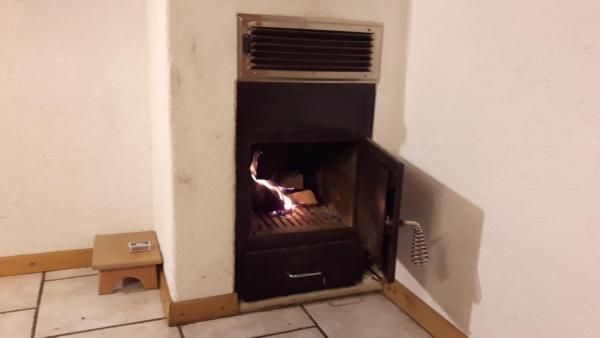 Im Inneren erwarten Sie ein gemütliches Wohnzimmer mit einem Sitzofen aus Kacheln und Sandstein, der für eine angenehme Wärme sorgt. Die Wohnzimmerausstattung umfasst außerdem eine moderne Anlage mit Bluetooth, USB, DAB und CD. In der Küche finden sich eine Filterkaffeemaschine, ein Kühlschrank mit Tiefkühlfach und eine Espressomaschine für Kapseln unterschiedlicher Marken vor. Das Schlafzimmer bietet einen Holzschrank mit Ablagen, Nachttischlampen, zwei Kommoden sowie ein Doppelbett, das zu zwei Einzelbetten umgestellt werden kann.