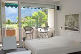 Das sonnige 1.5 Zimmer-Appartement befindet sich im Hochparterre einer gepflegte Residenz direkt am Lago Maggiore. Ruhig gelegen verfügt sie über eine tolle Sicht in die mediterrane Gartenanlage und auf den See. Die Wohnung eignet sich besonders für einen entspannten Urlaub zu zweit. Der Wohnraum mit harmonischem Holzboden bietet eine breite Fensterfront und ist mit einem Doppelbett, einem Esstisch mit vier Stühlen und einem Sofa ausgestattet, das bei Bedarf zu einem komfortablen Bett verwandelt werden kann. Ein grosser Schrank, Kommode und Flachbildschirm runden das Angebot ab. Die separate Küche ist neu renoviert. Badezimmer mit Wanne und Duschvorrichtung, WC. Geniessen Sie laue Abende auf dem möblierten, überdachten Balkon mit faszinierenden Stimmungsbildern. Das Hallenbad und der Sauna der Anlage können mitbenützt werden. Ebenso steht ein Parkplatz in der Tiefgarage zur Verfügung.