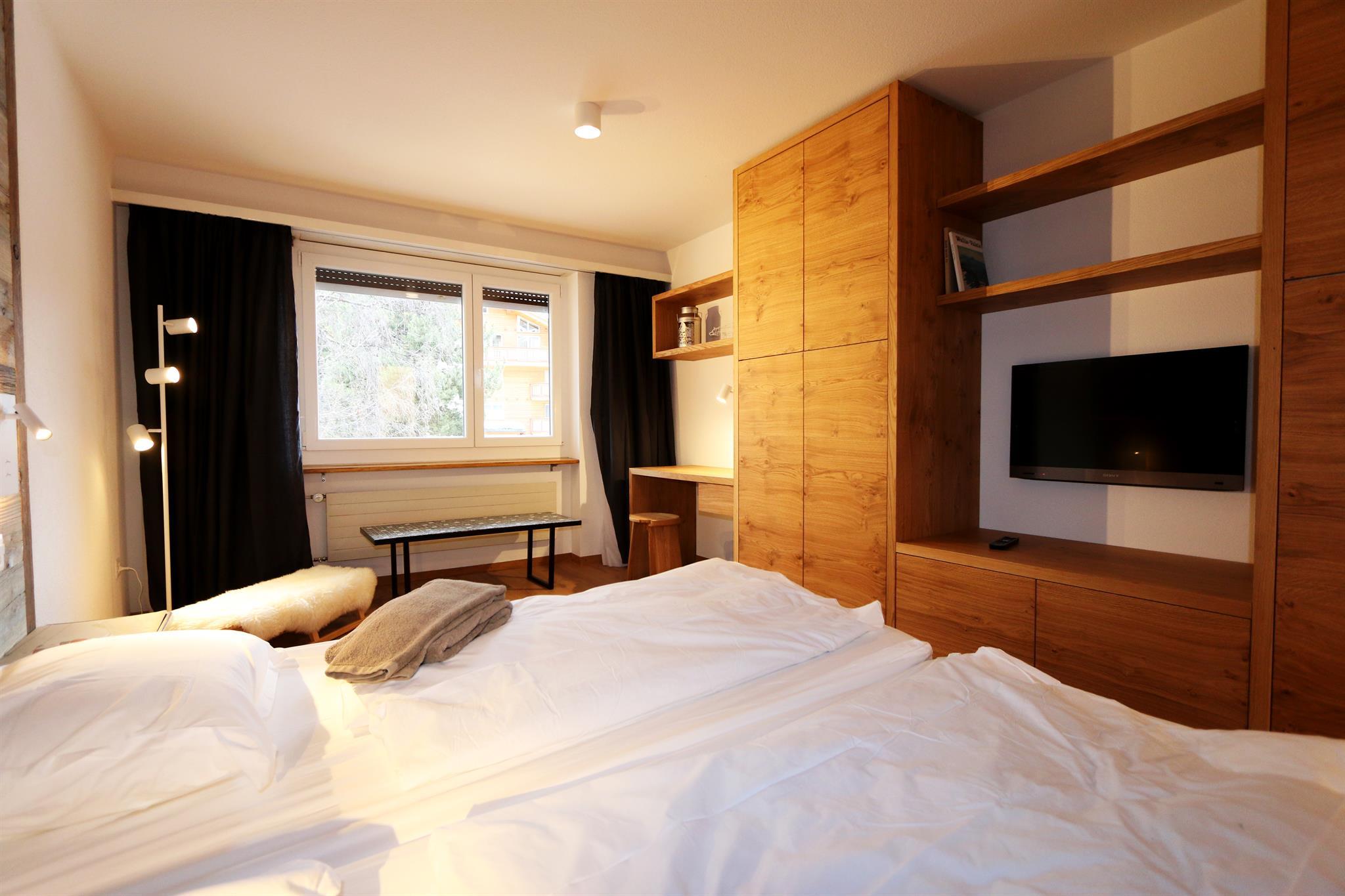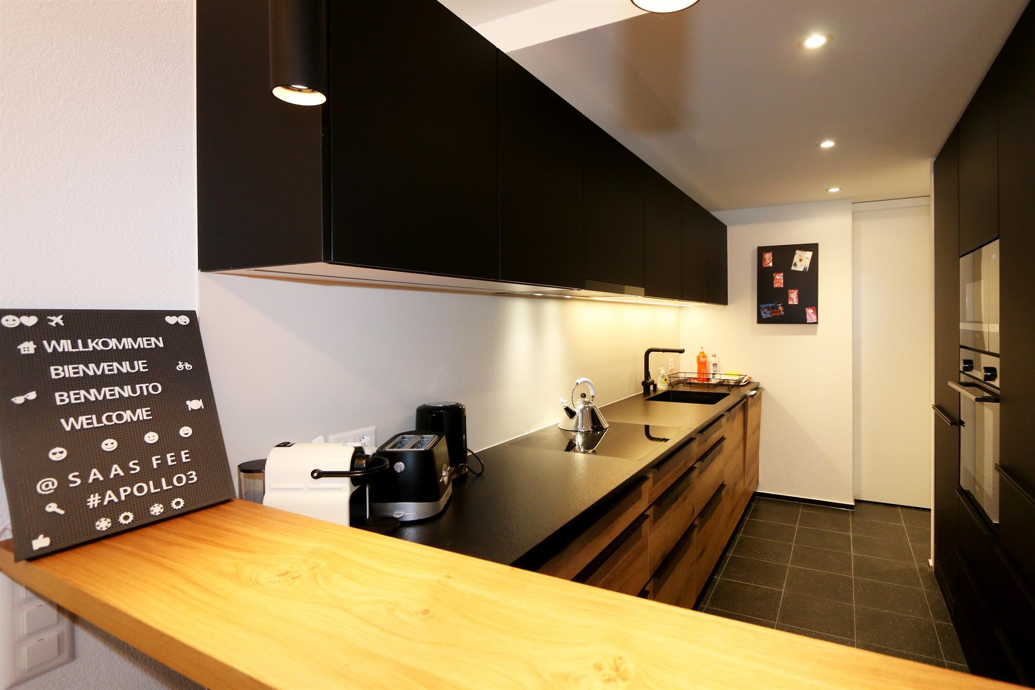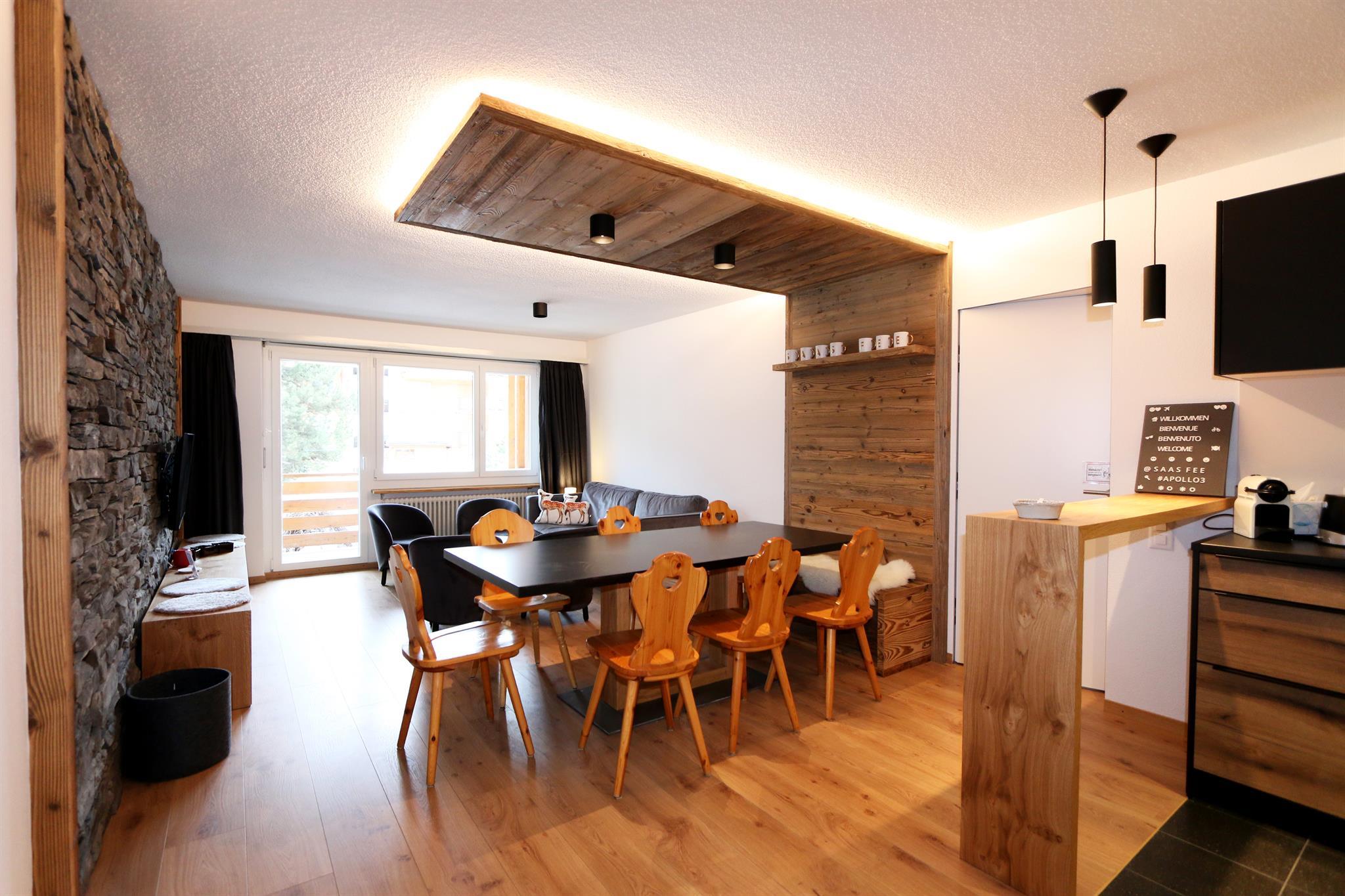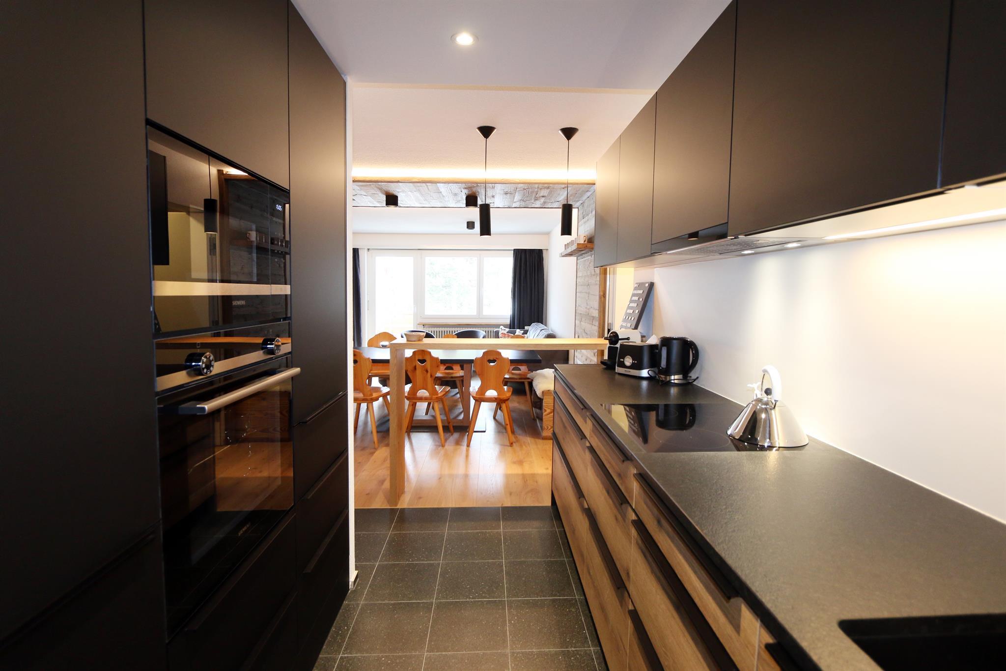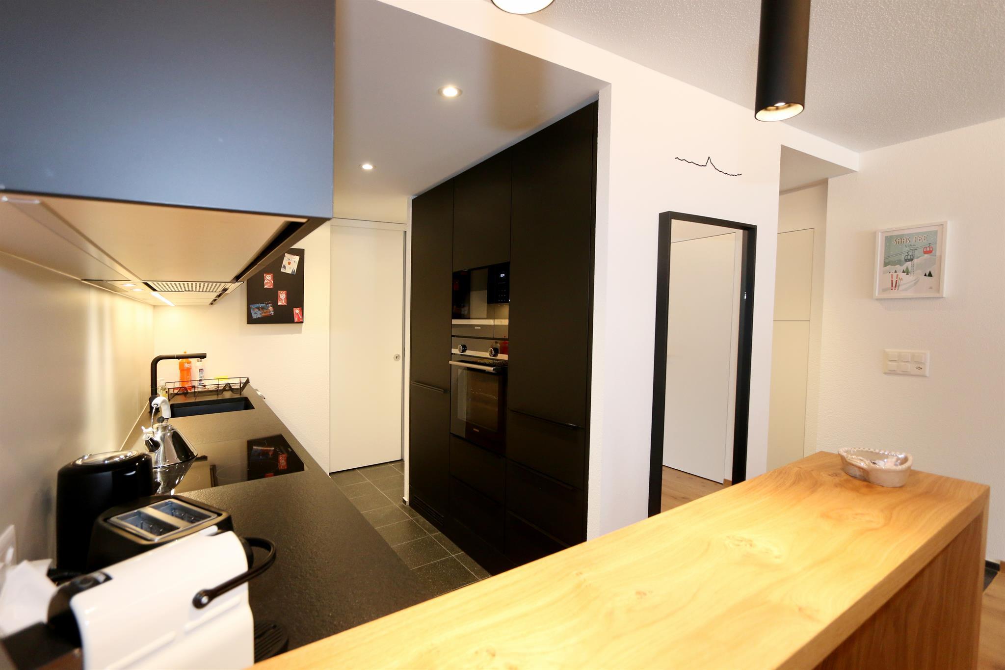 Die Wohnung hat einen offenen Wohn-Ess-Kochbereich mit einem Wohnzimmer im alpinen Stil, das mit einem Flachbild-TV ausgestattet ist. Die brandneue Küche ist komplett ausgestattet mit Geschirrspüler, Mikrowelle, Backofen, Induktionsherd, Nespresso-Maschine, Toaster, Wasserkocher, Käsefondue-Set und Raclette-Ofen. Wifi ist ebenfalls vorhanden.