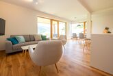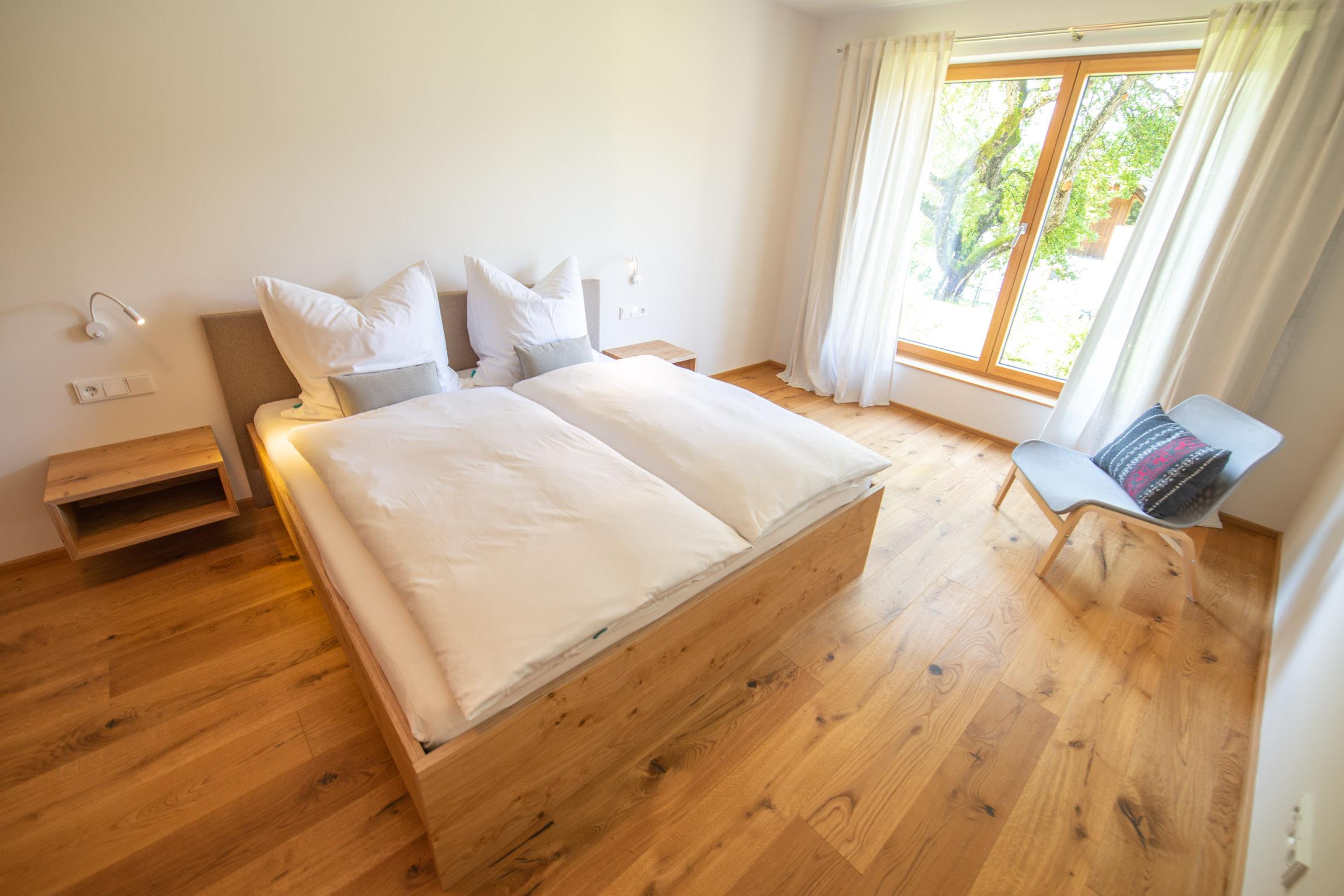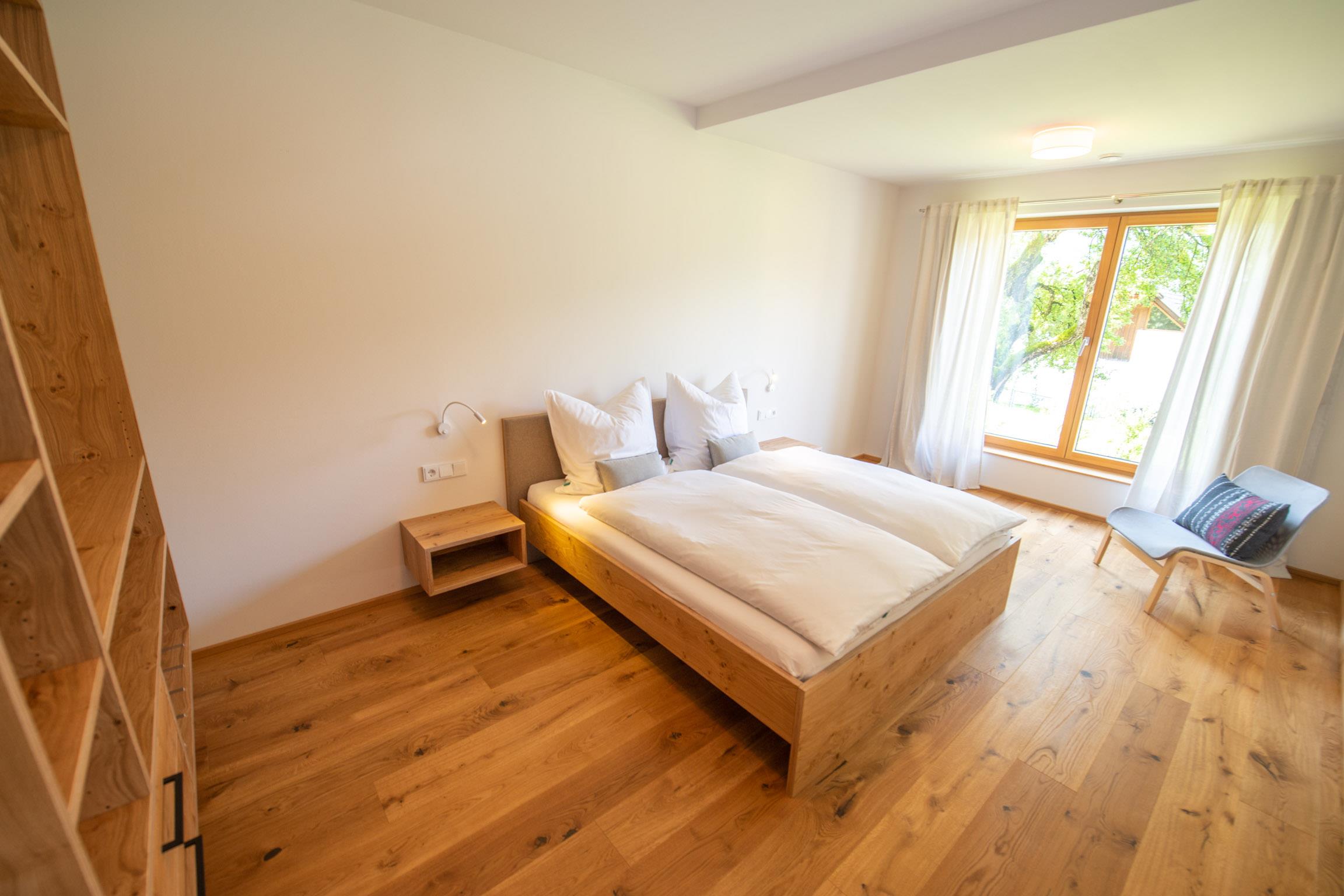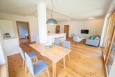 Neubau Ferienwohnung für 2-4 Personen, zwei Schlafzimmer (Doppelbett und 2x Einzelbett), Wohn-Esszimmer mit Küche. Ein Badezimmer mit Dusche und WC, zusätzlich separates WC. Überdachte Terrasse mit Blick zum See. Voll ausgestattete Küche mit Geschirrspühler, Backofen, Kochfeld, Kühl-Gefrierkombination. In der Nebensaison sind in dieser Wohnung auf Anfrage Hunde erlaubt. Pauschale Gebühr beträgt Eur 100,-.