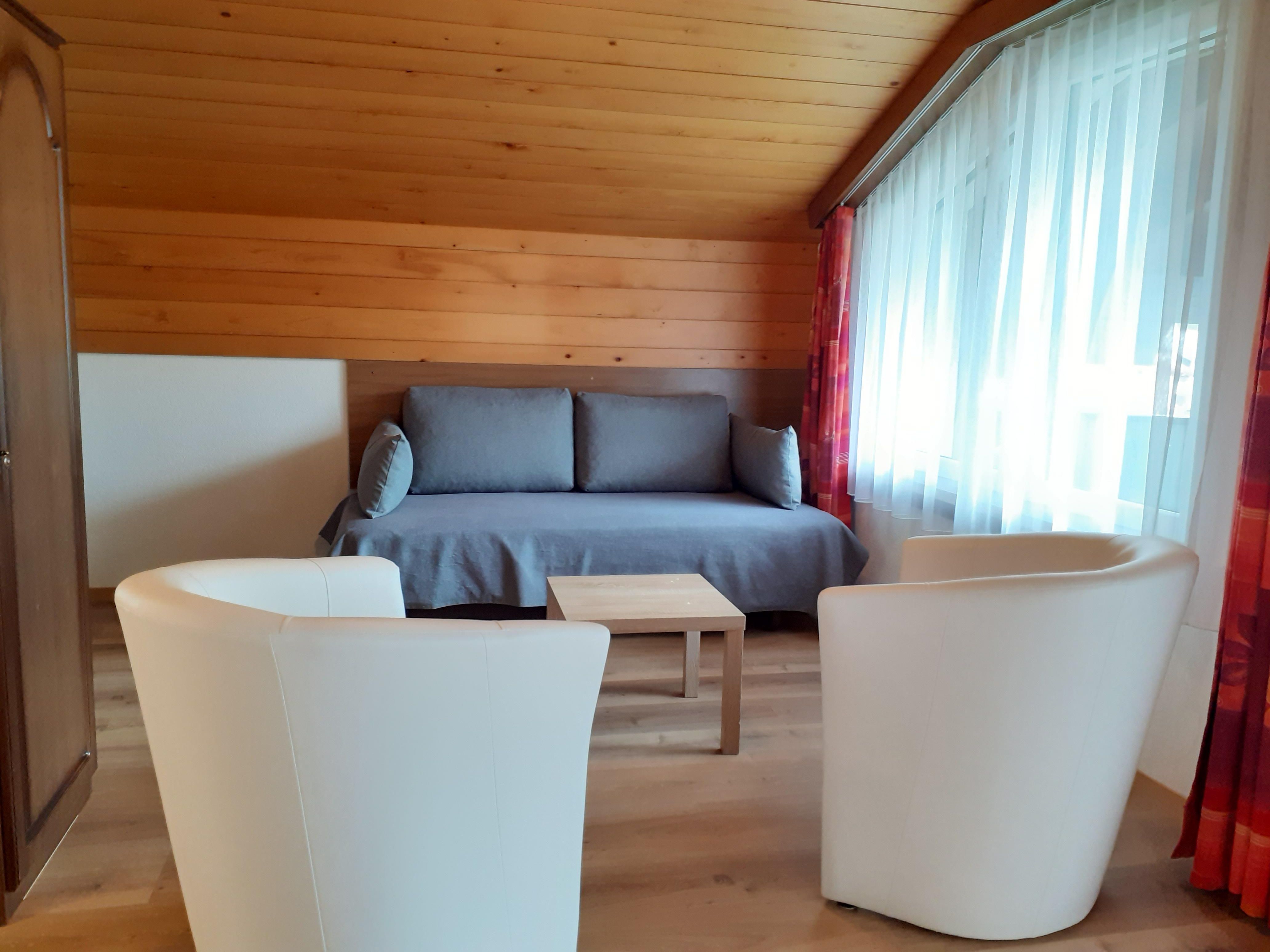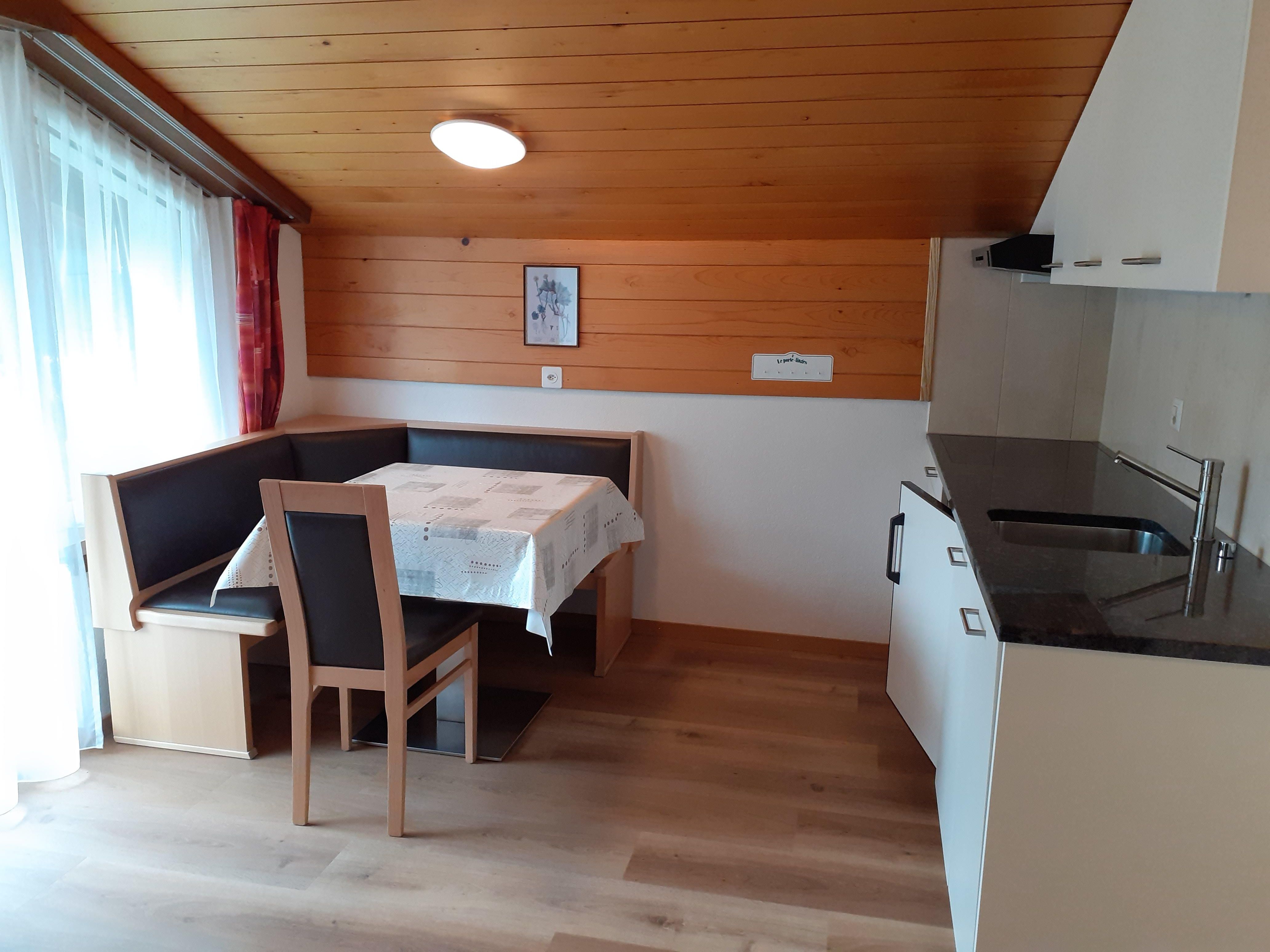 Sehr schöne 2.5-Zimmerwohnung (40 m2), Dachwohnung, 1 Doppelschlafzimmer, 1 Wohn-Schlafzimmer mit 1 Bett, Flachbildschirm mit Kabel-TV, Radio, gratis WLAN, modernes Badezimmer mit Dusche/WC und freiem Blick zu den Sternen, Haartrockner, offene Küche mit Geschirrspüler, Keramik Kochherd, Kühlschrank mit Gefrierfach, Wasserkocher, Essecke, Süd-Balkon mit freier Aussicht auf die Bergwelt und Gletscher.
