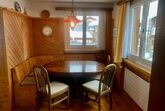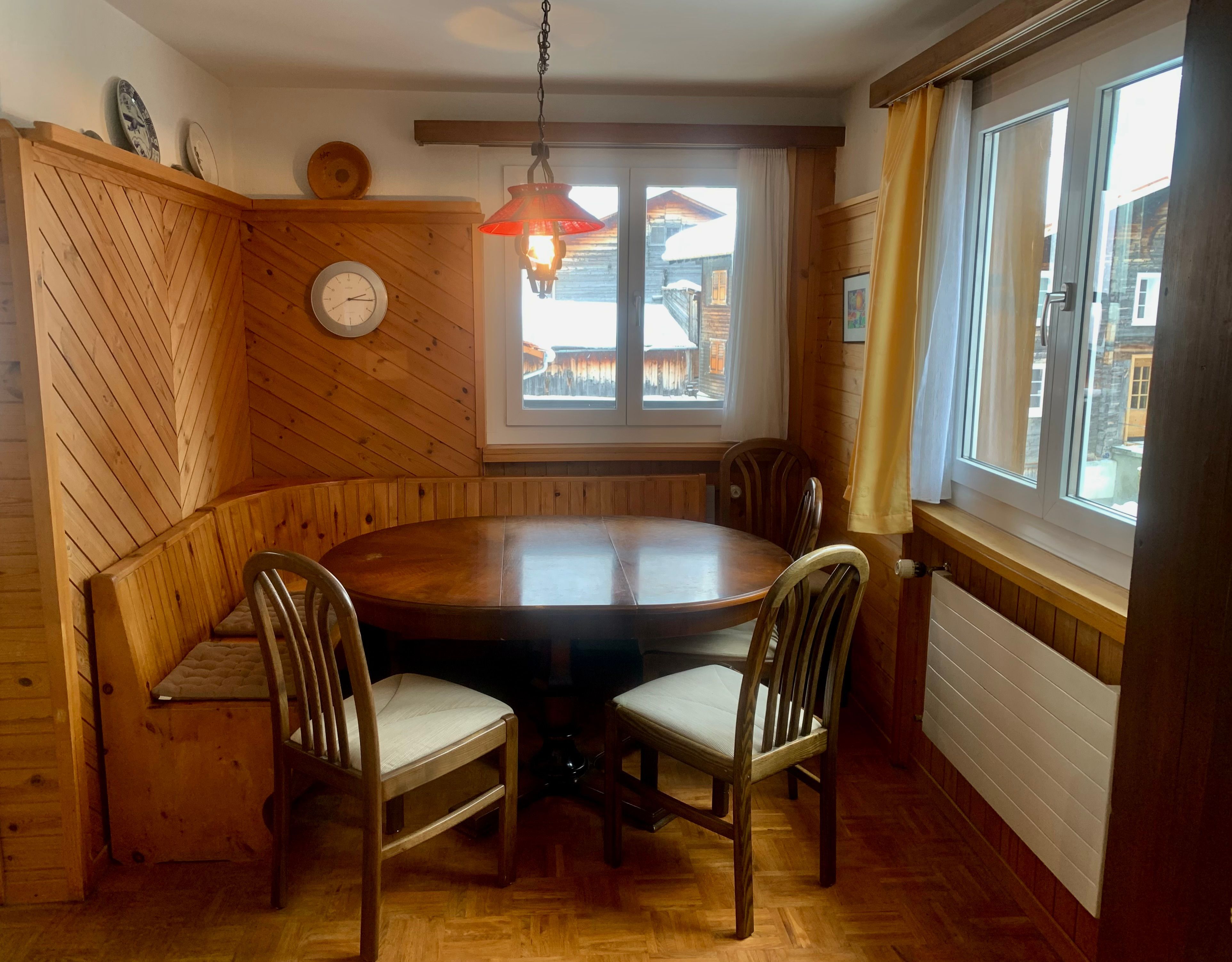 Die Küche ist komplett ausgestattet und bietet alles, was man für den täglichen Gebrauch benötigt: drei Herdplatten, einen Backofen, einen Kühlschrank, einen Wasserkocher sowie mehrere Möglichkeiten zur Kaffeezubereitung – eine Nespresso-Maschine (Kapseln bitte selbst mitbringen), ein Bialetti-Kocher sowie eine klassische Filterkaffeemaschine (keine Geschirrmaschine). In der Küche steht ein kleiner Tisch, zusätzlich gibt es einen grossen, ausziehbaren Esstisch mit einer gemütlichen Eckbank. Gewürze dürfen gerne verwendet werden; der hohe Schrank ist als privat gekennzeichnet und daher ausgenommen.