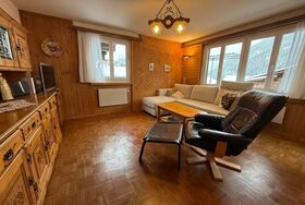 Die gemütliche Erdgeschosswohnung bietet Platz für bis zu fünf Personen und eignet sich sowohl für Paare als auch für Familien. Sie verfügt über ein geräumiges Schlafzimmer mit einem Doppel- und einem Einzelbett. Das helle Wohnzimmer lädt mit einem bequemen Schlafsofa, einem Sessel, einem Fernseher mit Swisscom-TV (inklusive Replay-Funktion) sowie einem Radio mit CD-Player zum Verweilen ein.