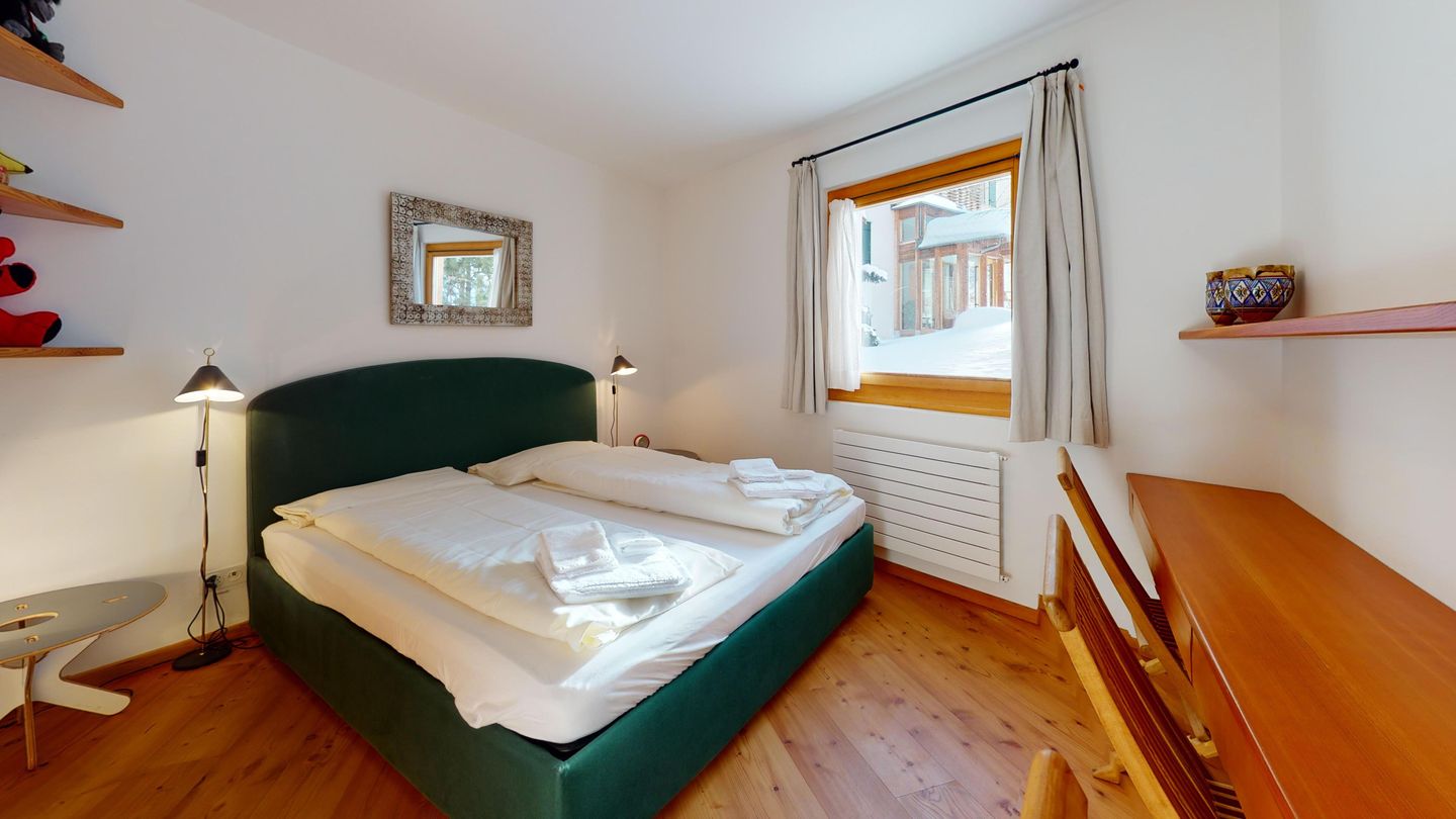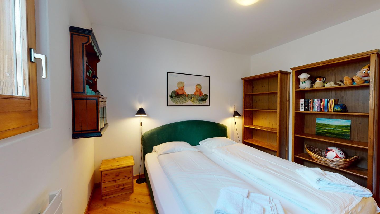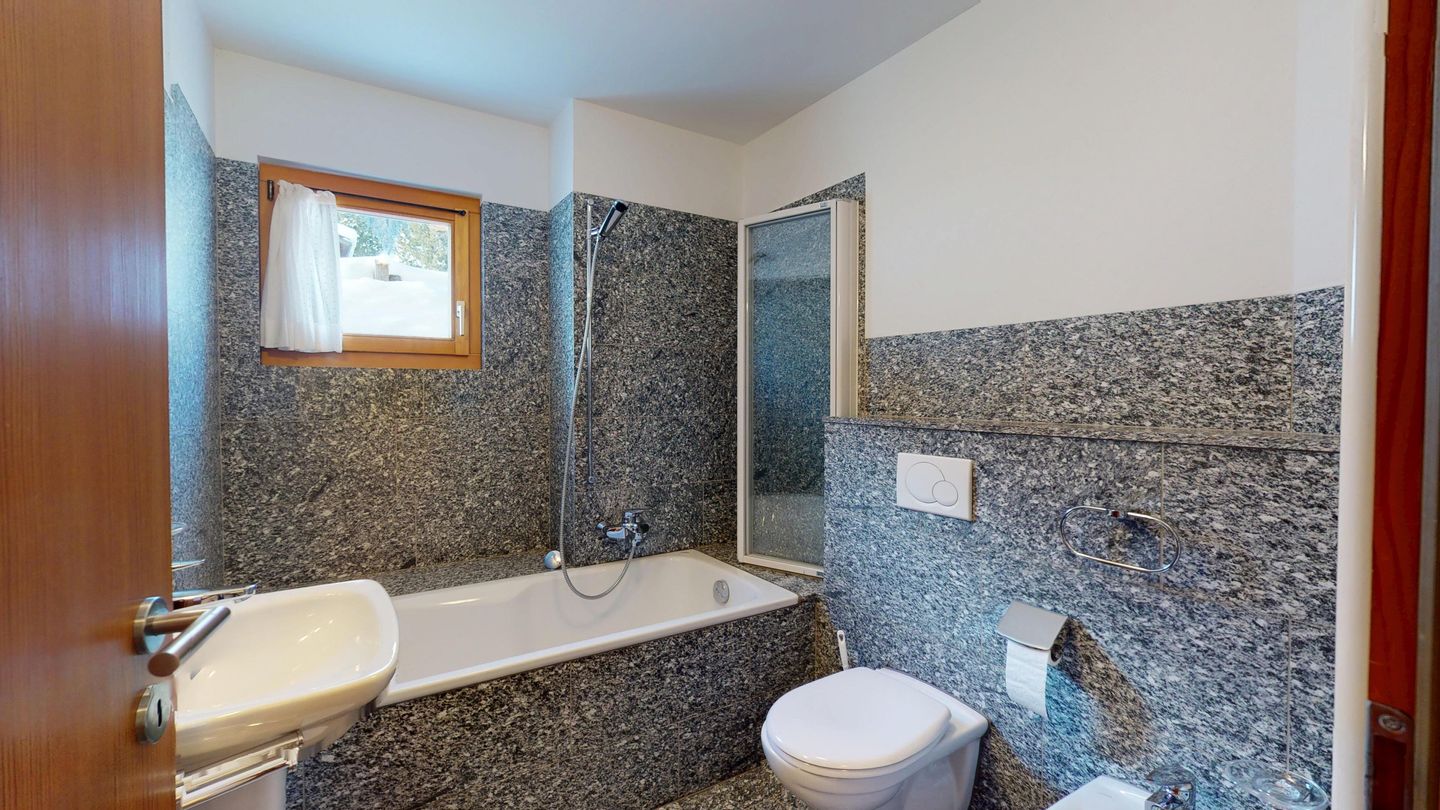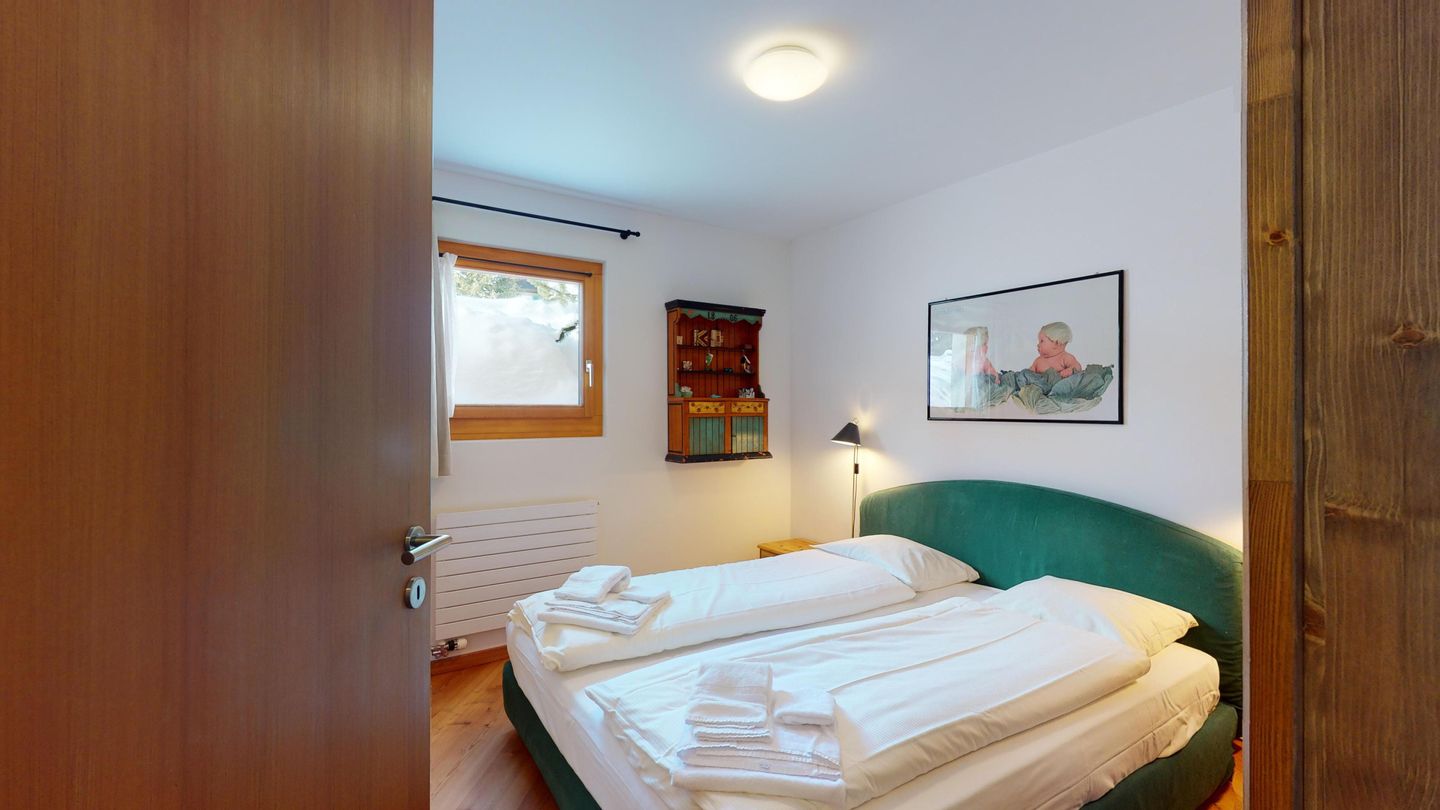 Die Ferienwohnung verfügt über ein Wohnzimmer mit Sofa und Fernseher sowie Ausgang zum Gartensitzplatz mit schöner Sicht auf die Berge. Weiter finden Sie einen Esstisch sowie einen Kamin. Die halboffene Küche ist komplett ausgestattet und bietet einen hohen Kochkomfort. Die Küche verfügt über eine Essecke mit Bank. Das Master-Schlafzimmer verfügt über ein Doppelbett und einen begehbaren Schrank sowie ein eigenes Badezimmer mit Badewanne. Die Wohnung hat zwei weitere Schlafzimmer mit Doppelbett, die sich einen begehbaren Kleiderschrank und ein Badezimmer mit Badewanne teilen. Ein Garagenparkplatz (CHF 15.00 pro Tag), Waschküche und Skiraum zur gemeinsamen Nutzung stehen zur Verfügung.