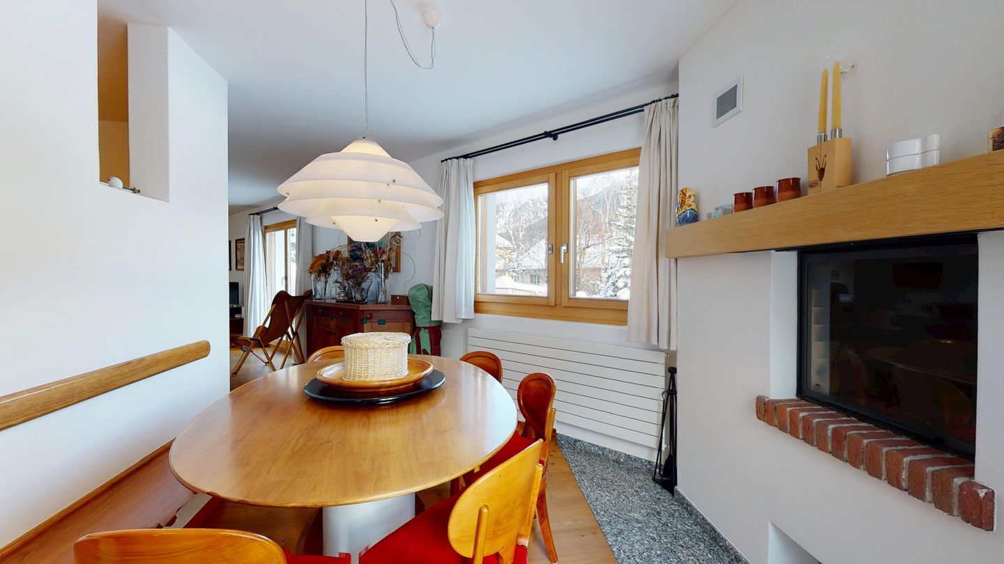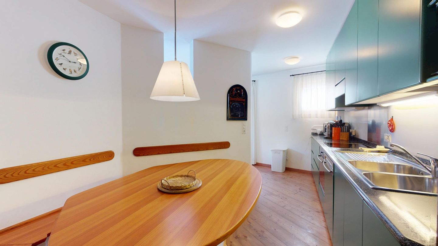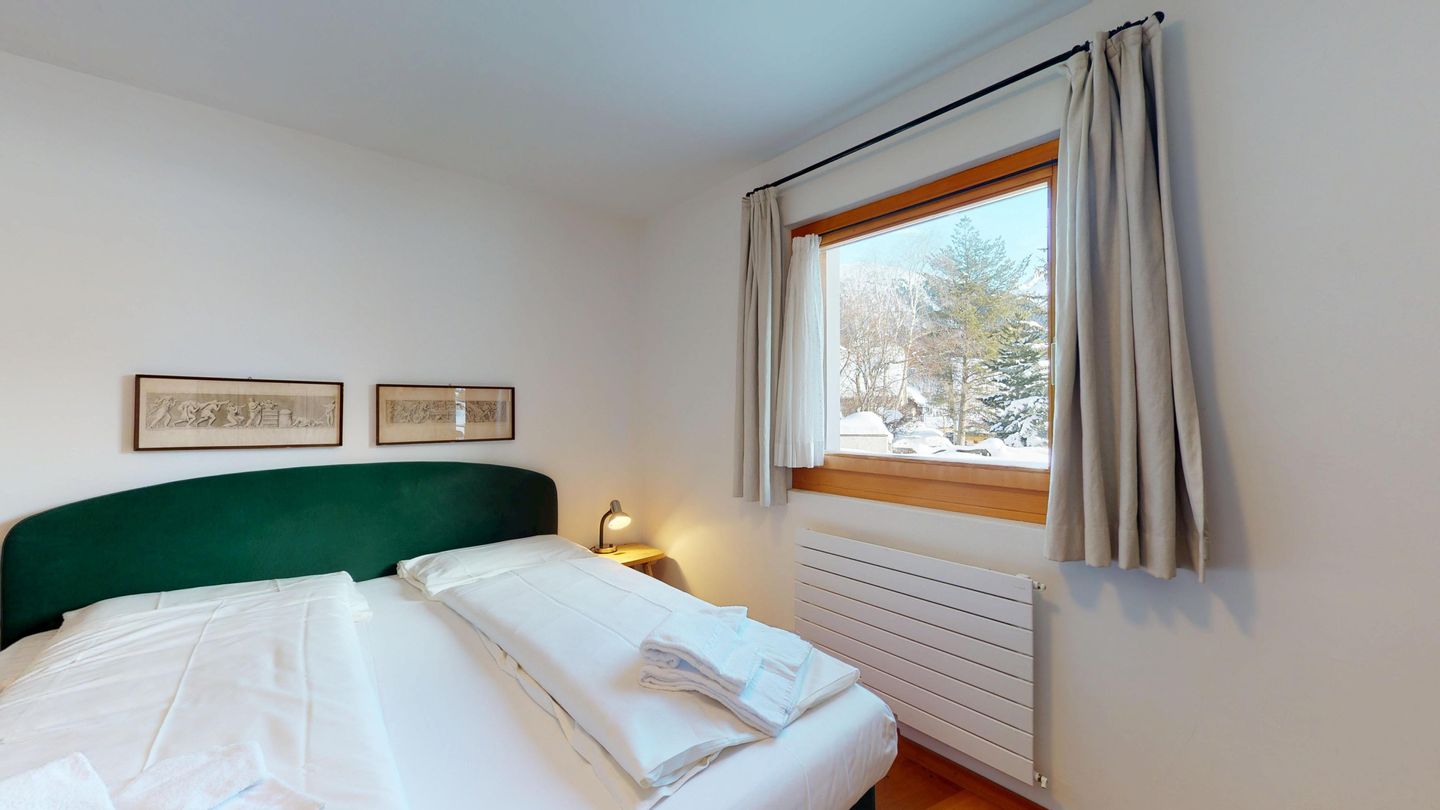 Die Ferienwohnung verfügt über ein Wohnzimmer mit Sofa und Fernseher sowie Ausgang zum Gartensitzplatz mit schöner Sicht auf die Berge. Weiter finden Sie einen Esstisch sowie einen Kamin. Die halboffene Küche ist komplett ausgestattet und bietet einen hohen Kochkomfort. Die Küche verfügt über eine Essecke mit Bank. Das Master-Schlafzimmer verfügt über ein Doppelbett und einen begehbaren Schrank sowie ein eigenes Badezimmer mit Badewanne. Die Wohnung hat zwei weitere Schlafzimmer mit Doppelbett, die sich einen begehbaren Kleiderschrank und ein Badezimmer mit Badewanne teilen. Ein Garagenparkplatz (CHF 15.00 pro Tag), Waschküche und Skiraum zur gemeinsamen Nutzung stehen zur Verfügung.
