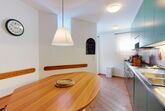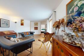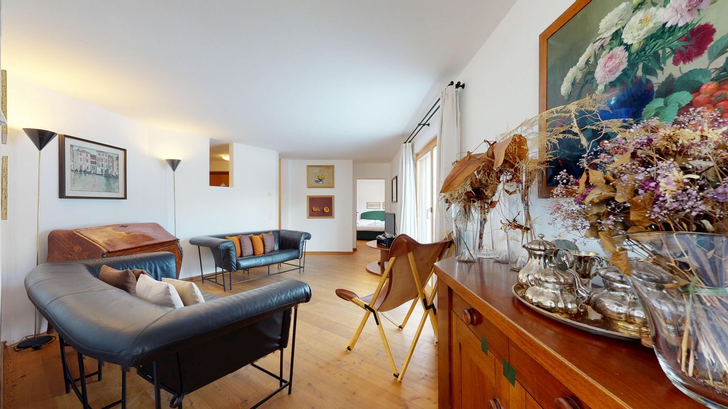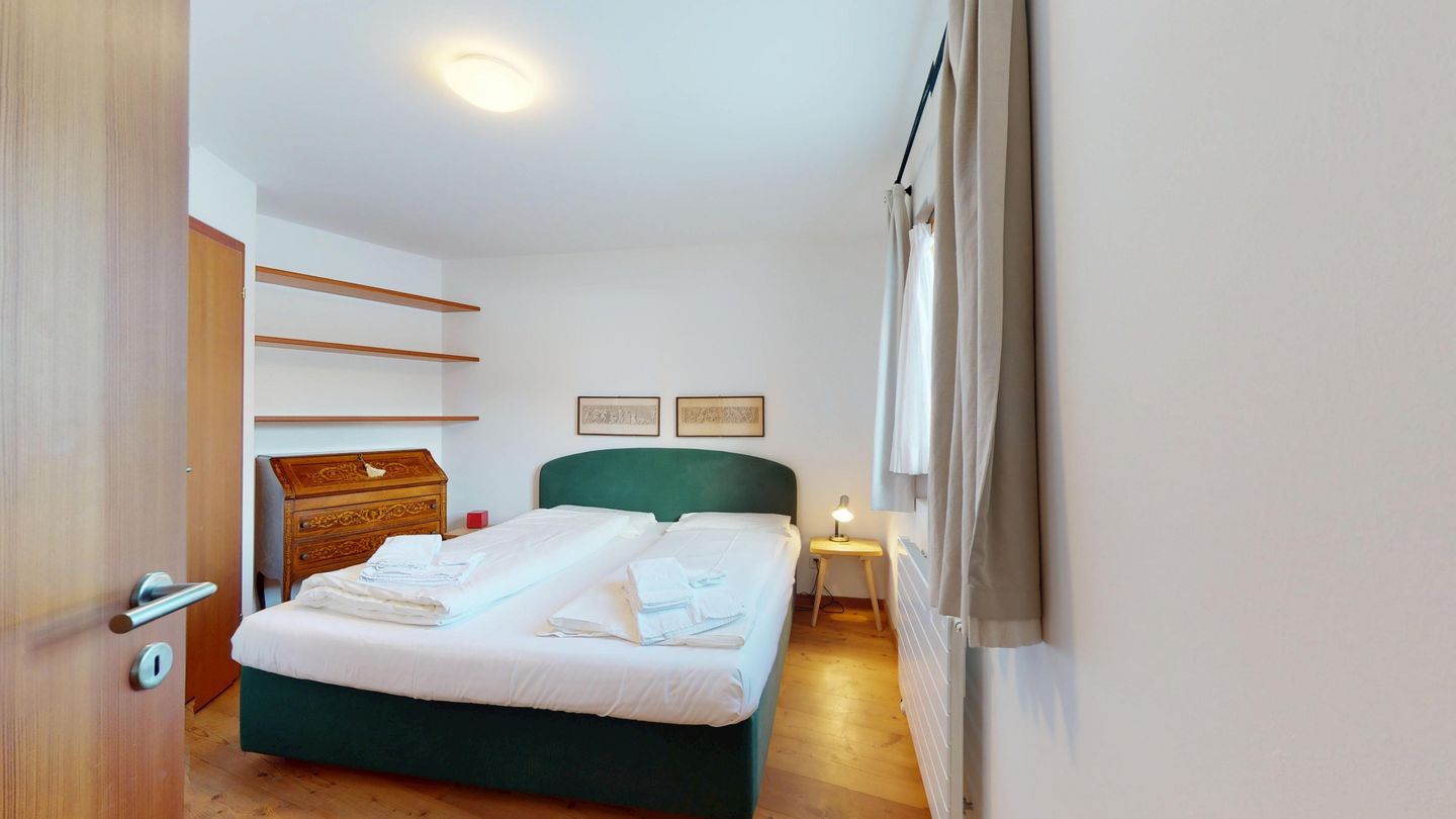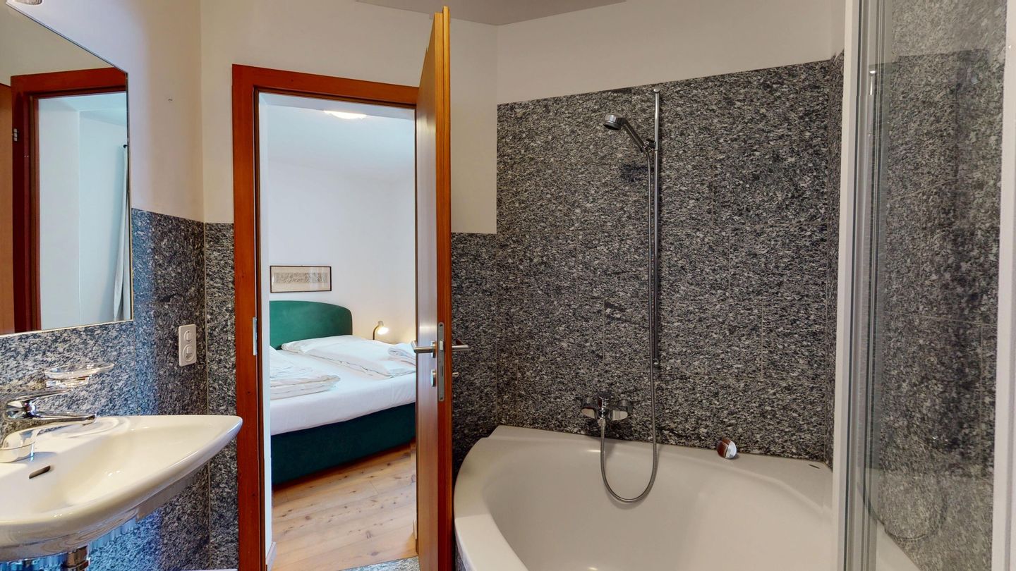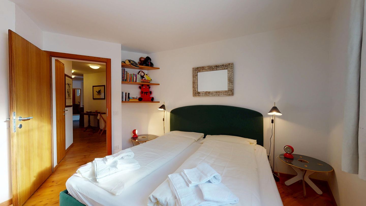 Die Ferienwohnung verfügt über ein Wohnzimmer mit Sofa und Fernseher sowie Ausgang zum Gartensitzplatz mit schöner Sicht auf die Berge. Weiter finden Sie einen Esstisch sowie einen Kamin. Die halboffene Küche ist komplett ausgestattet und bietet einen hohen Kochkomfort. Die Küche verfügt über eine Essecke mit Bank. Das Master-Schlafzimmer verfügt über ein Doppelbett und einen begehbaren Schrank sowie ein eigenes Badezimmer mit Badewanne. Die Wohnung hat zwei weitere Schlafzimmer mit Doppelbett, die sich einen begehbaren Kleiderschrank und ein Badezimmer mit Badewanne teilen. Ein Garagenparkplatz (CHF 15.00 pro Tag), Waschküche und Skiraum zur gemeinsamen Nutzung stehen zur Verfügung.