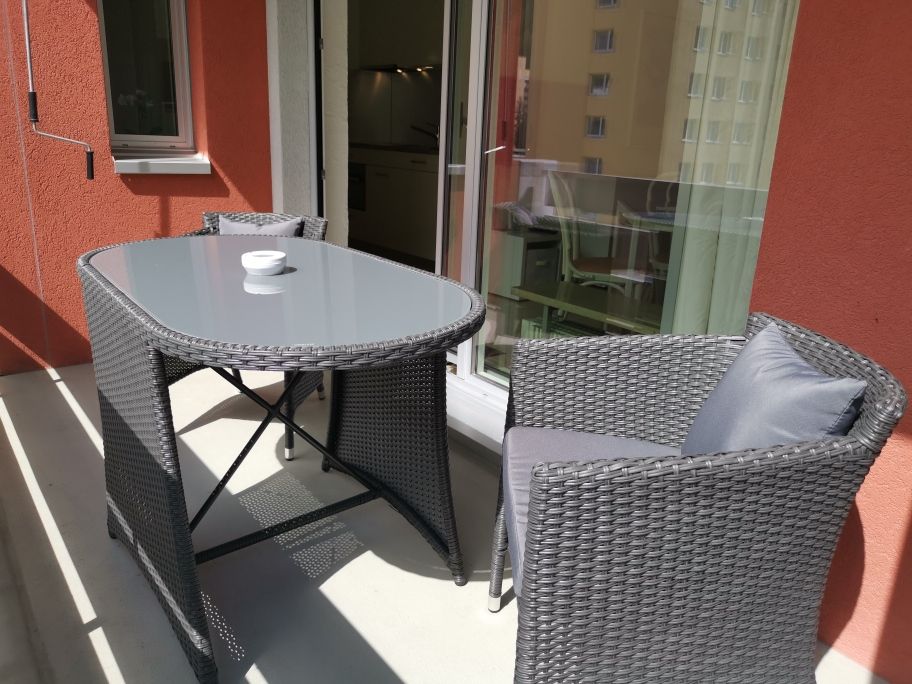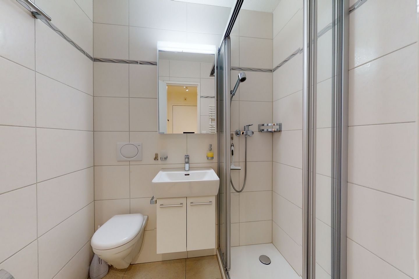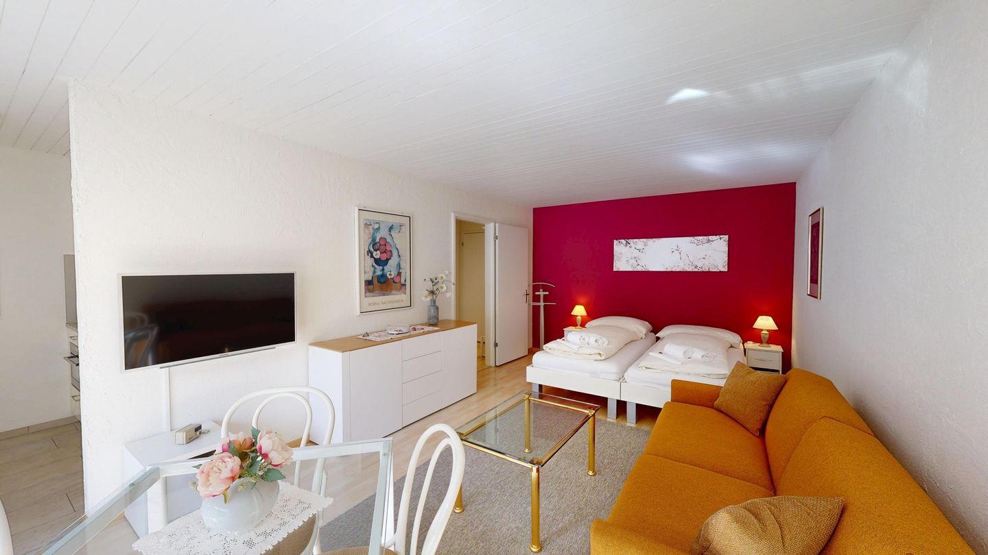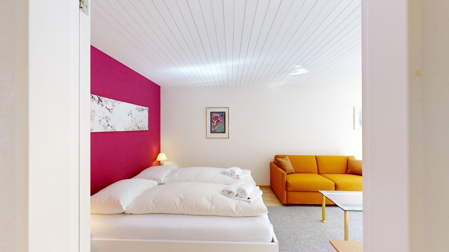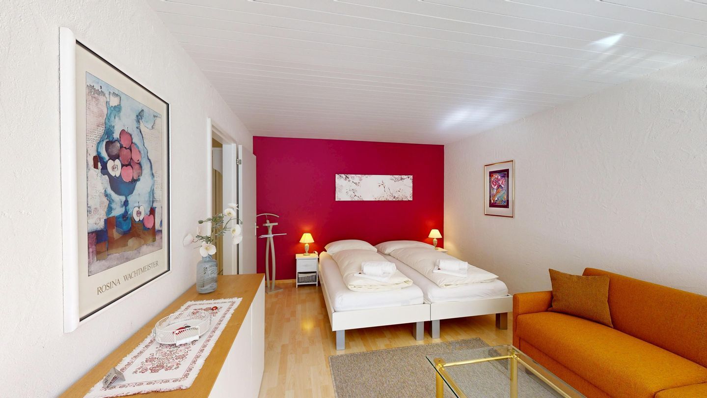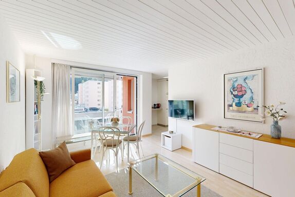 Die Wohnung verfügt über ein Wohnzimmer mit zwei Einzelbetten (welche auseinander oder zusammengelegt werden können) sowie ein Sofabed für eine dritte Person. Weiter finden Sie ein Fernseher sowie ein Esstisch mit Stühlen. Die geräumige Küche ist halb abgetrennt und mit modernen Gerätschaften ausgestattet. Beim Eingangsbereich hat es ein Badezimmer mit Dusche. Ein kleiner Balkon gehört ebenfalls zu der Wohnung (Südsicht / Bergsicht).