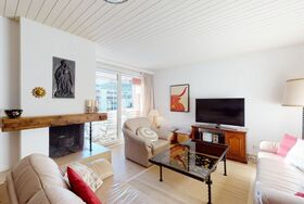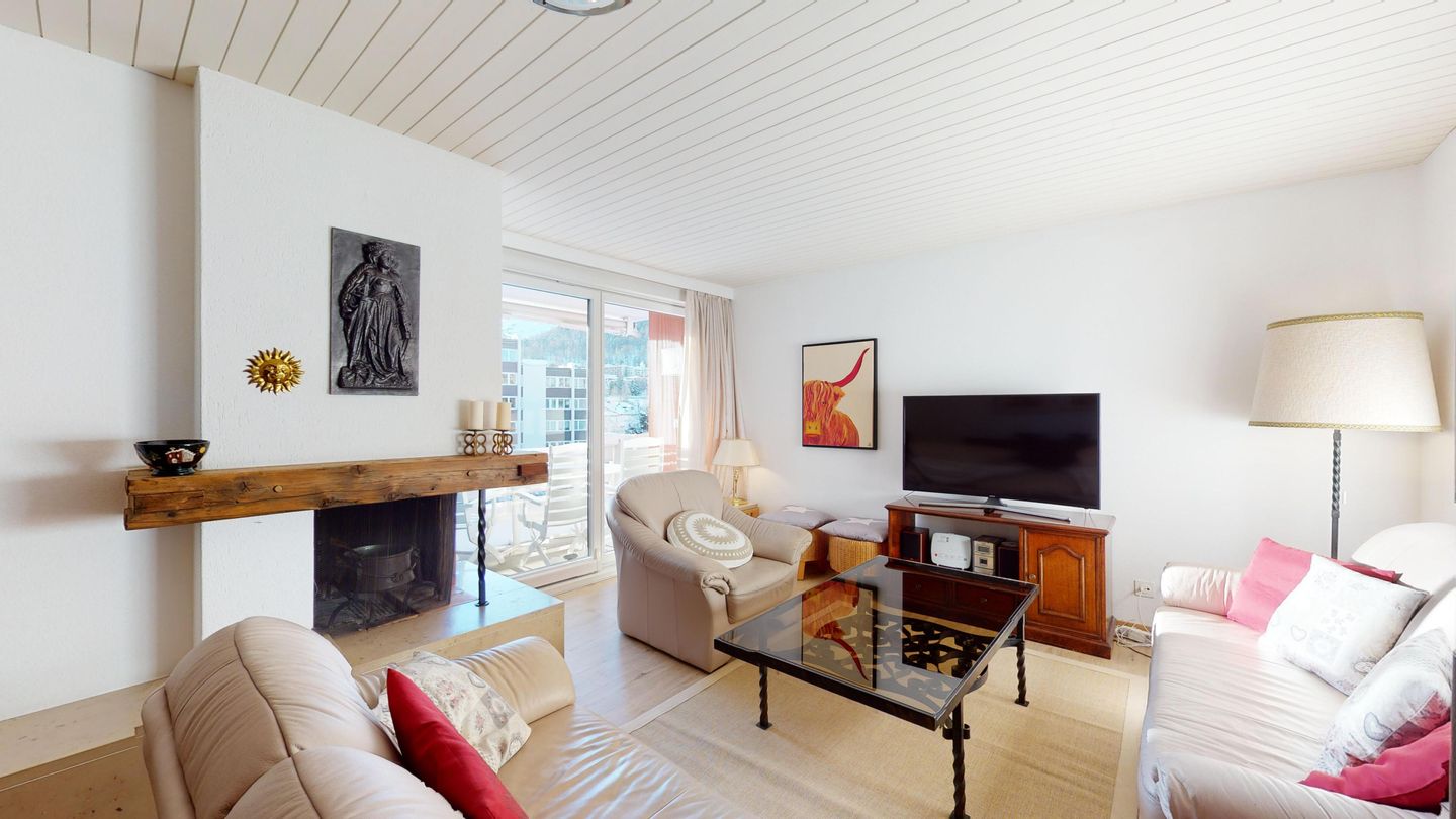 Die Wohnung verfügt über ein Wohnzimmer welches mit Sofa und Fernseher ausgestattet ist. Vom Wohnzimmer gelangt man direkt auf den Balkon. Die Küche ist in einem separaten Raum und kann abgeschlossen werden. Die Essecke ist unmittelbar daneben. Im Eingangsbereich befindet sich ein separates WC. In der linken Wohnungshälfte befinden sich die beiden Schlafzimmer sowie ein Badezimmer mit Badewanne. Der Kamin, welcher auf den Fotos zu sehen ist, ist nicht mehr funktionstüchtig.