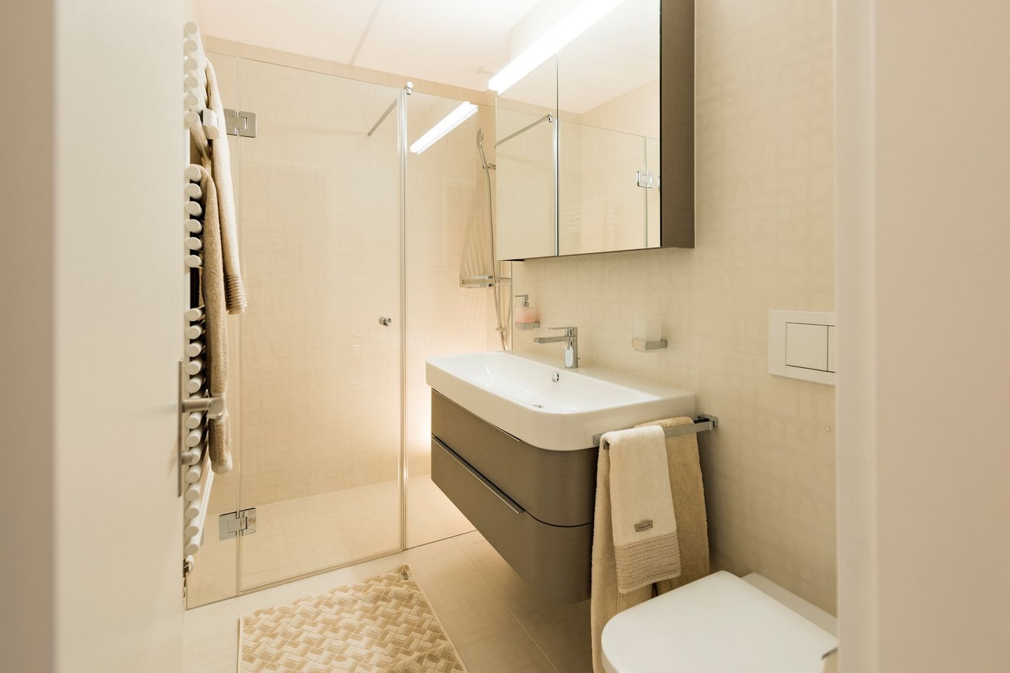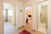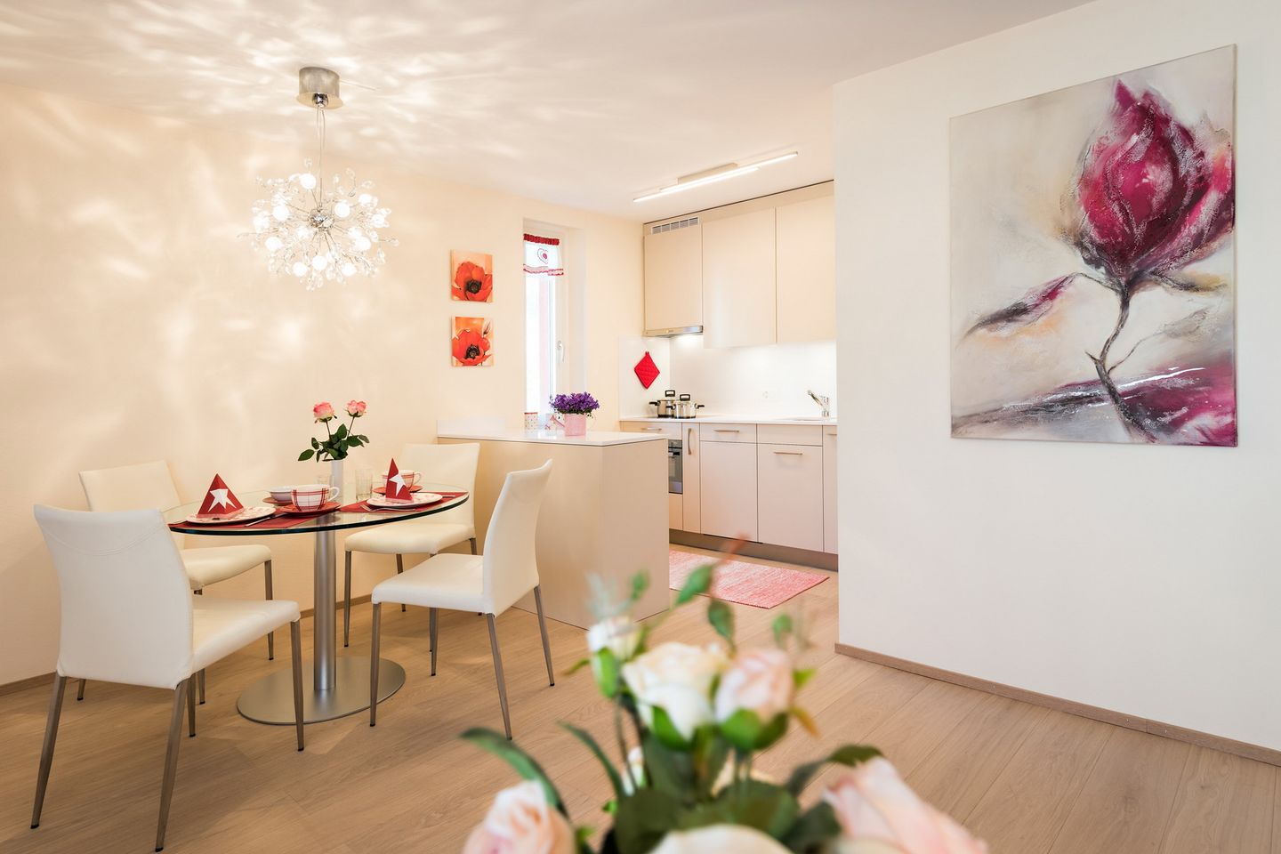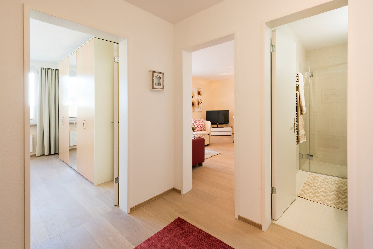 Die Raumverhältnisse sind grosszügig, und die Wohnung besticht durch ihren hochwertigen Parkettboden sowie geschmackvolle Möbel. Das Mehrfamilienhaus verfügt über einen Lift und ein gemeinschaftliches Hallenbad (geschlossen im Mai und November).