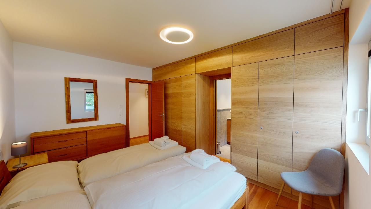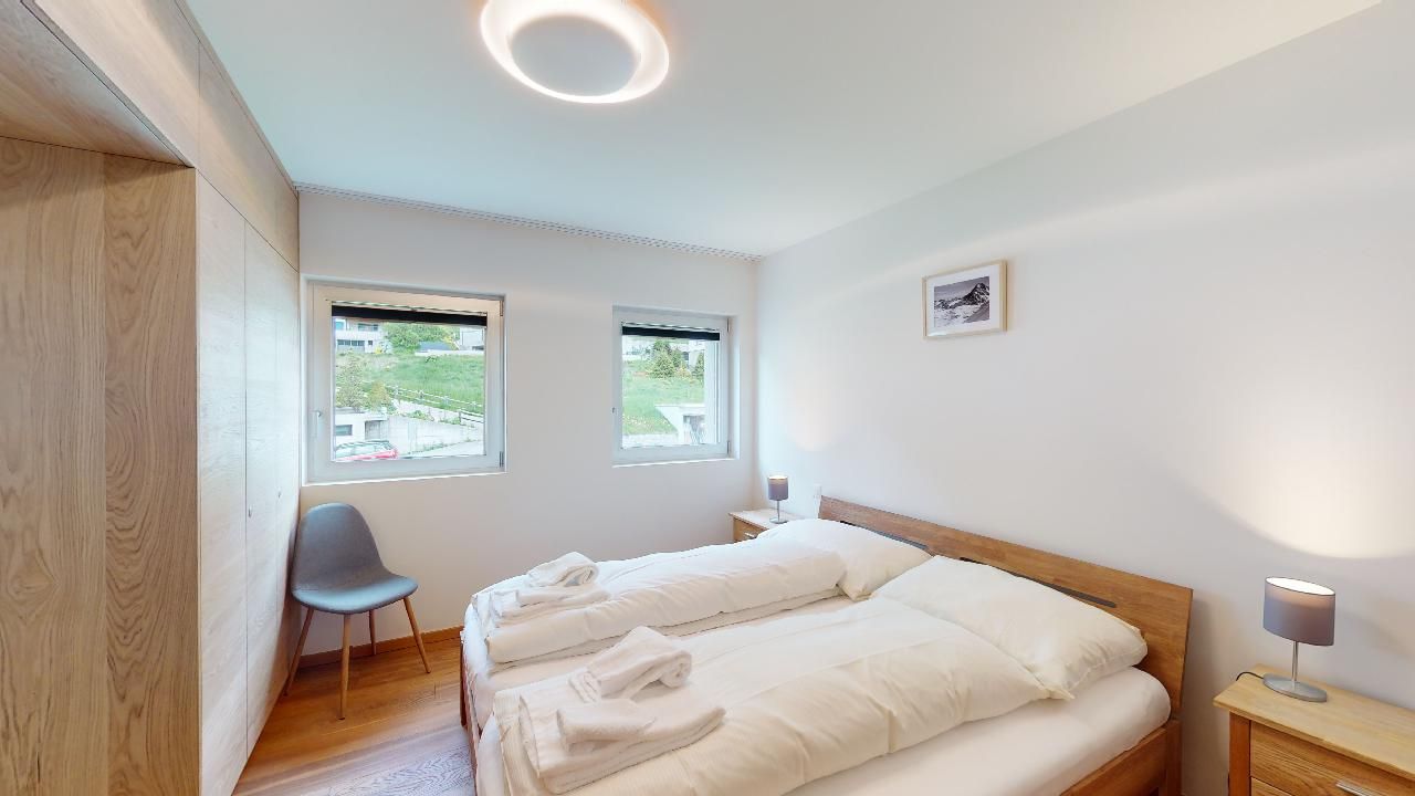 Die Ferienwohnung verfügt über ein Wohn- und Esszimmer mit offener Küche. Die Küche ist mit modernsten Geräten ausgestattet und komplett eingerichtet. Ein Esstisch für 6 Personen steht zur Verfügung und von der Küche gelangen Sie auf den Balkon mit einer wunderschönen Aussicht in Richtung Piz Padella und Corviglia. Das Wohnzimmer hat zwei Sofas und ein Fernseher. Sie finden ein Schlafzimmer mit einem Doppelbett und En-Suite Badezimmer mit begehbarer Dusche. Das zweite Schlafzimmer verfügt über zwei Einzelbetten. Es steht ein weiteres Badezimmer mit Dusche zur Verfügung. Die Wohnung verfügt über einen Skiraum sowie eine private Waschküche. Ebenfalls gehört zur Wohnung ein Garagenparkplatz.