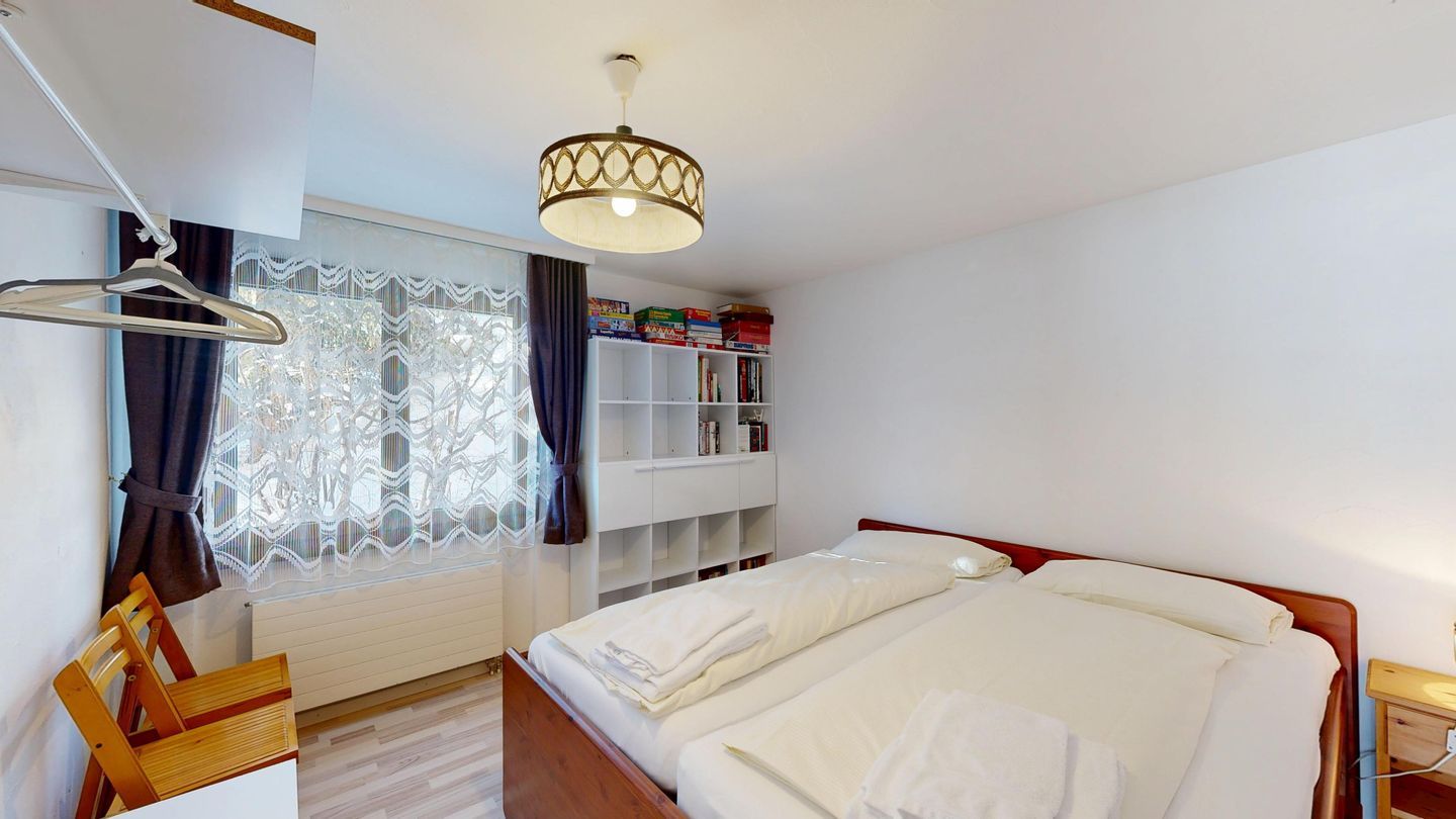 Die Ferienwohnung verfügt über ein Wohnzimmer mit einem Sofa und einem Fernseher (Swisscom-TV). Vom Wohnzimmer gelangen Sie auf den Gartensitzplatz mit einer wunderschönen Aussicht. Angrenzend an den Wohnbereich befindet sich eine Eckbank mit Esstisch. Die Küche ist komplett ausgestattet und alle Geräte sind auf dem neusten Stand. Die beiden Schlafzimmer haben jeweils ein Doppelbett mit Einzelmatratzen. Es steht ein Badezimmer mit Dusche sowie ein weiteres Gäste-WC zur Verfügung. Zur Wohnung gehört ebenso ein Garagenparkplatz.