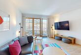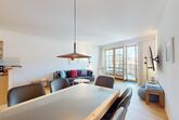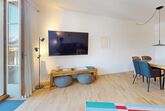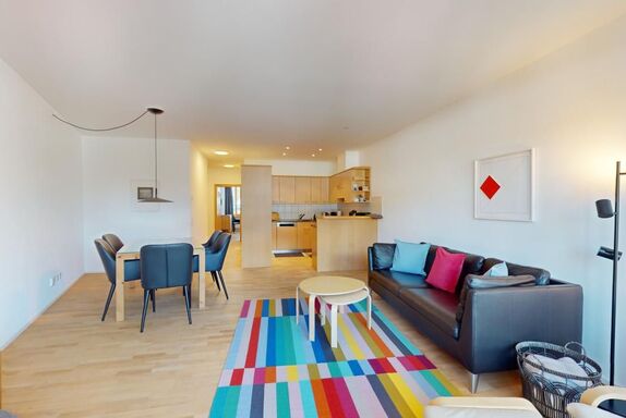 Das Herzstück der Wohnung bildet das grosszügige Wohn- und Esszimmer, ausgestattet mit einem grossen TV und einer hochwertigen SONOS Anlage. Die voll ausgestattete Küche erfüllt alle Wünsche für gutes Kochen.