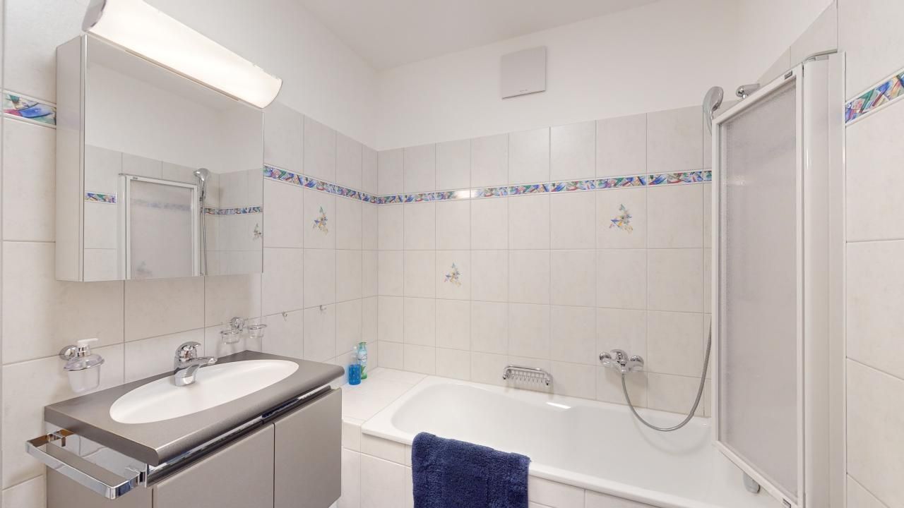 Die Wohnung verfügt über zwei Nasszellen, eine mit Badewanne und eine mit Dusche. Die drei Schlafzimmer sind liebevoll eingerichtet, zwei davon mit jeweils einem Doppelbett, ausgestattet mit einzelnen Matratzen, und das dritte mit einem Einzelbett.
