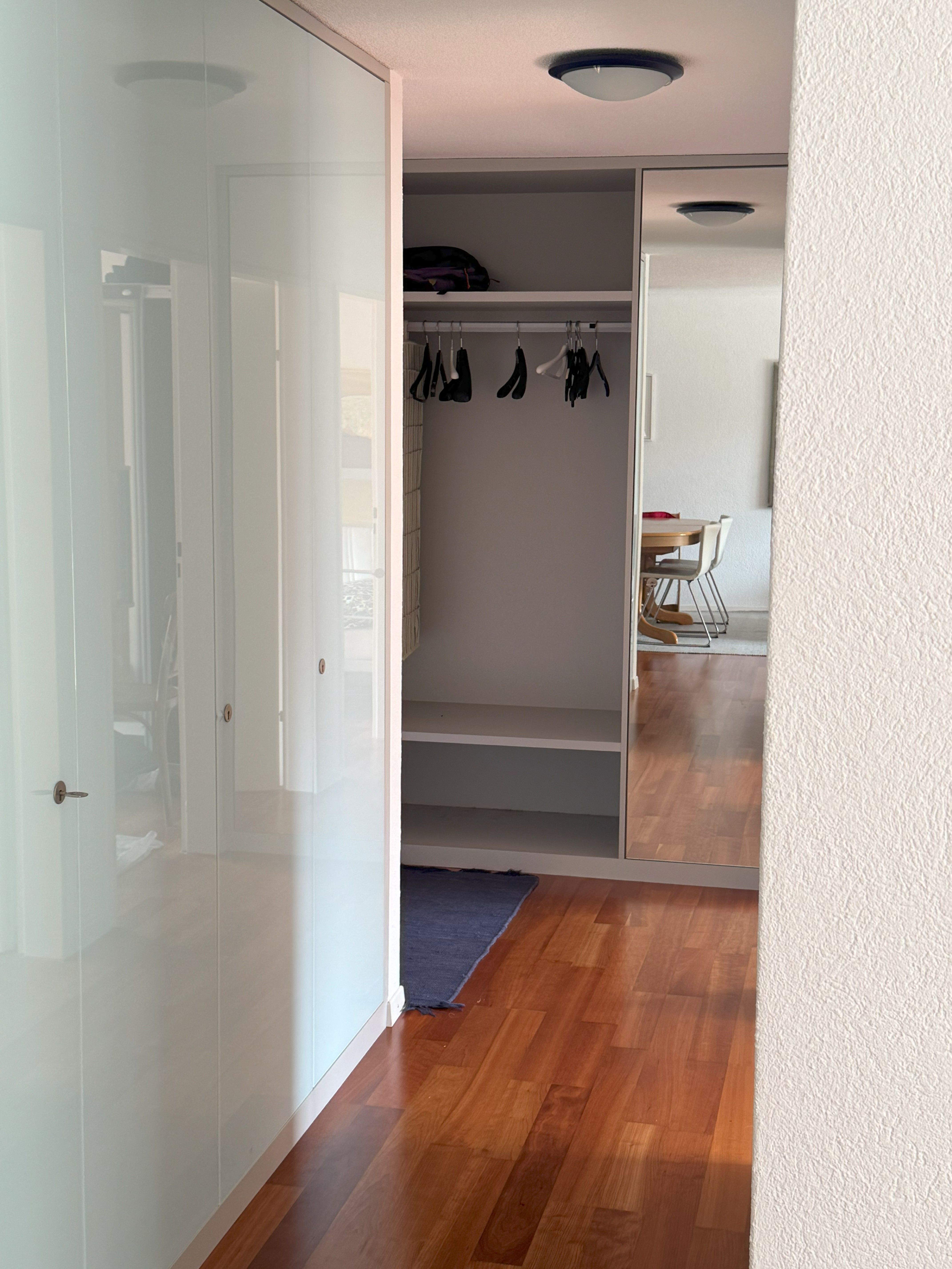 Sonstige Schlafzimmereinrichtung (Schlafzimmer1): Nachttische mit Beleuchtung, Ablagemöglichkeiten für Kleider, Strandkorb als separate Sitzgelegenheit. Zudem hat es im Gang genügend Platz für Ihre Effekten in Einbauschränken, welche Ihnen zur Verfügungstehen.