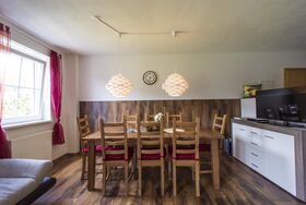 - Wohnzimmer mit großer Essgruppe, ausziehbarer Doppelcouch und Kabel-TV mit LCD Flat-Screen