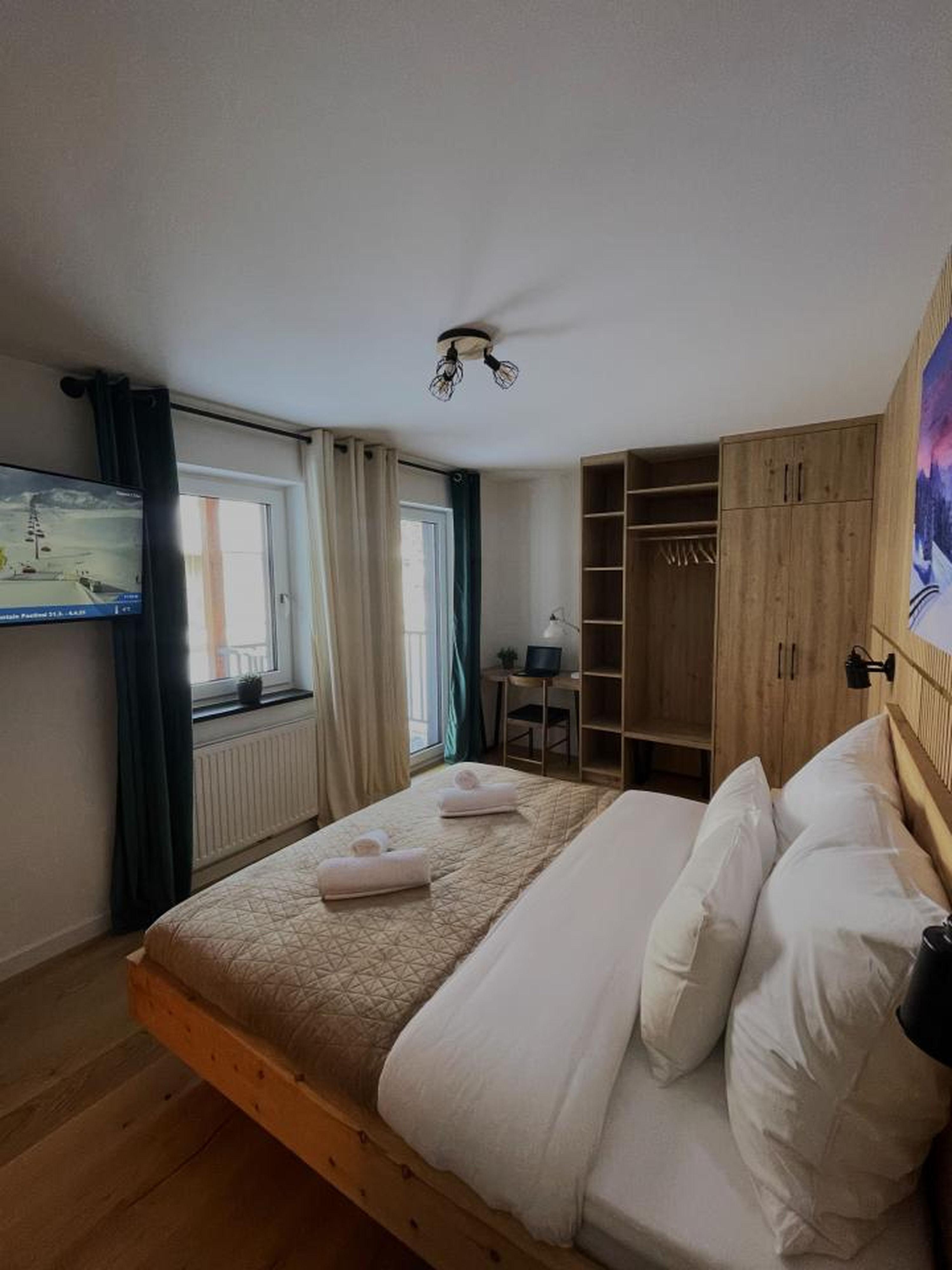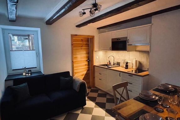 Apartment 3 mit ca. 36 m², eleganten Parkettböden, Balkon, 1 Doppelzimmer mit Zirbenbett das mit seinem natürlichen Holzduft für eine entspannte Atmosphäre sorgt, vollausgestattete Wohnküche mit Smart-TV, Schlafsofa für eine weitere Person und Essbereich, Badezimmer mit Regendusche/WC.
