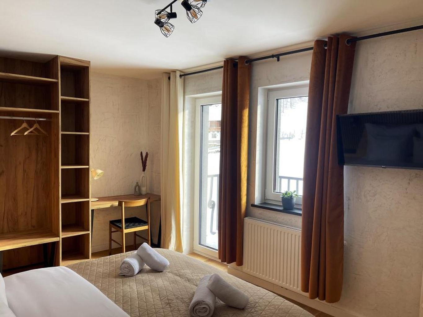 Apartment 4 mit ca. 38 m², eleganten Parkettböden, Balkon, 1 Doppelzimmer mit Zirbenbett das mit seinem natürlichen Holzduft für eine entspannte Atmosphäre sorgt, vollausgestattete Wohnküche mit Smart-TV, Schlafsofa für eine weitere Person und Essbereich, Badezimmer mit Regendusche/WC.