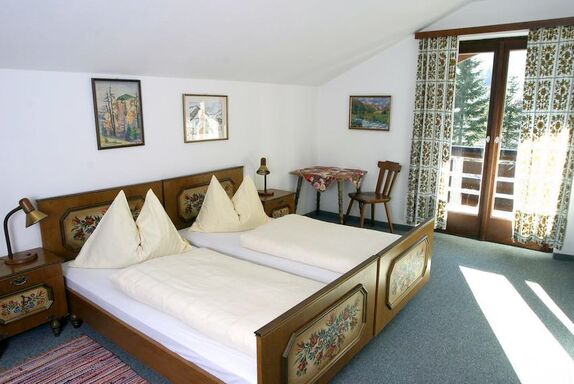 Appartement mit 2 Schlafzimmern (je 2 Betten), Wohnschlafzimmer mit Essecke, Sitzgruppe und 2 Liegen, Küche mit Kühlschrank, Elektroherd mit 3 Kochplatten und Backrohr, Bad und WC und ein zweites WC extra, Vorraum und großer überdachter Balkon