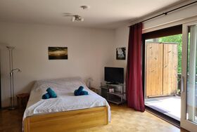 Unsere gemütliche Ferienwohnung befindet sich in ruhiger Lage unterhalb des Seidlparks, am Südrand von Murnau, mit einem wunderschönen Blick in die Berge. Die 41qm große Wohnung ist für zwei Personen geeignet und besteht aus einem großen Wohn- & Schlafraum, einem Bad, einer separaten gut ausgestatteten Küche und einer großen Süd-Terrasse mit Blick in die Berge.