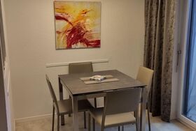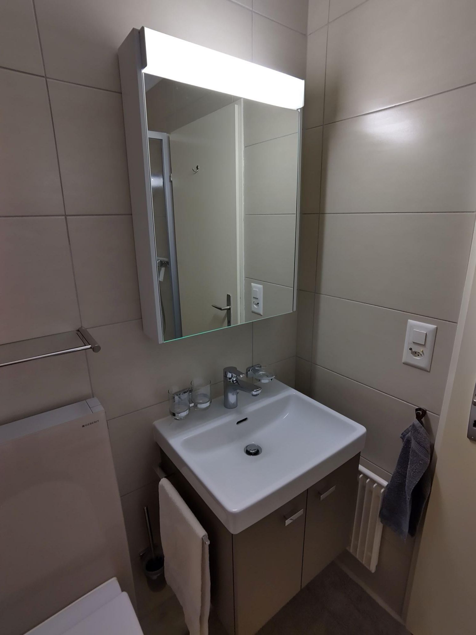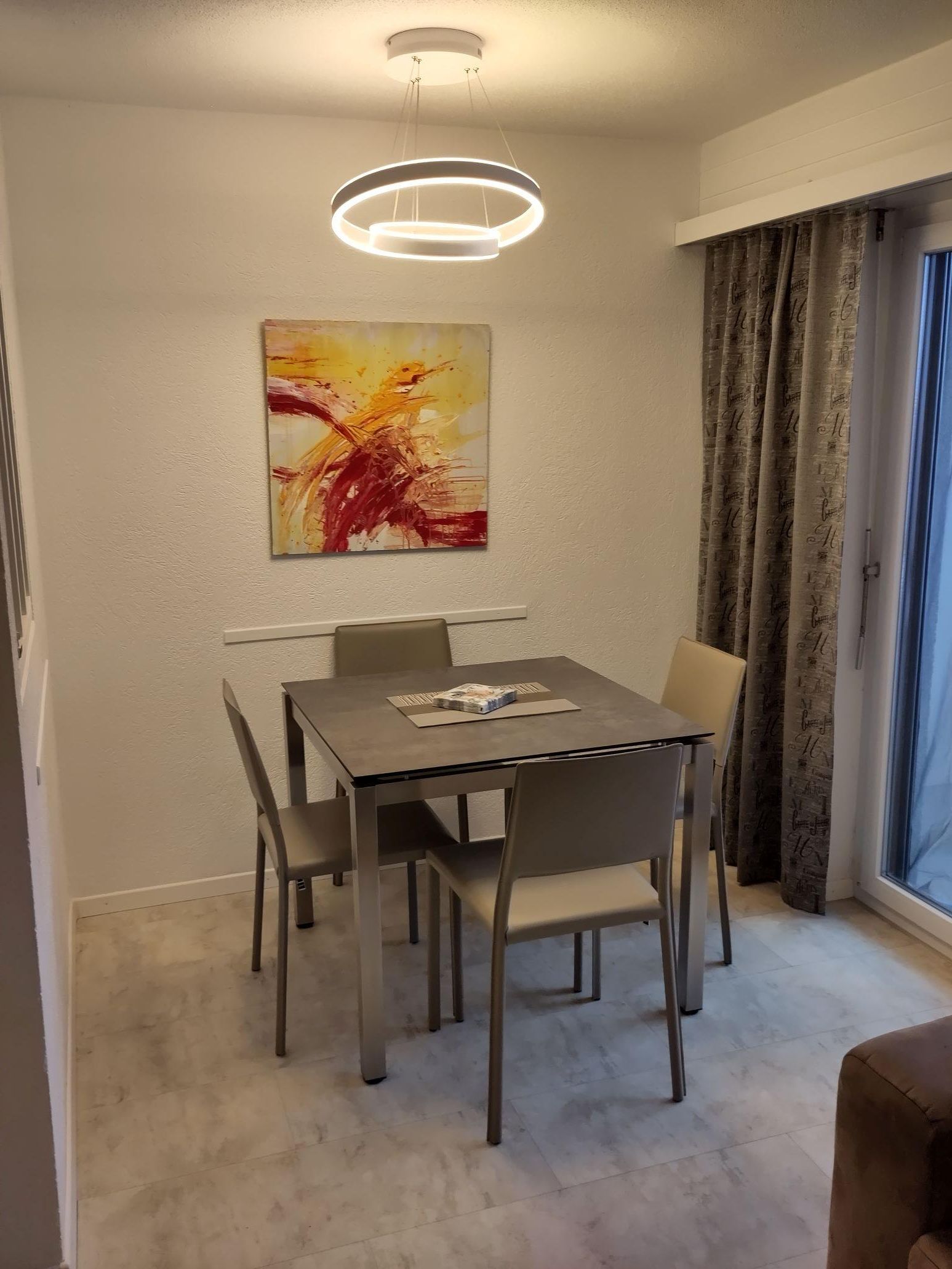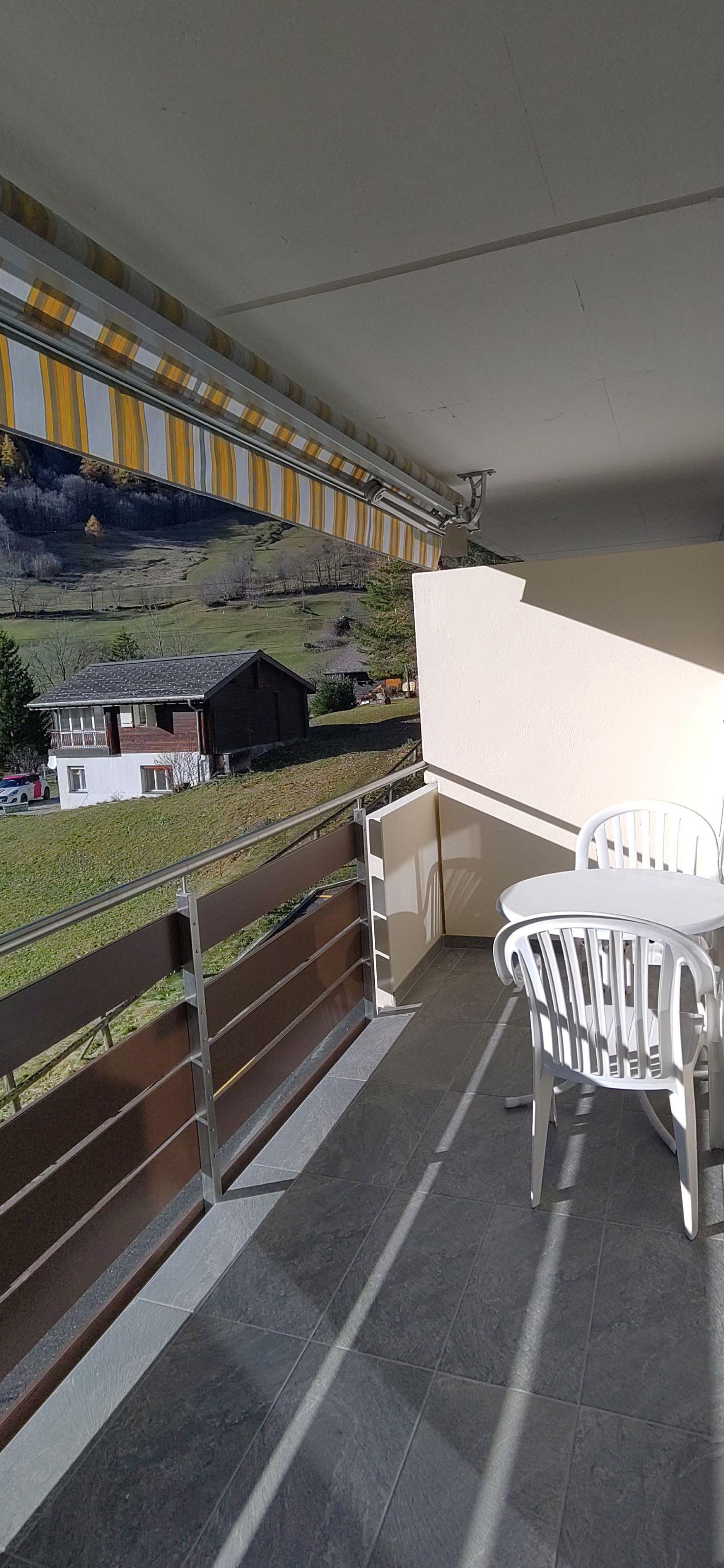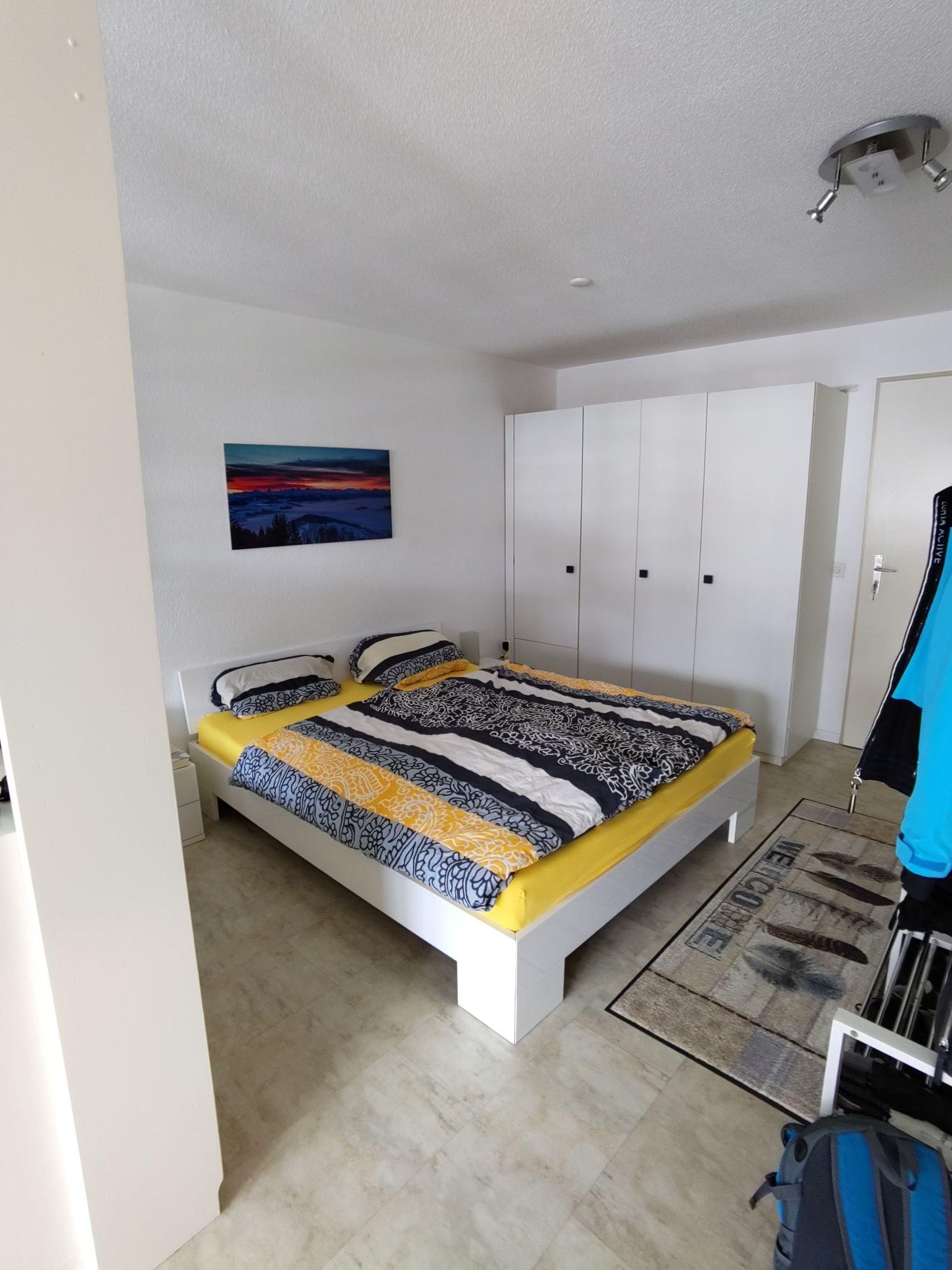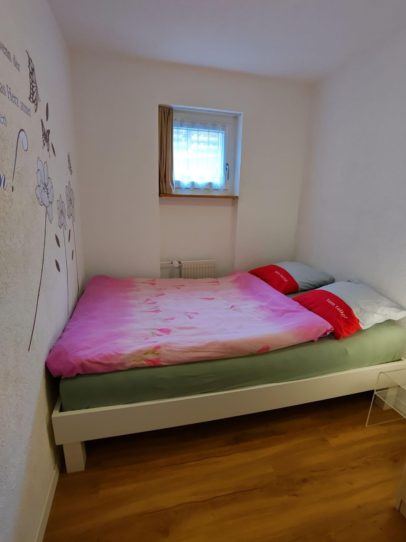 1-Zimmerwohnung (2.Etage): Wohn-/Esszimmer mit 1 Doppelbett, separate Küche mit Geschirrspüler, Kapsel-Kaffeemaschine u.v.m., Dusche/WC, Süd-Balkon mit Blick auf das Bergmassiv, gratis WiFi, Radio, TV. Separates Zusatzzimmer mit Doppelbett (von der Wohnung räumlich getrennt), gleich gegenüber. Nichtraucherwohnung! Ein Aussenparkplatz vor dem Haus inklusive.