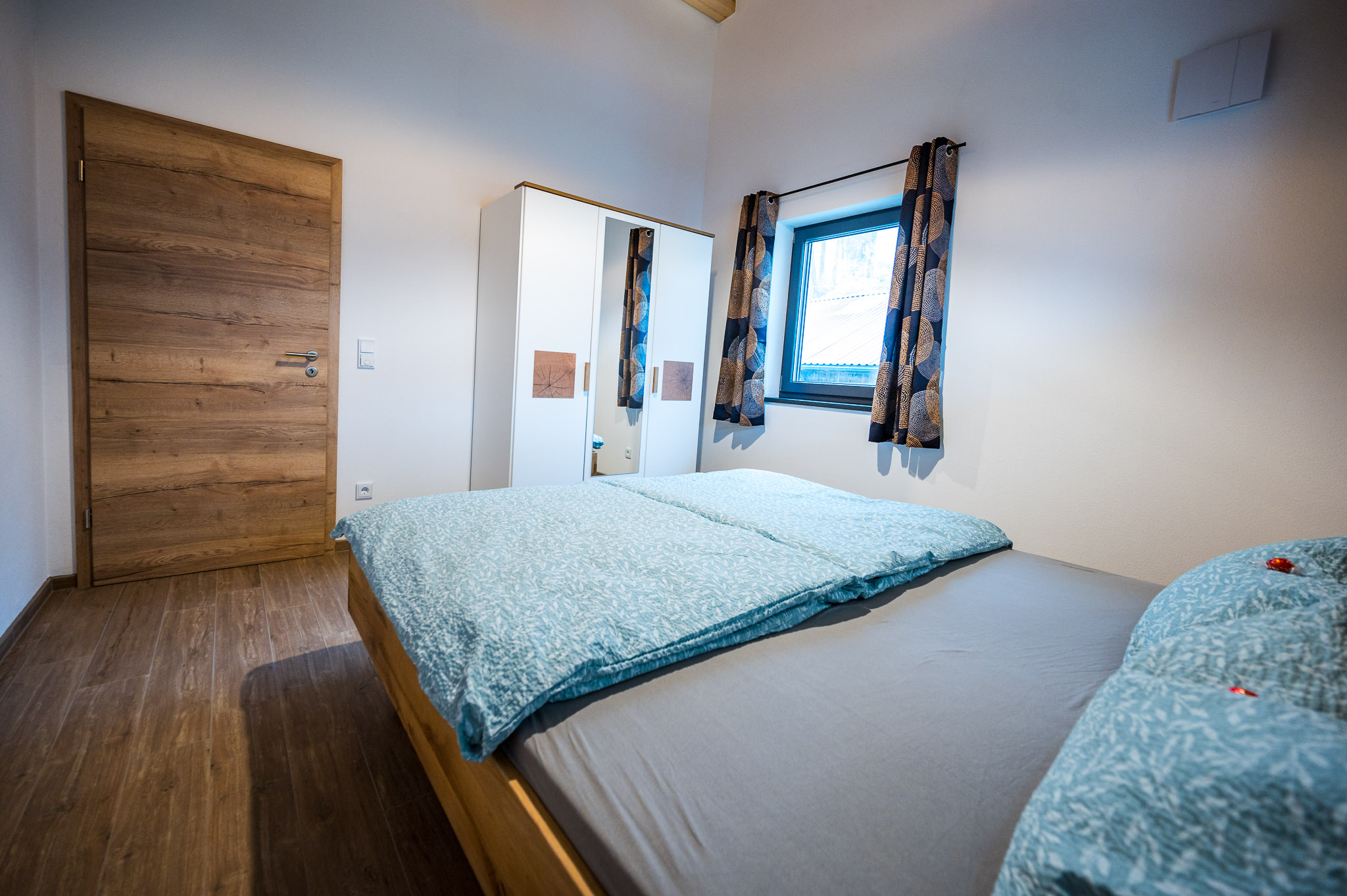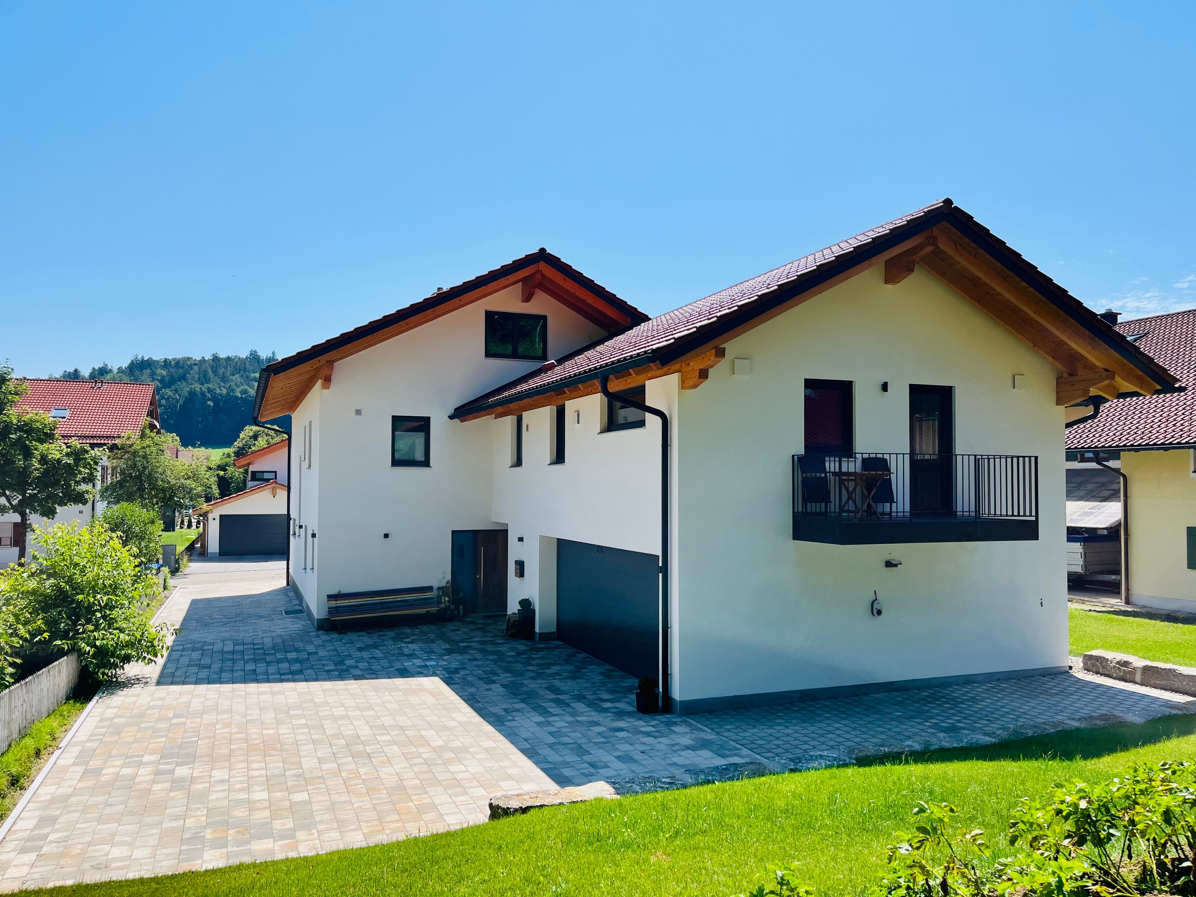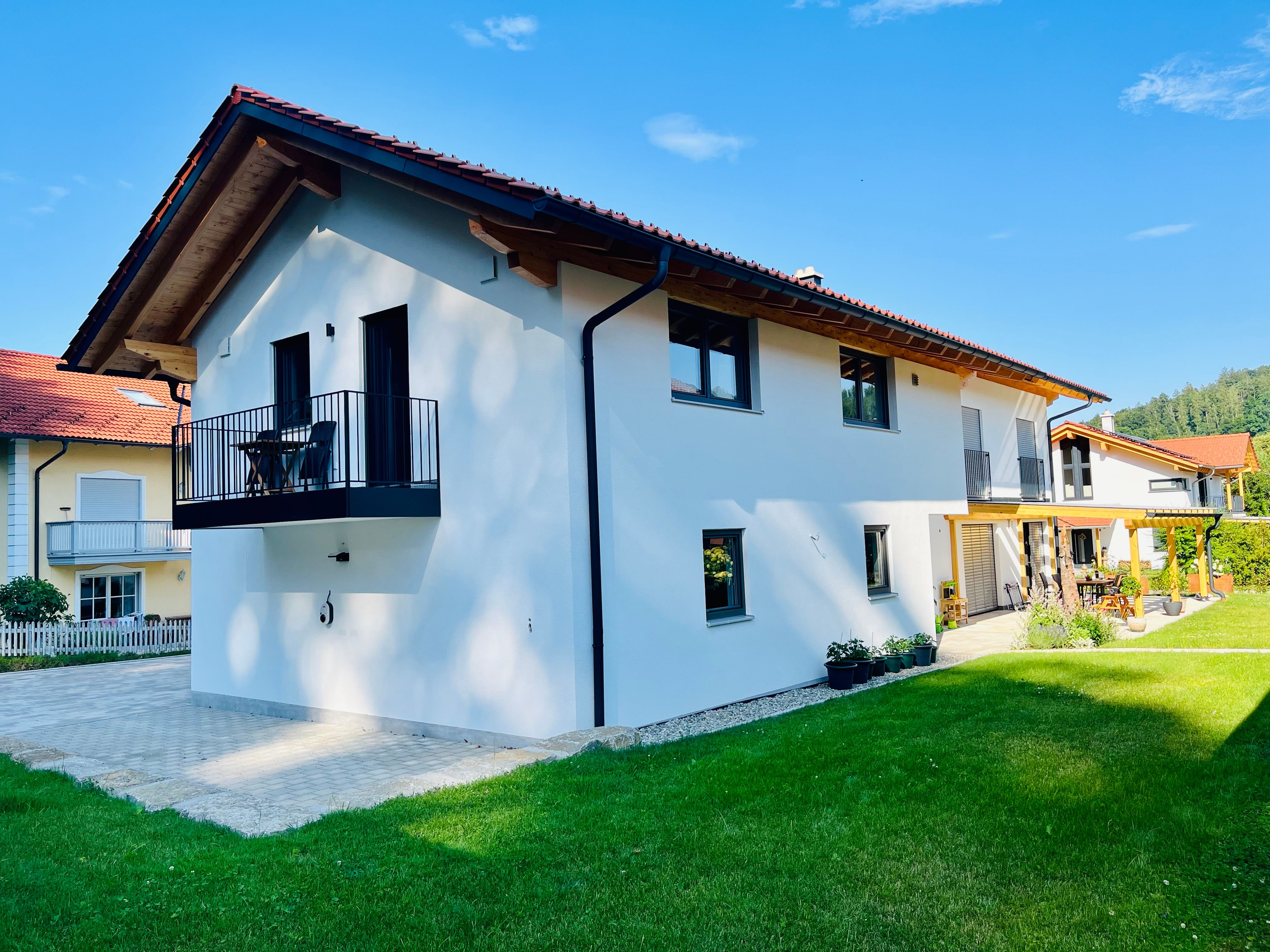 Das Haus wurde 2022 errichtet und wird auch von uns selbst bewohnt. Uns war es sehr wichtig, vorallem mit lokalen Handwerkern zu arbeiten. Die Wohnung liegt im 1. Stock über unserer Garage und ist über einen separaten Eingang mit eigenem Treppenhaus zu erreichen. Auf dem westseitigen Balkon haben Sie den perfekten Blick in den Wald. Hier können Sie schon zum Frühstück so manches Reh beobachten. Zusätzlich stehen Ihnen zwei Parkplätze direkt am Haus zur Verfügung. Außerdem können Sie bequem Ihre Fahrräder bei uns abstellen und auch eventuelle E-Bikes laden .