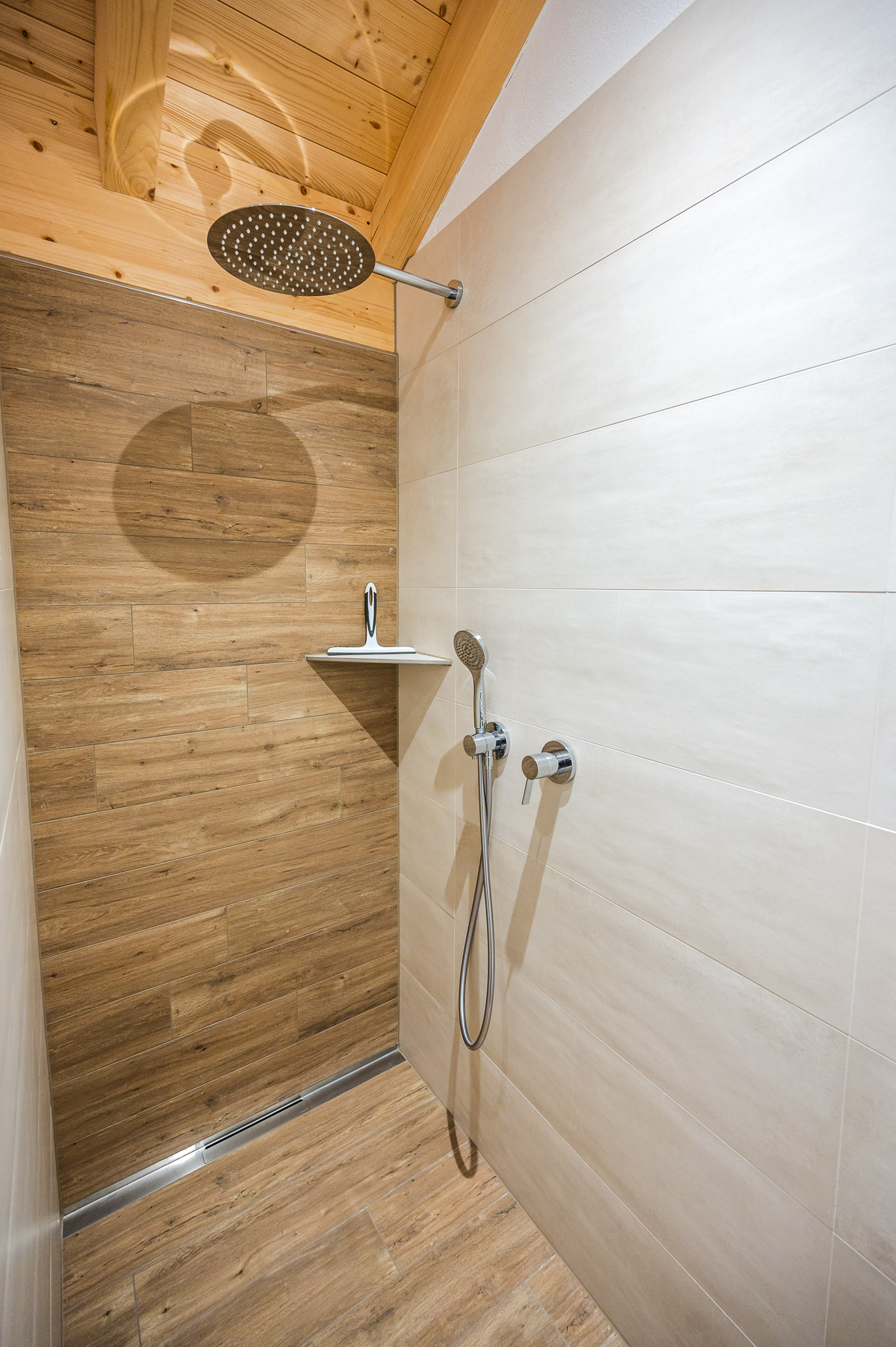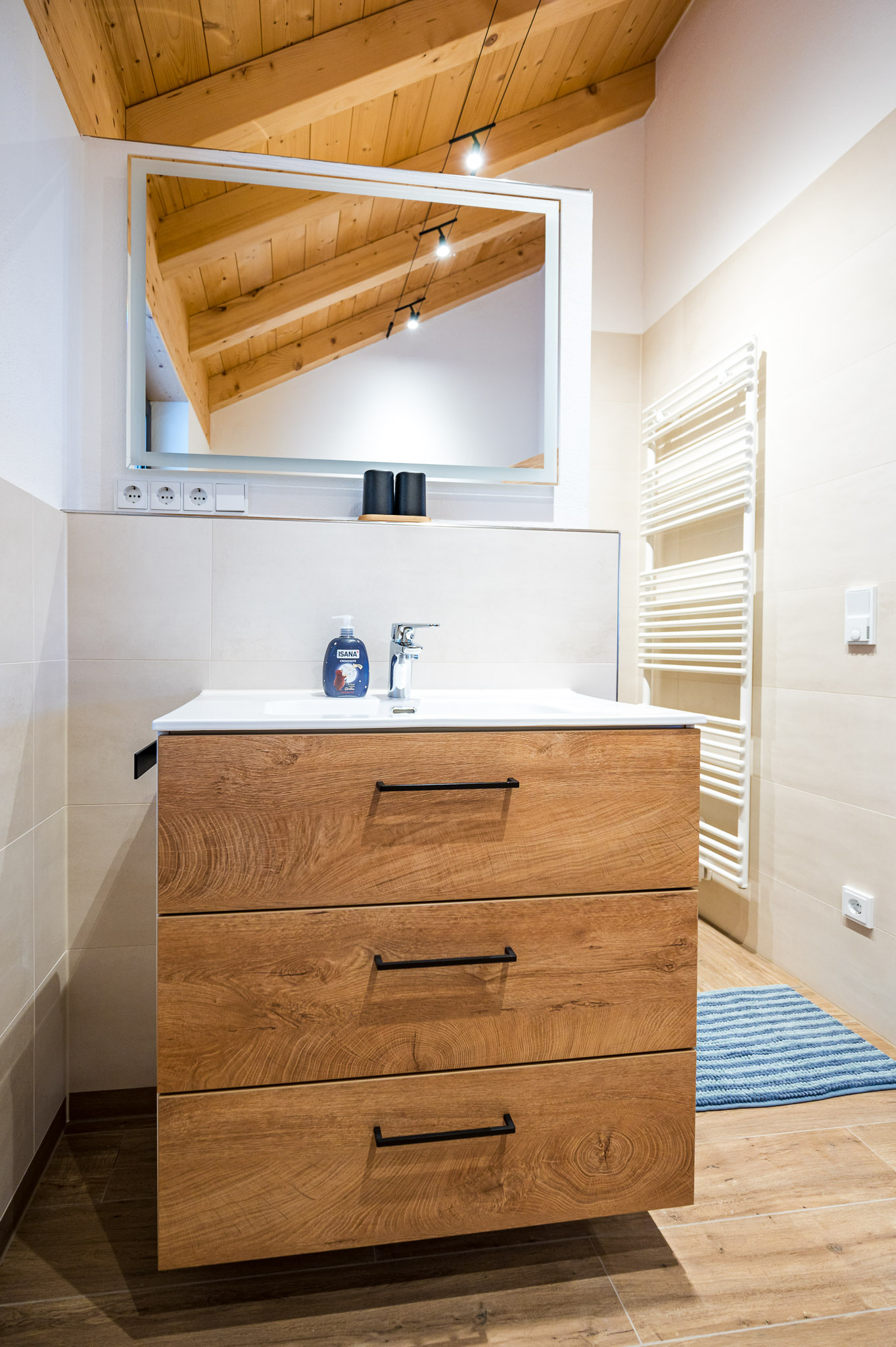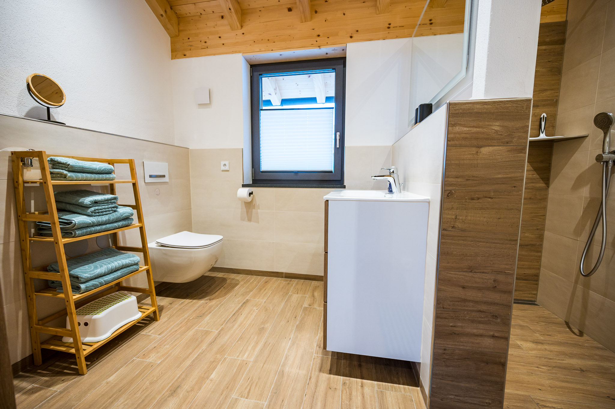 • Badezimmer: Ein modernes Bad mit Regenwalddusche, Waschbecken, Handtuchtrockner und WC.