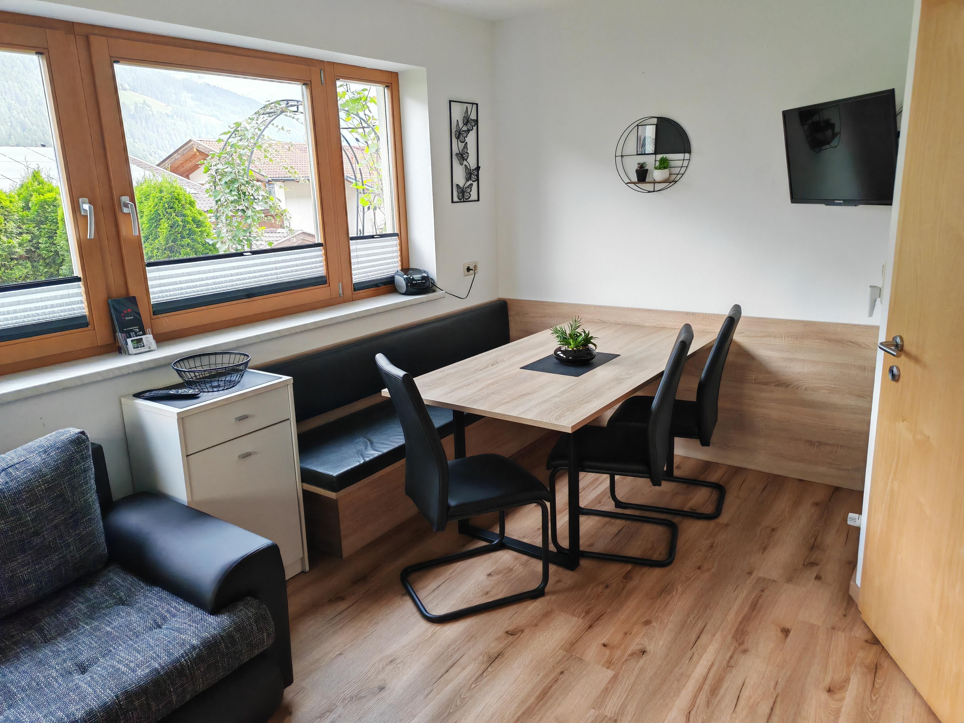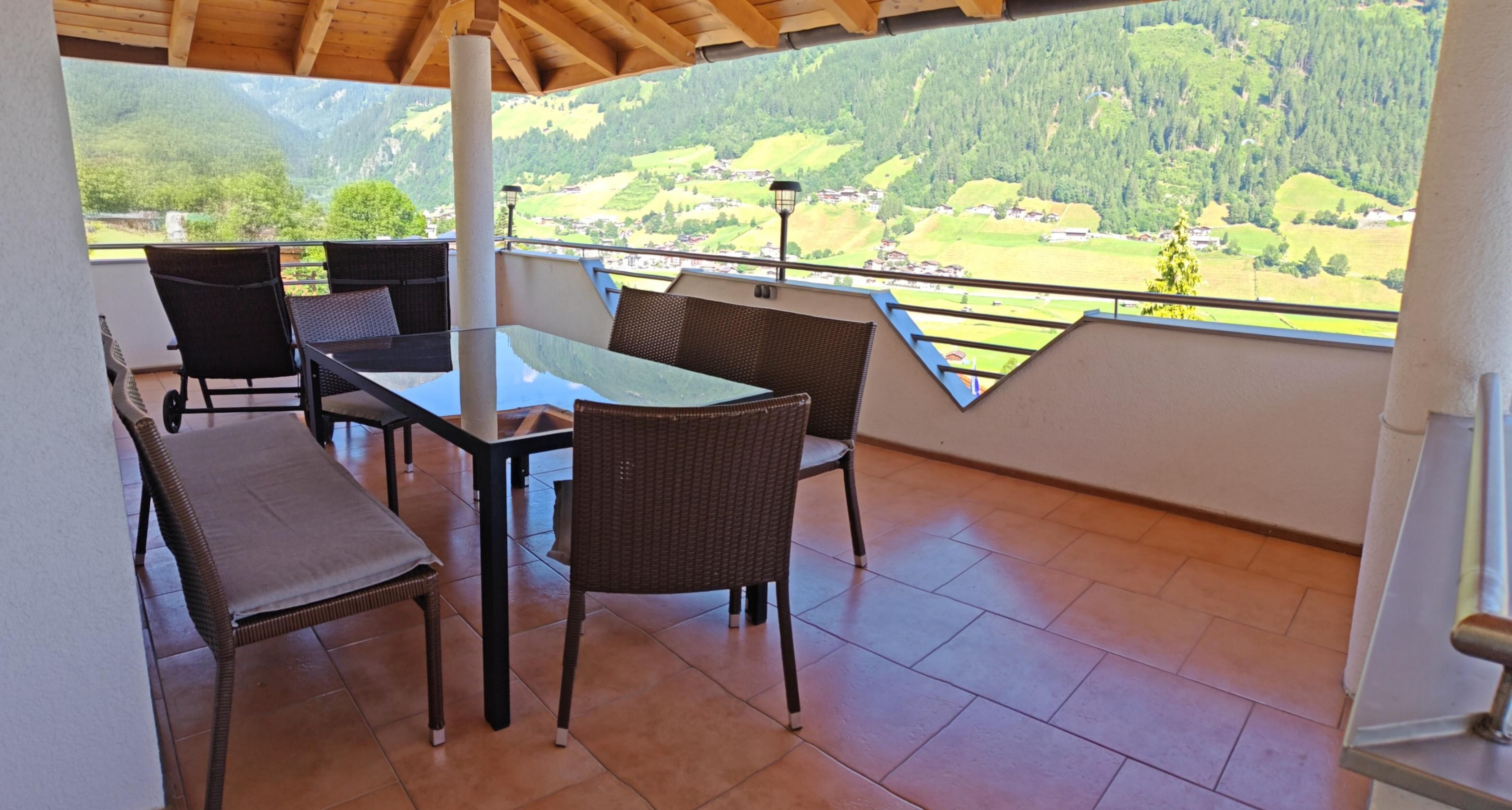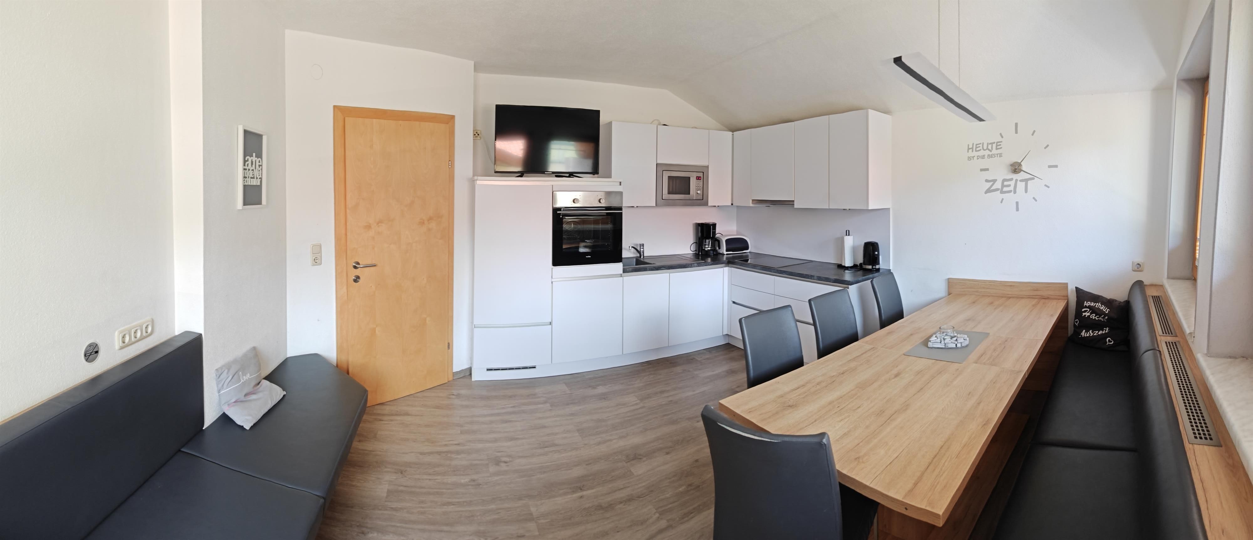 Dusche / WC , SAT-TV, Balkon und Verbindungstüre ins kleine Nebenzimmer mit Zustellbett oder Gitterbett, einem Dreibettzimmer mit SAT-TV und Balkon, ein weiterer Waschraum mit Badewanne und Dusche und ein WC , eine geräumige Wohnküche mit Geschirrspüler, Herd mit Backrohr, Mikrowelle, Gefrierfach, Toaster, Eierkocher und Kaffeemaschine sowie SAT-TV, gemütliches Sofa , große Essecke und breitem Balkon. Die Wohnung ist im 2. Stock und verfügt auserdem über eine 25 qm große Dachterrasse mit gemütlichen Gartenmöbeln und Sonnenliegen. Von dort aus genießen Sie einen herrlichen Panoramablick über das ganze Tal.