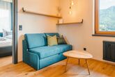 Ferienwohnung (42 m²), für 2-4 Personen, Grünterrasse (im 1. Stock), Schlafraum, Wohnschlafraum mit ausziehbarer Couch, Küche, Dusche/WC getrennt.