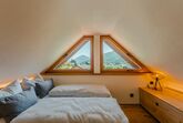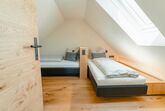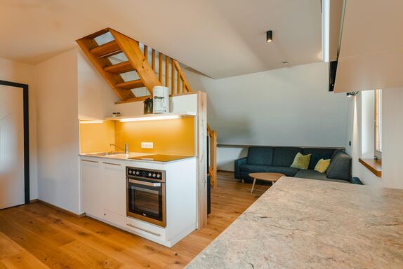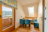 Ferienwohnung (60 m²), für 2-4 Personen, Balkon mit Seeblick, zwei über eine Stiege erreichbare Galerie-Schlafräume, Wohnraum, Küche, Dusche/ WC getrennt.