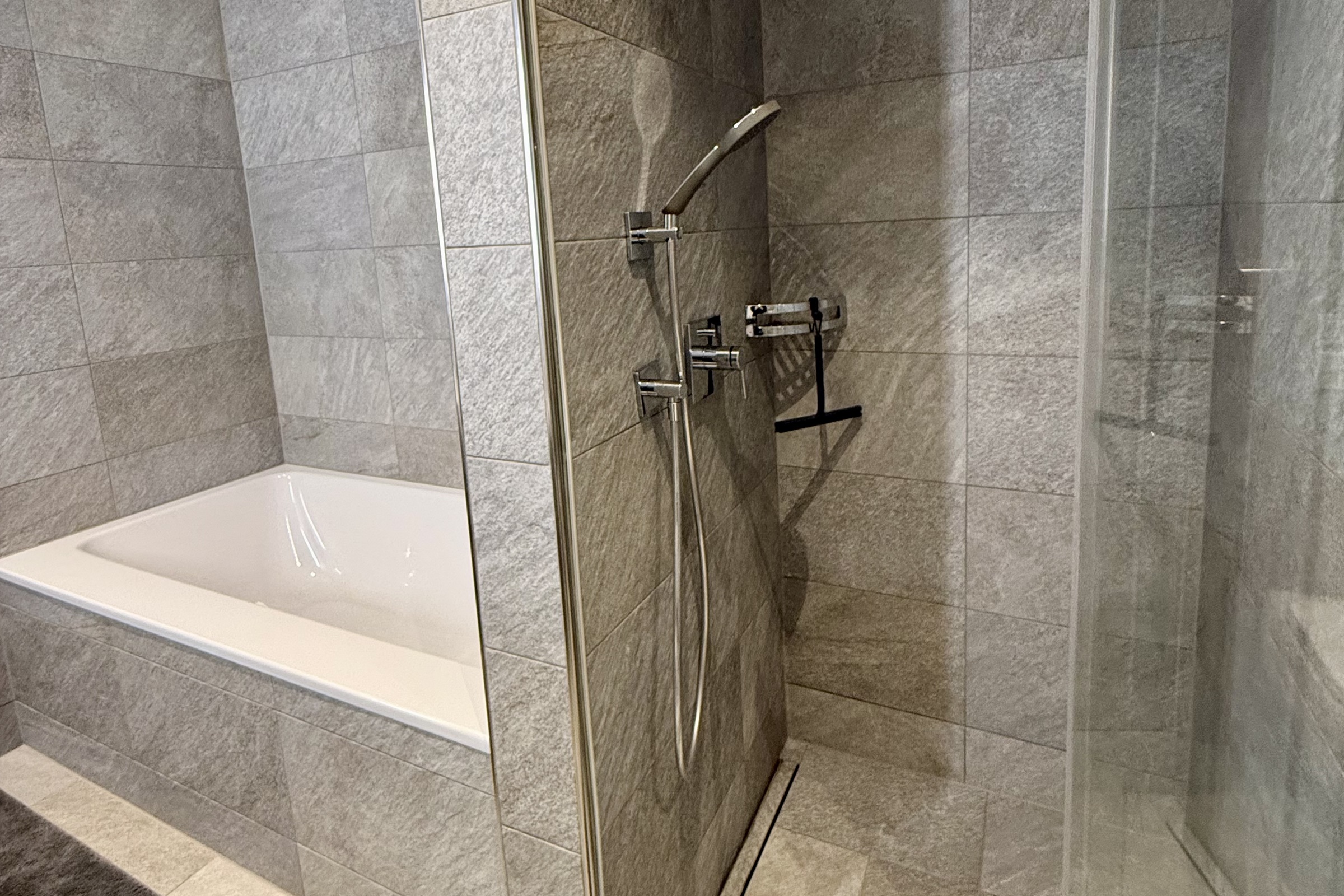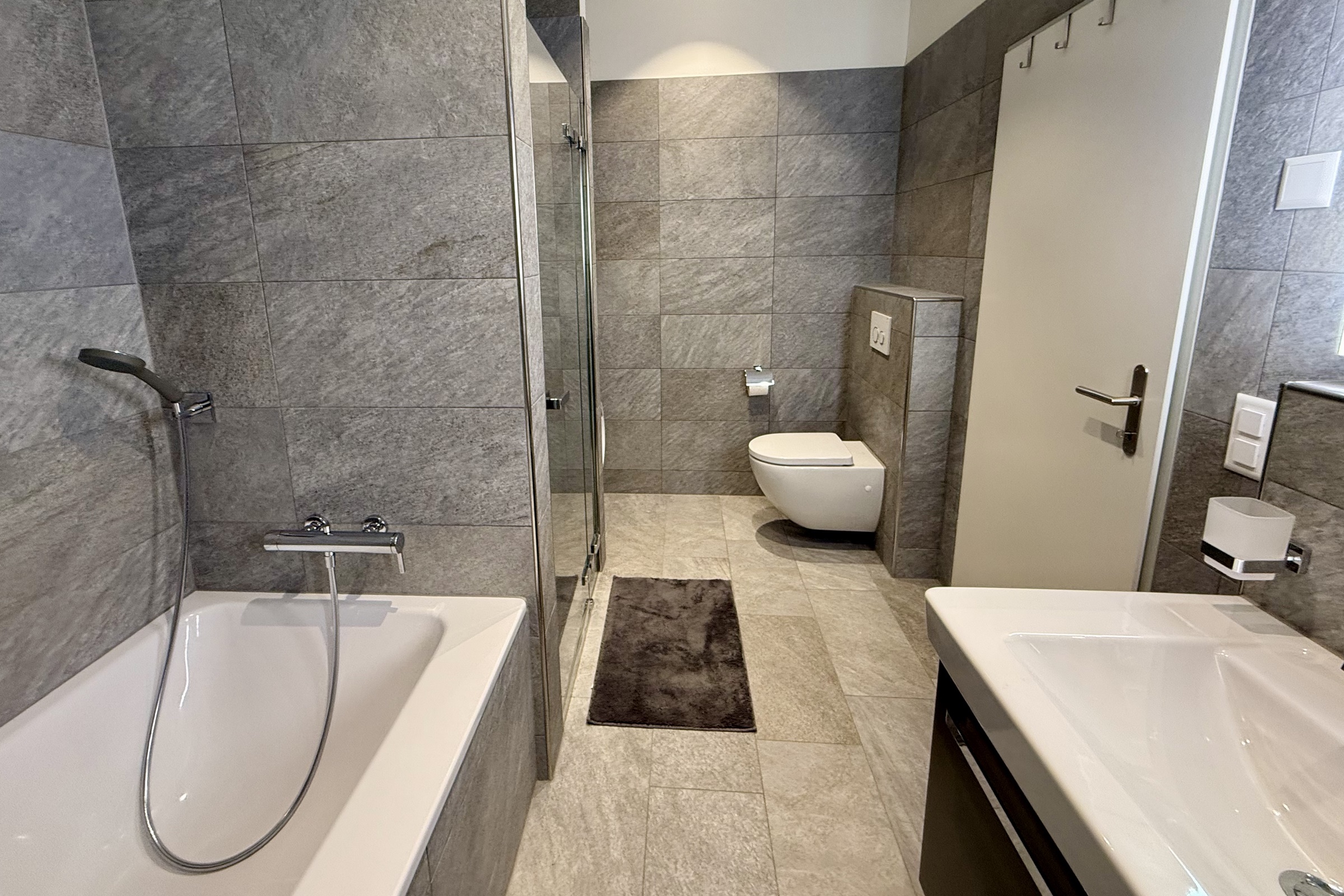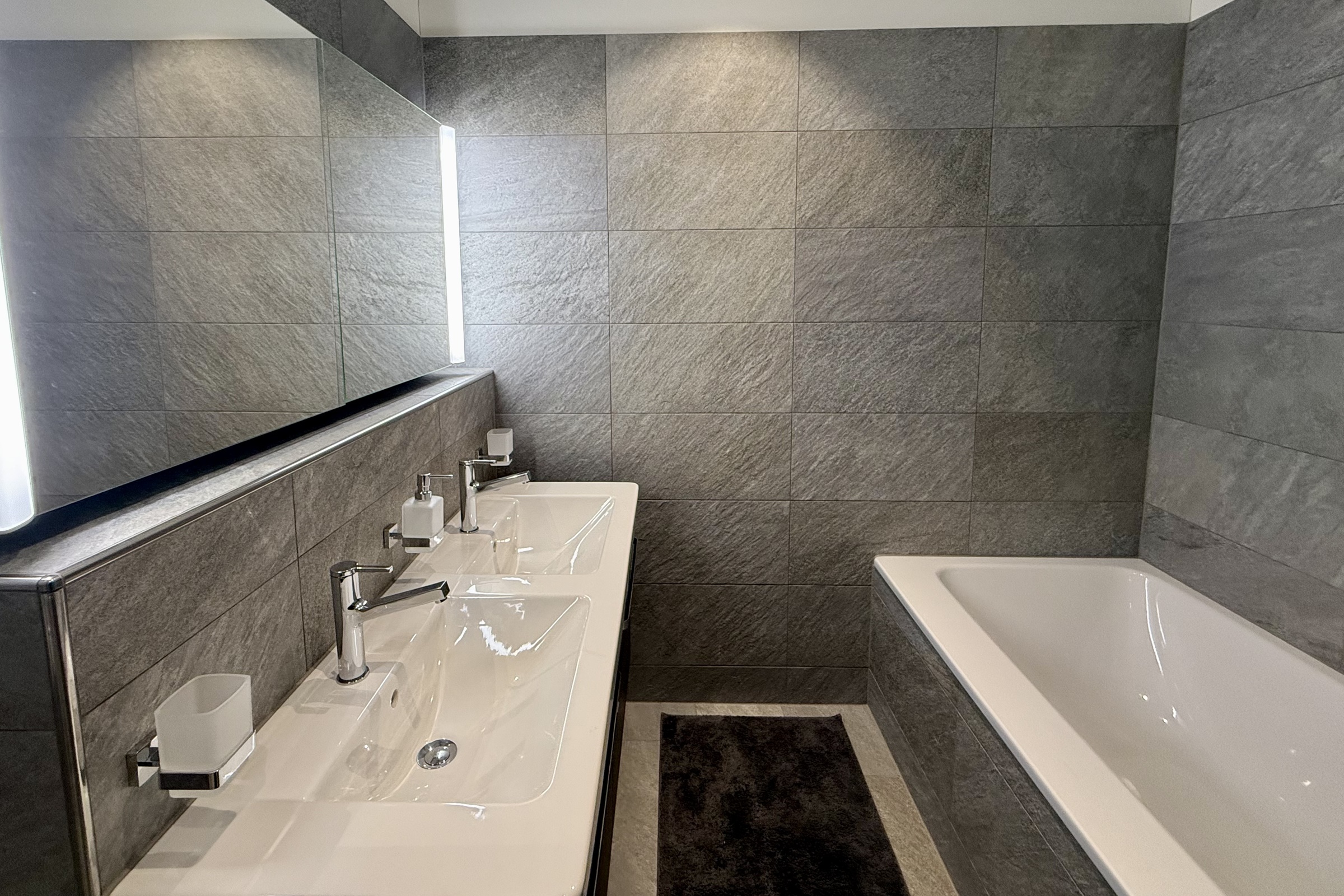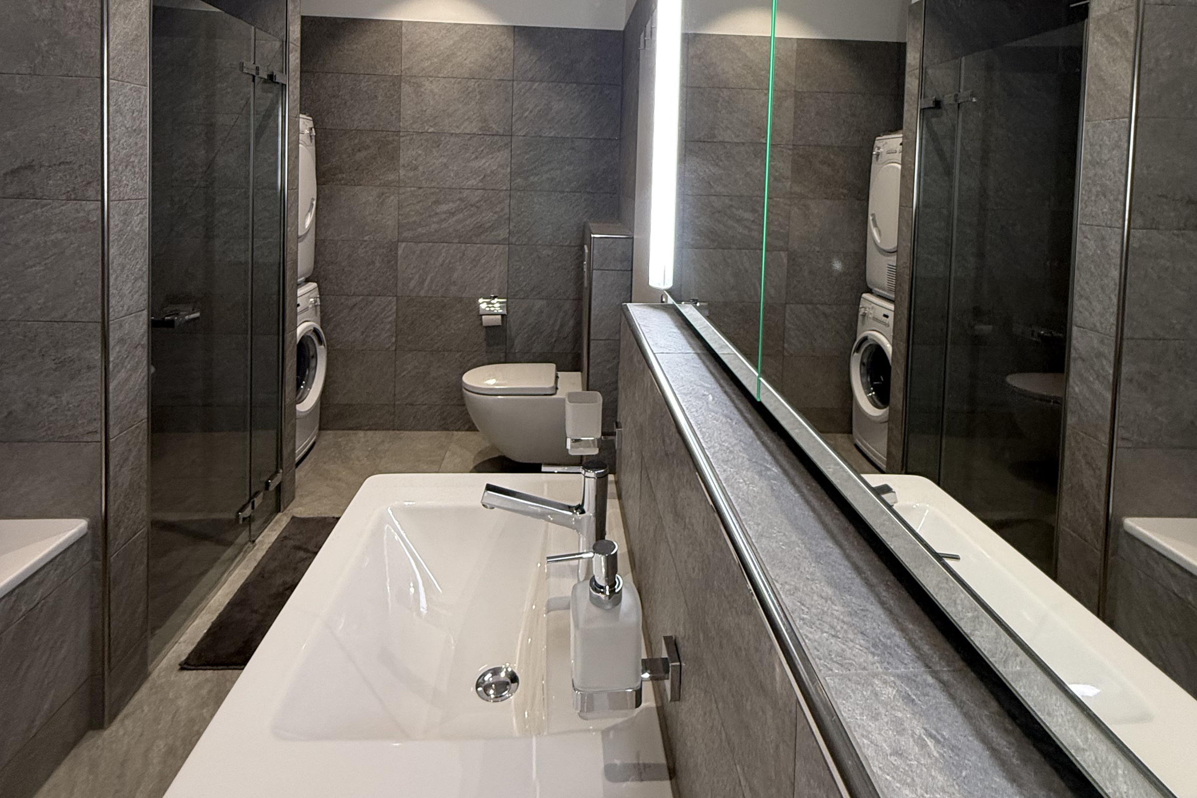 Das Badezimmer verfügt über ein Doppel-Lavabo, eine Badewanne und eine separate Dusche. Ergänzt wird es durch eine Waschmaschine und einen Trockner. Wohnzimmer