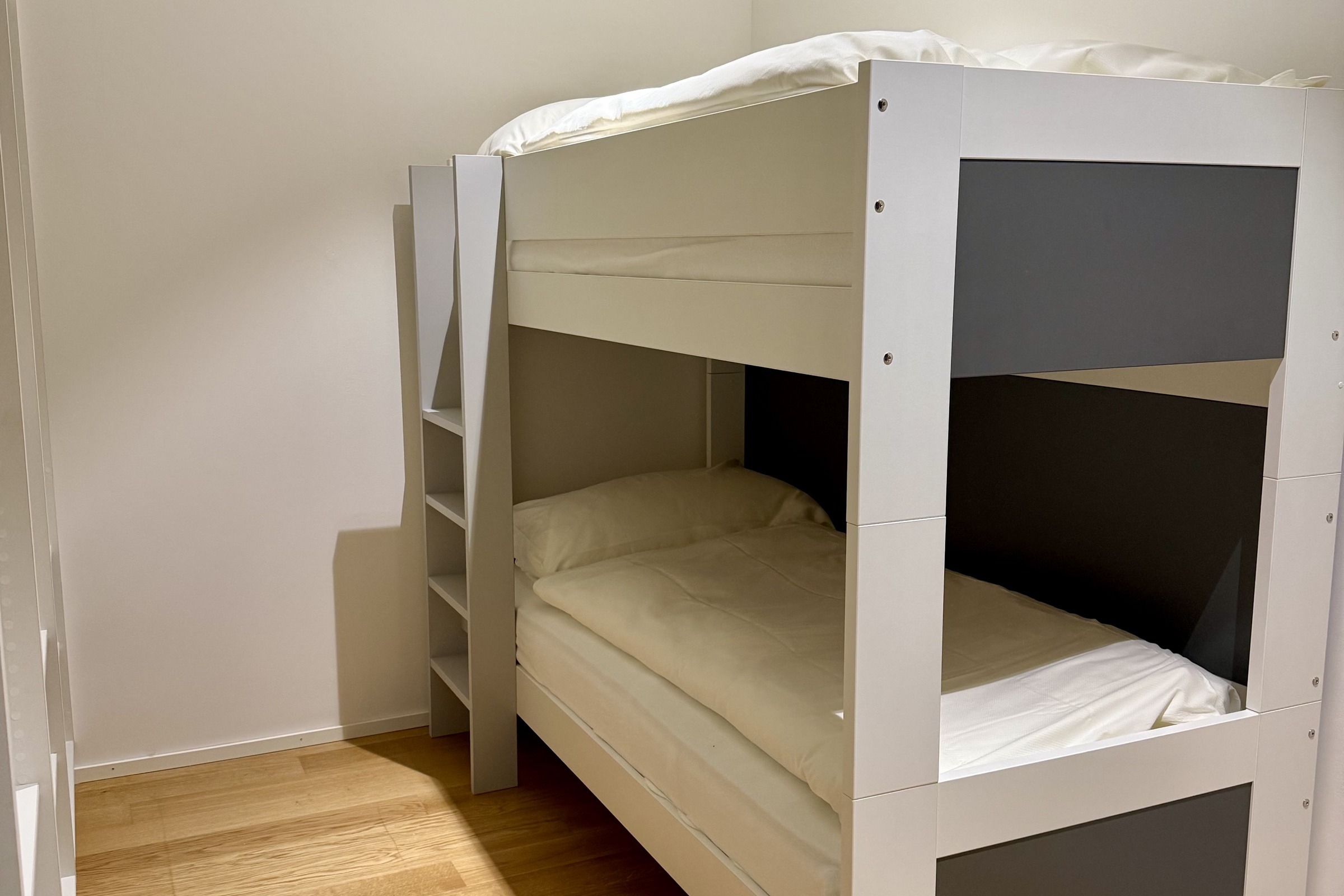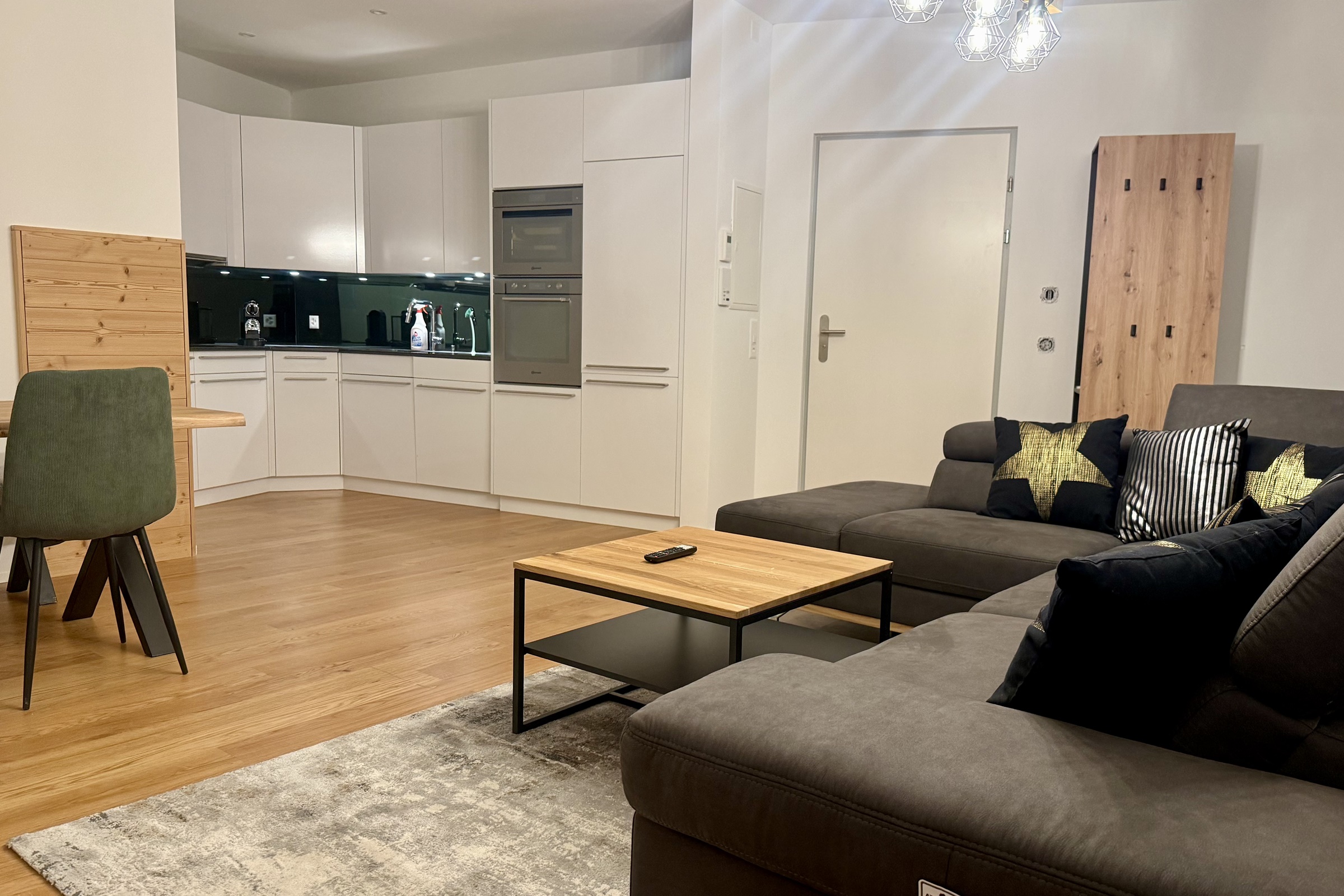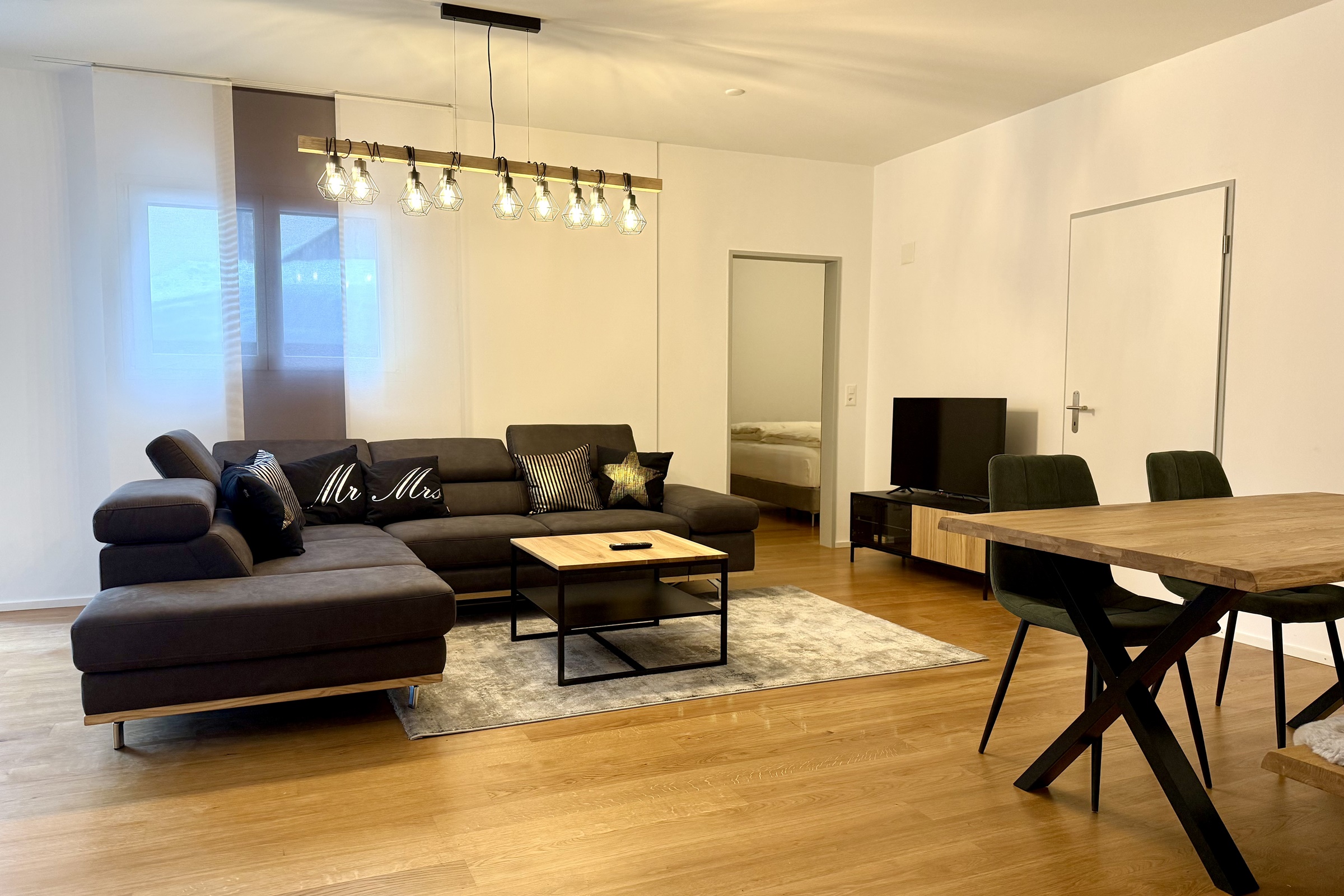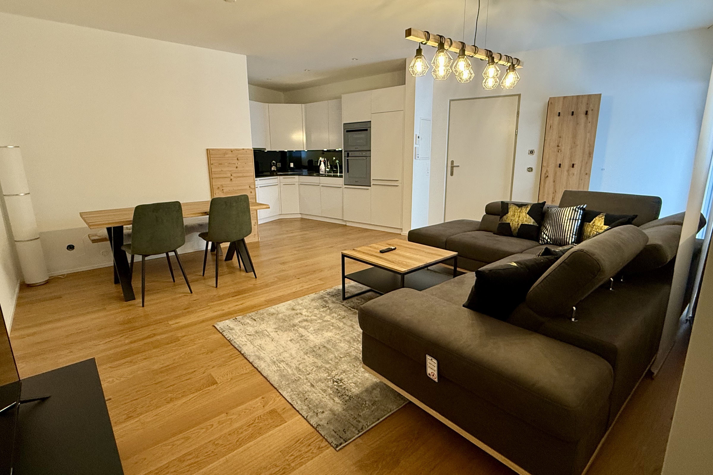 ein Schlafzimmer mit Trennwand und Hochbett ein Badezimmer mit Dusche, Badewanne, WC und Doppel-Lavabo ein offenes Wohn-/Esszimmer eine offene und gut ausgestattete Küche ein Sofa, das als Schlafplatz genutzt werden kann ein Aussenparkplatz Inneneinrichtung & Technik Die Wohnung ist gepflegt und gemütlich eingerichtet. WLAN steht kostenlos in der ganzen Wohnung zur Verfügung. Ebenfalls ist ein Smart-TV mit DVD-Player verfügbar.