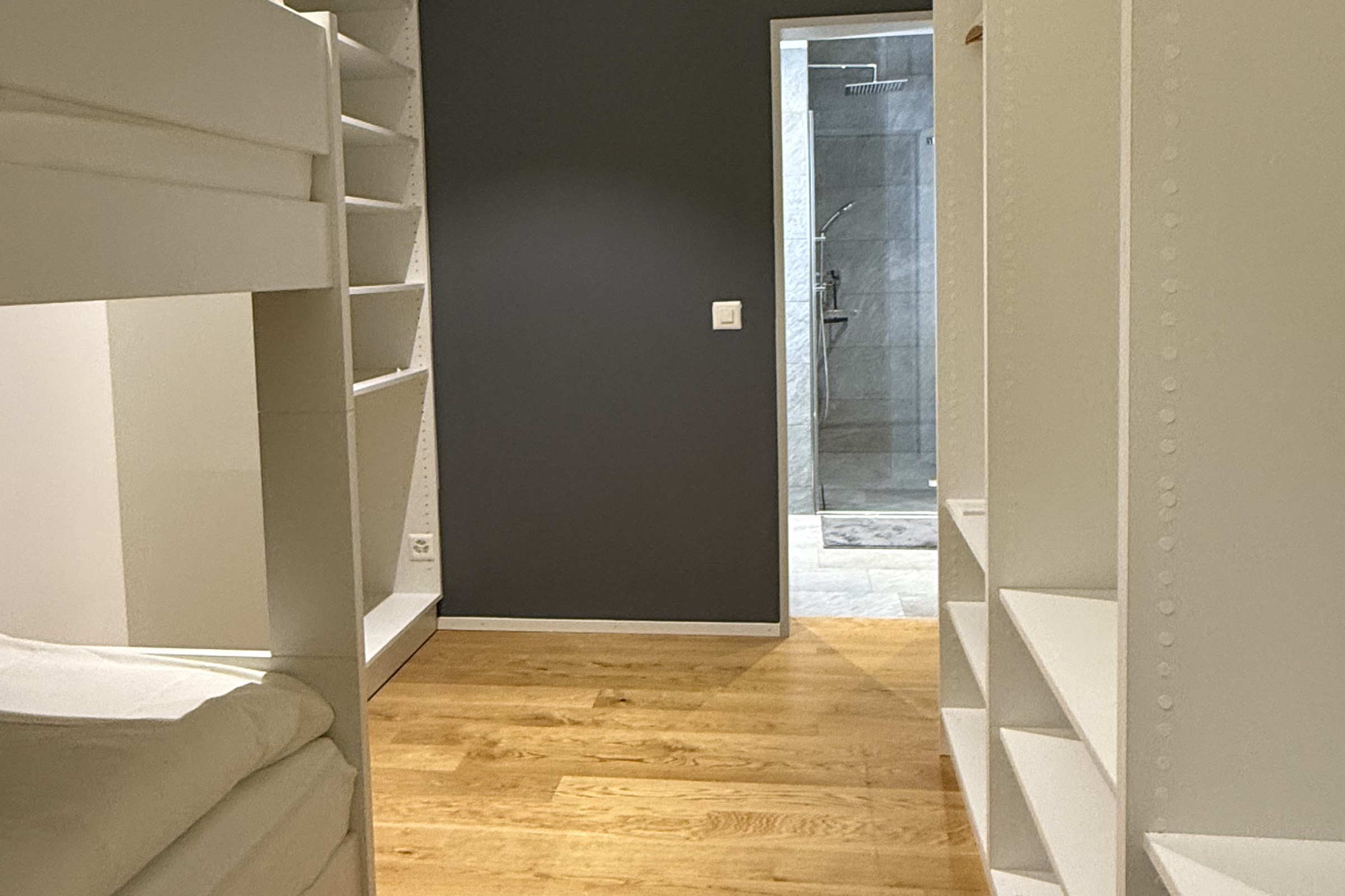 Das Schlafzimmer ist mit einem luxuriösen Doppelbett ausgestattet. Eine geschickt integrierte, offene Tablar-Wand trennt den Raum dezent und